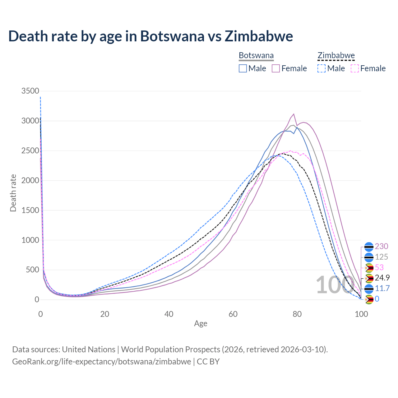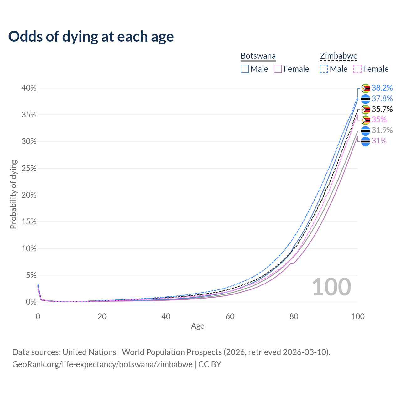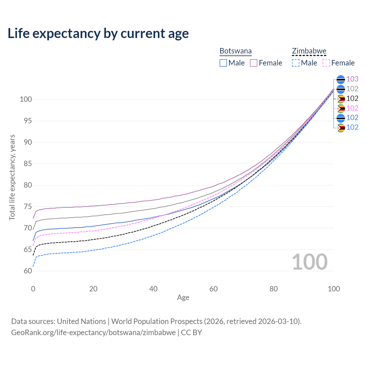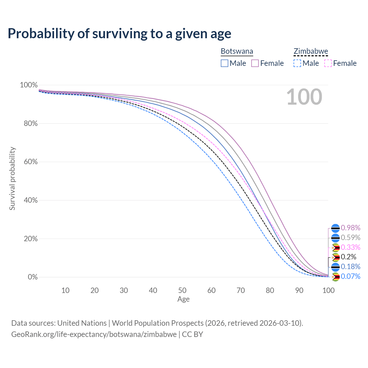 This life expectancy calculator shows the odds of living to 100, 95, 90, and below based on current age for both males and females in Botswana and Zimbabwe, along with mean and median age of death. The calculations are based on the 2026 life tables (actuarial tables) from the UN World Population Prospects.