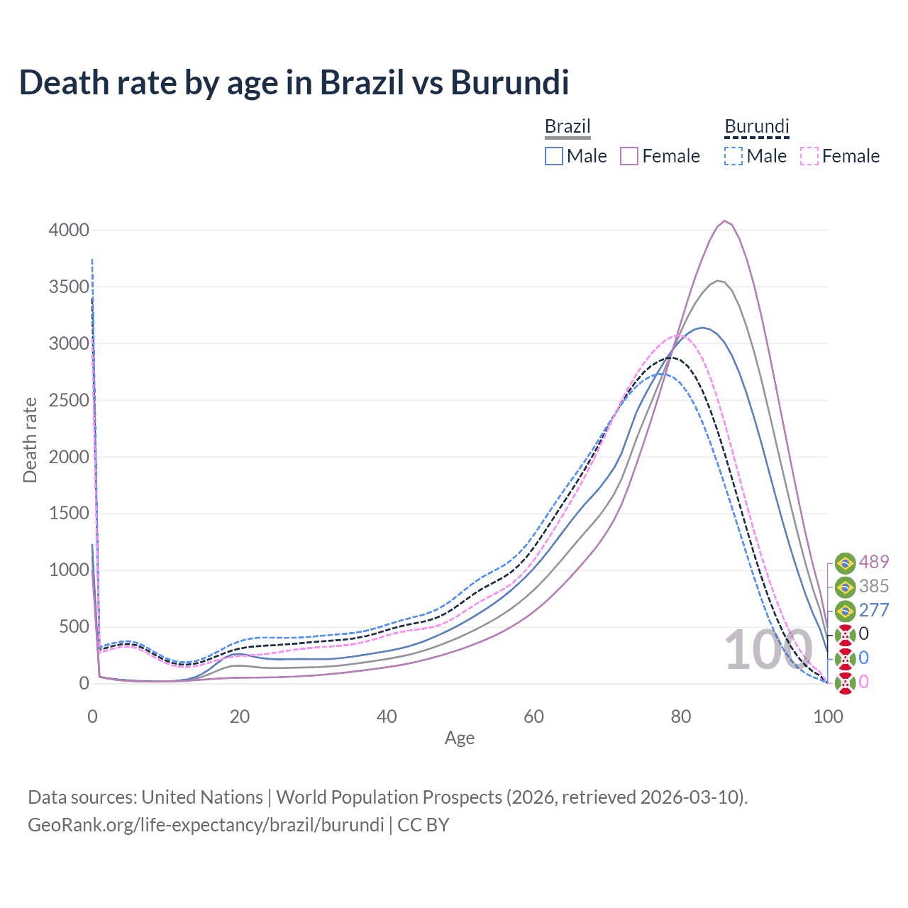 In Brazil, the most common age of death is 85, compared to 0 in Burundi. The median age of death is 80.8 in Brazil and 71.6 in Burundi, meaning only half of each cohort is expected to live past that age.