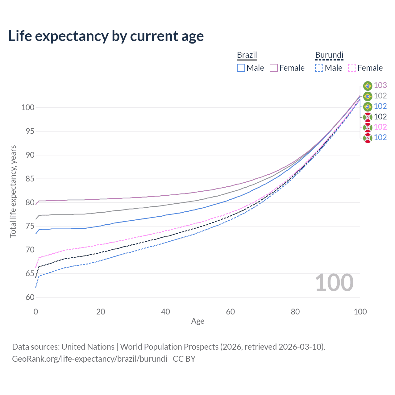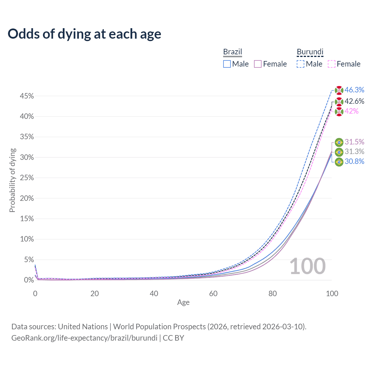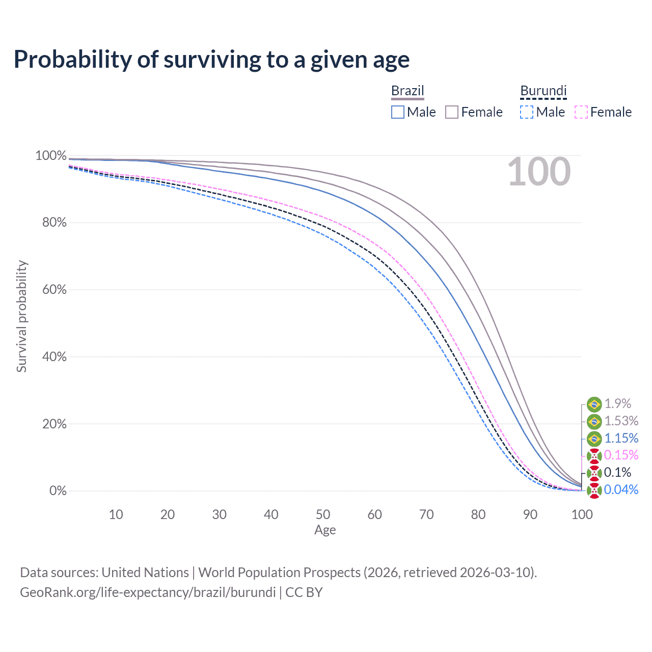 This life expectancy calculator shows the odds of living to 100, 95, 90, and below based on current age for both males and females in Brazil and Burundi, along with mean and median age of death. The calculations are based on the 2026 life tables (actuarial tables) from the UN World Population Prospects.
