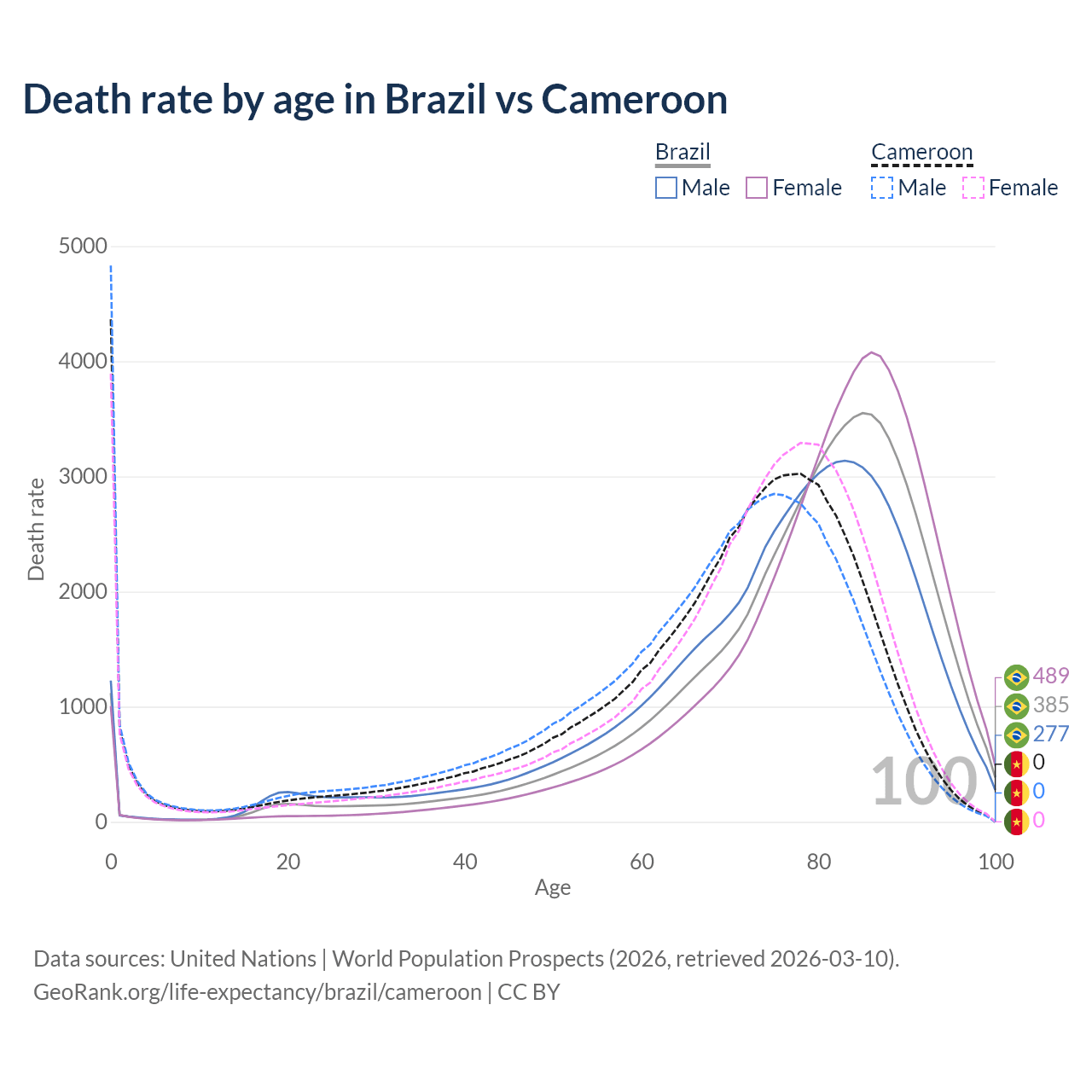 In Brazil, the most common age of death is 85, compared to 0 in Cameroon. The median age of death is 80.8 in Brazil and 71.6 in Cameroon, meaning only half of each cohort is expected to live past that age.
