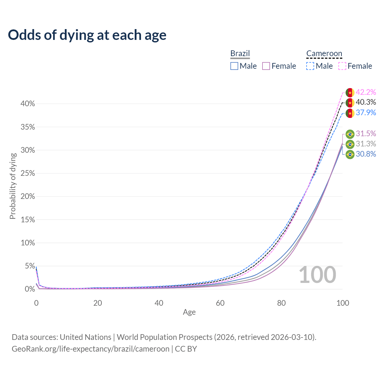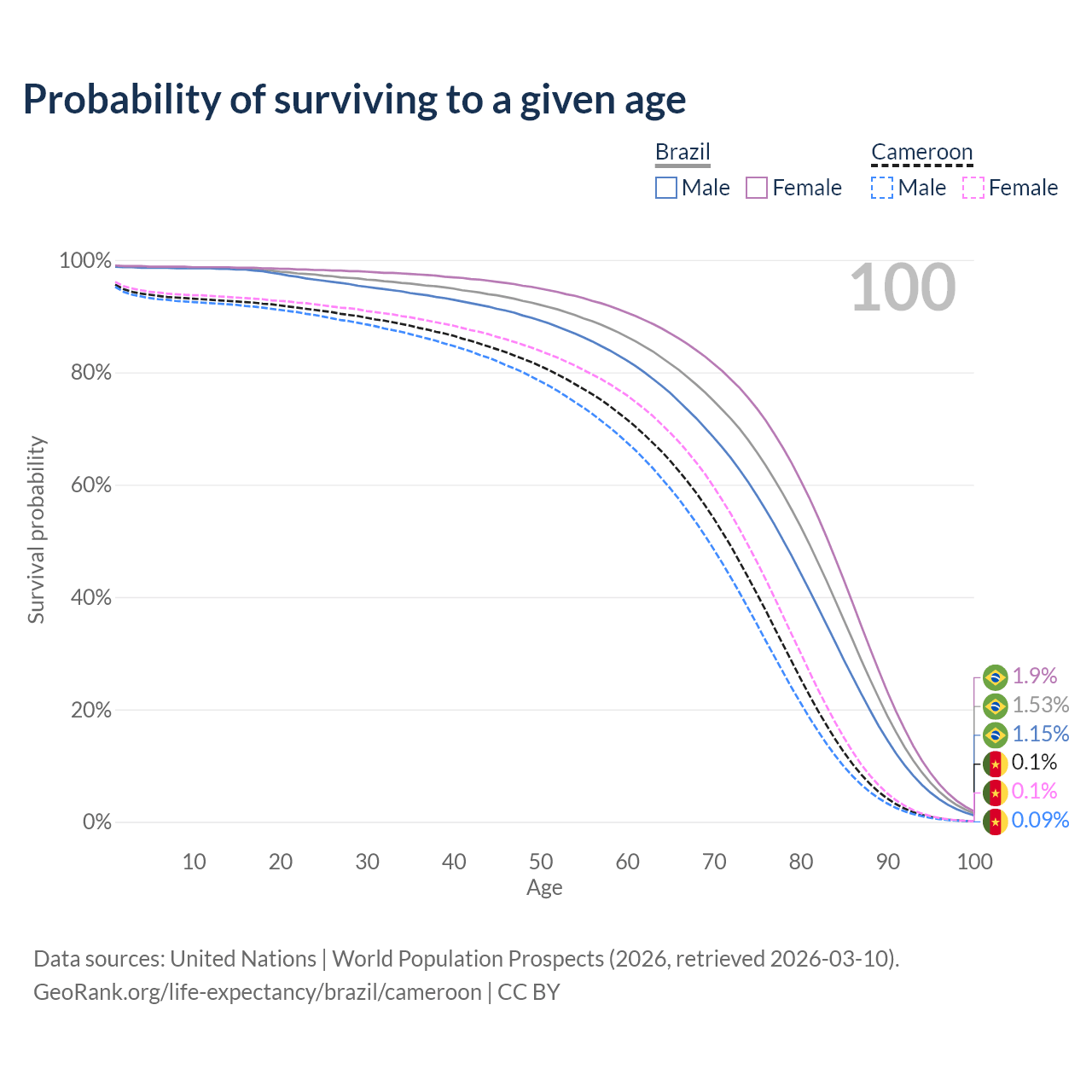 This life expectancy calculator shows the odds of living to 100, 95, 90, and below based on current age for both males and females in Brazil and Cameroon, along with mean and median age of death. The calculations are based on the 2026 life tables (actuarial tables) from the UN World Population Prospects.