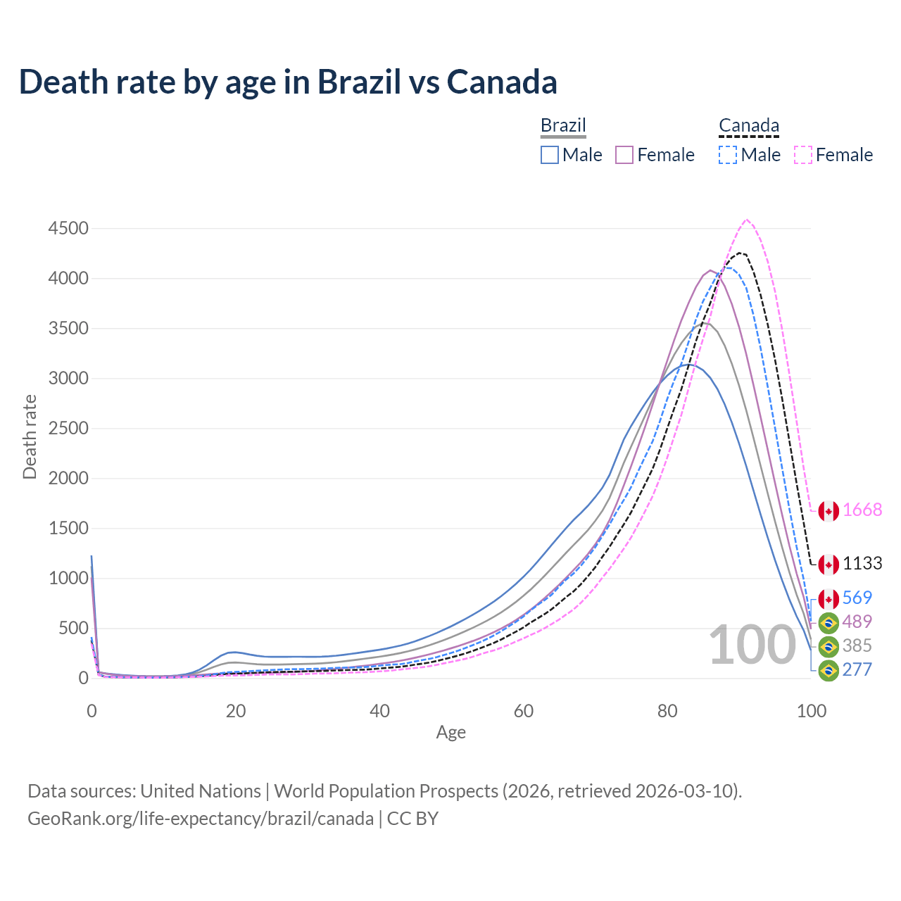 In Brazil, the most common age of death is 85, compared to 90 in Canada. The median age of death is 80.8 in Brazil and 86.4 in Canada, meaning only half of each cohort is expected to live past that age.