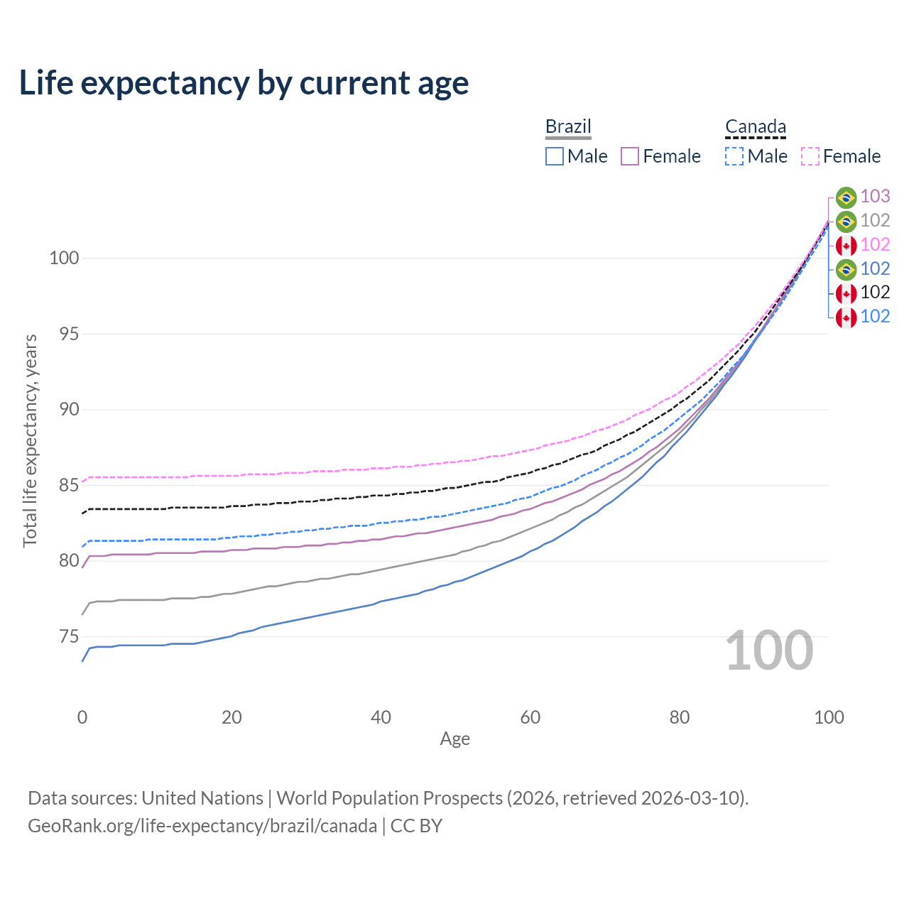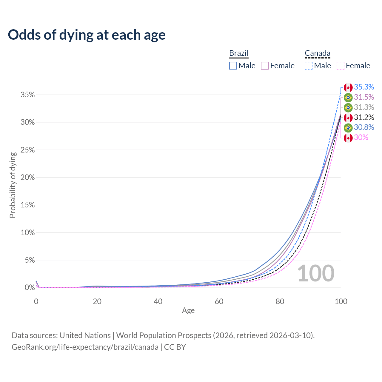This life expectancy calculator shows the odds of living to 100, 95, 90, and below based on current age for both males and females in Brazil and Canada, along with mean and median age of death. The calculations are based on the 2026 life tables (actuarial tables) from the UN World Population Prospects.