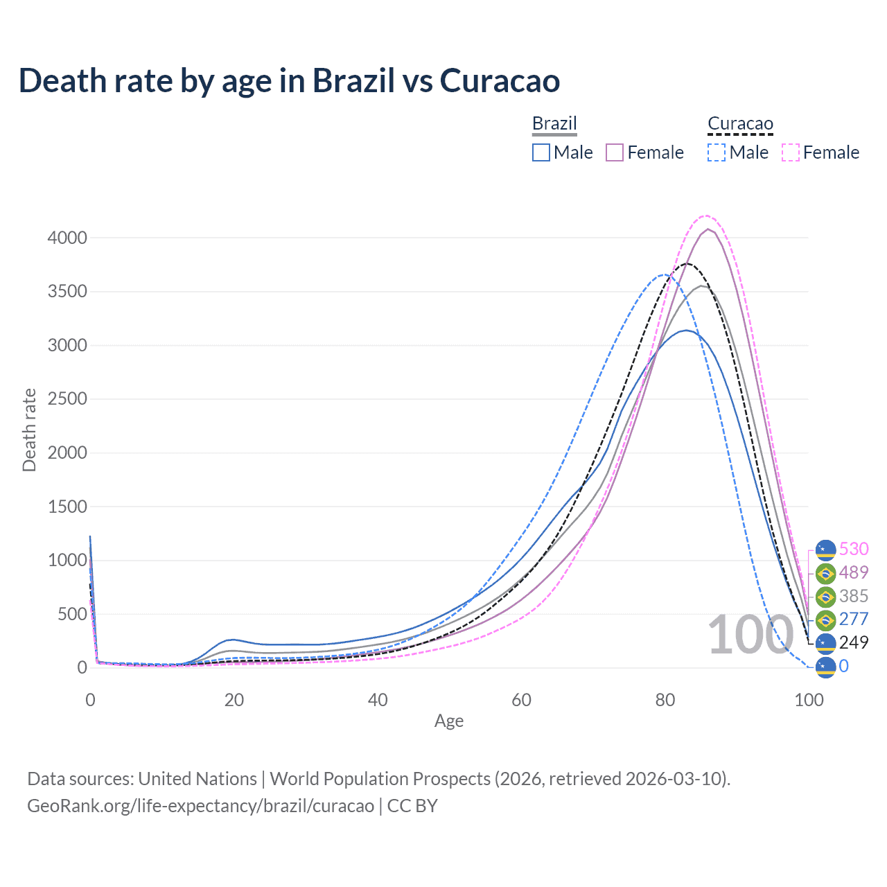 In Brazil, the most common age of death is 85, compared to 83 in Curacao. The median age of death is 80.8 in Brazil and 80.4 in Curacao, meaning only half of each cohort is expected to live past that age.