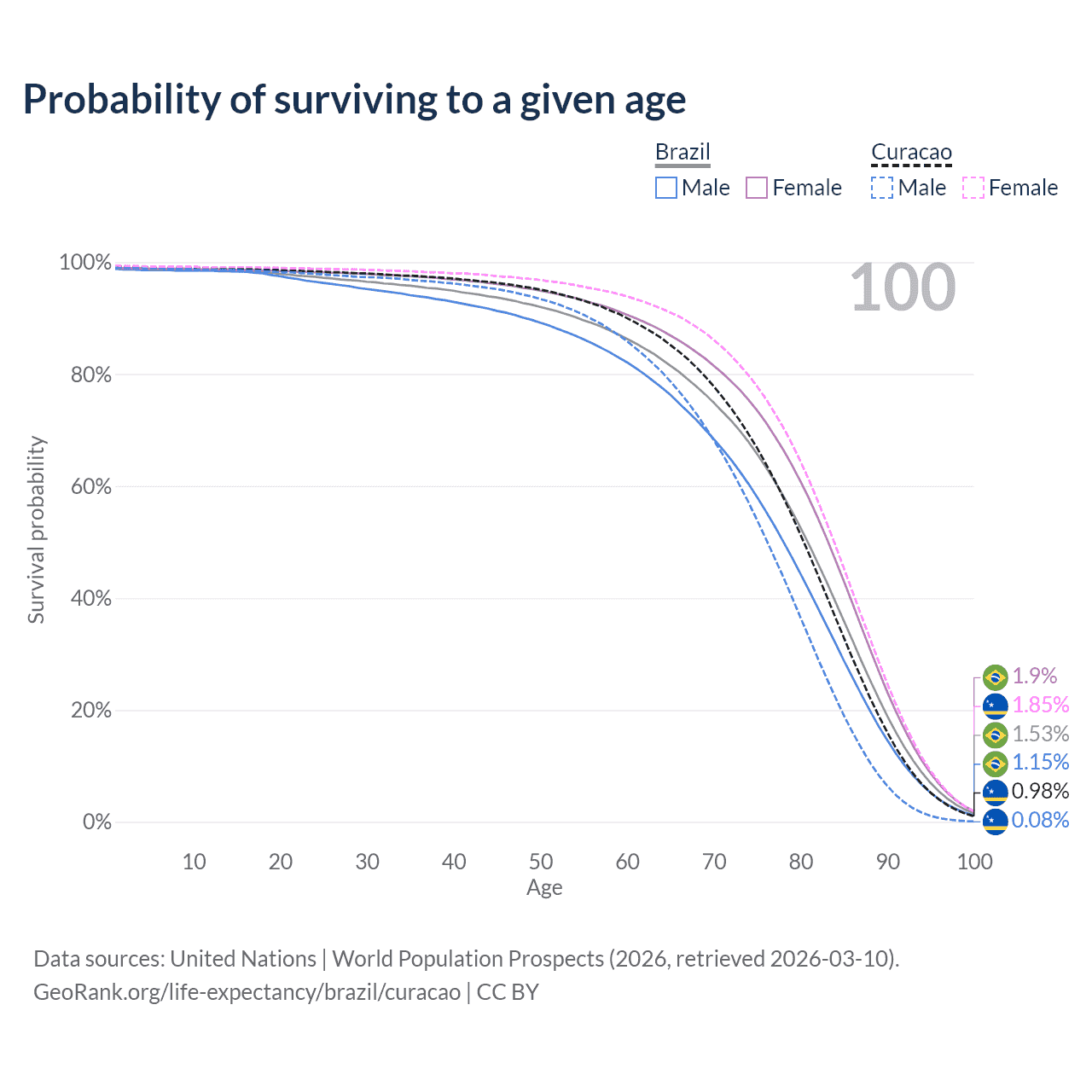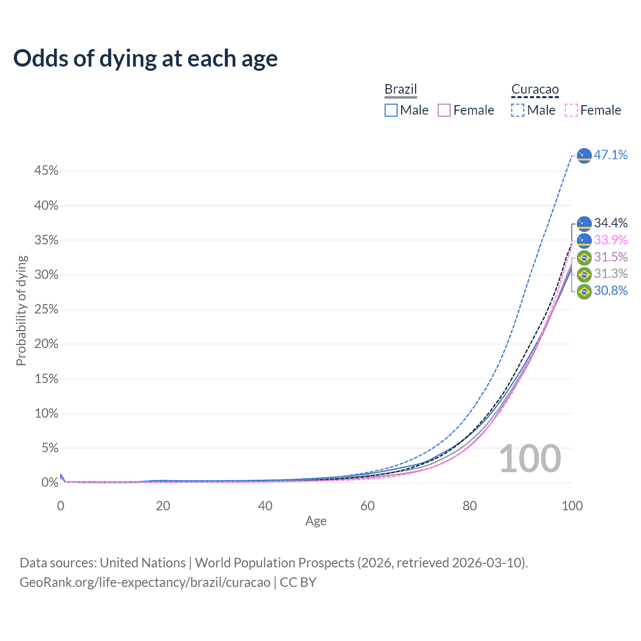 This life expectancy calculator shows the odds of living to 100, 95, 90, and below based on current age for both males and females in Brazil and Curacao, along with mean and median age of death. The calculations are based on the 2026 life tables (actuarial tables) from the UN World Population Prospects.