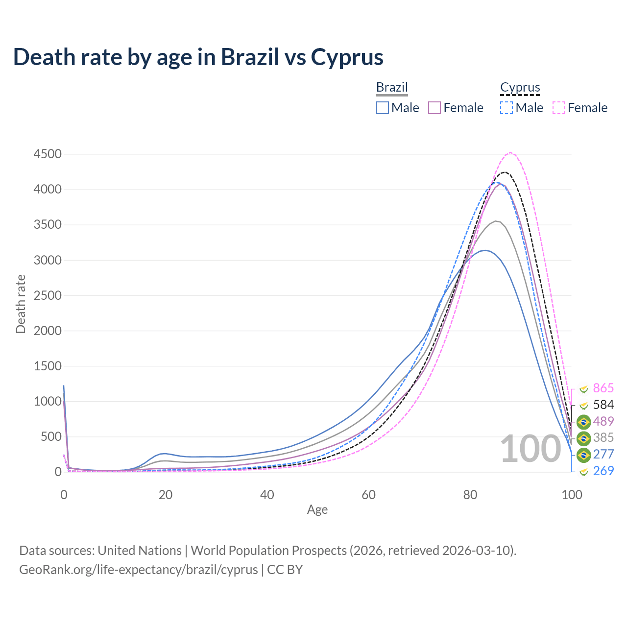 In Brazil, the most common age of death is 85, compared to 87 in Cyprus. The median age of death is 80.8 in Brazil and 84.3 in Cyprus, meaning only half of each cohort is expected to live past that age.