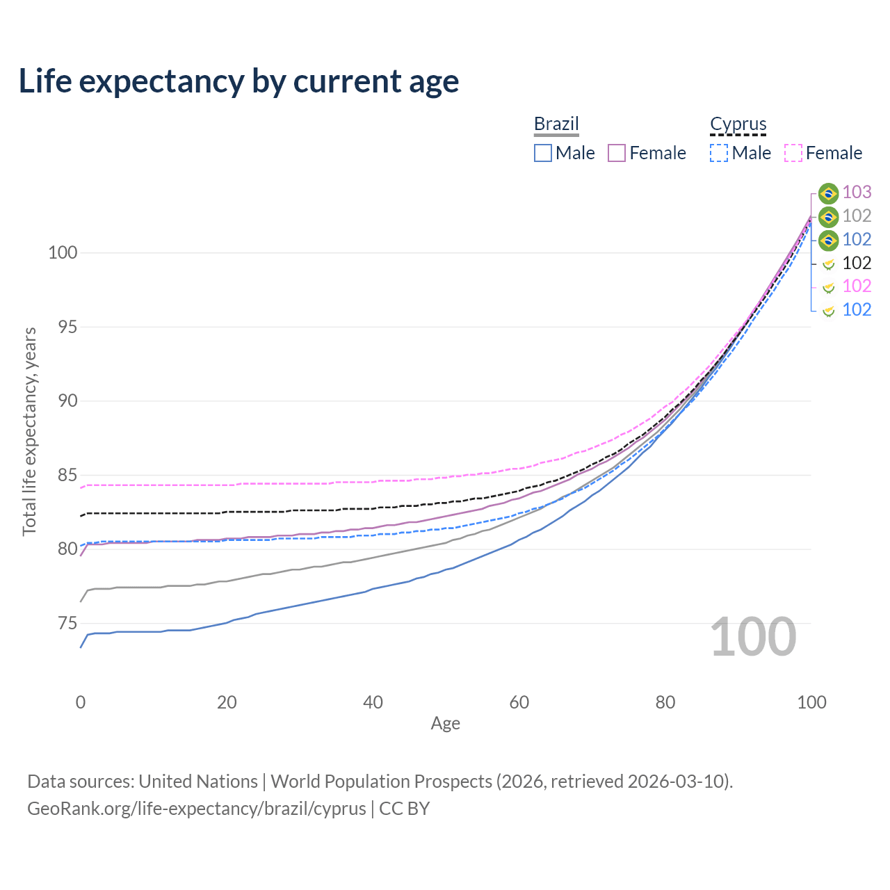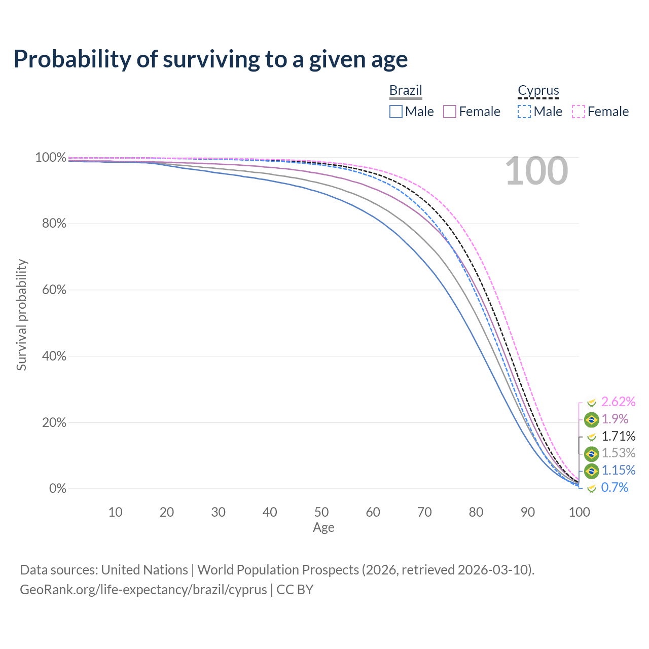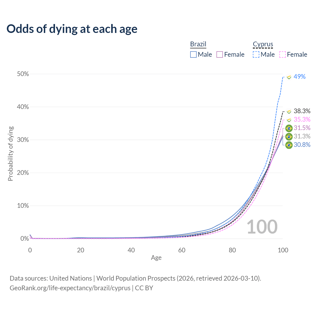 This life expectancy calculator shows the odds of living to 100, 95, 90, and below based on current age for both males and females in Brazil and Cyprus, along with mean and median age of death. The calculations are based on the 2026 life tables (actuarial tables) from the UN World Population Prospects.