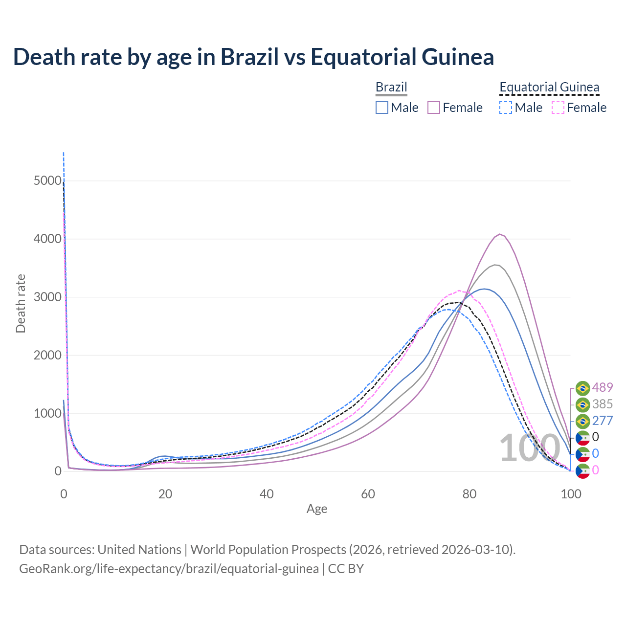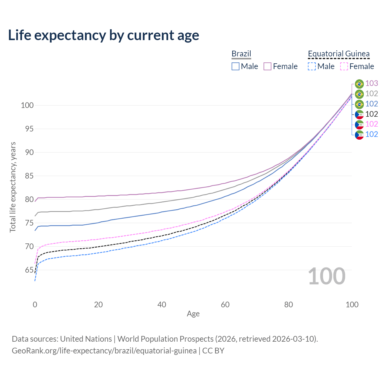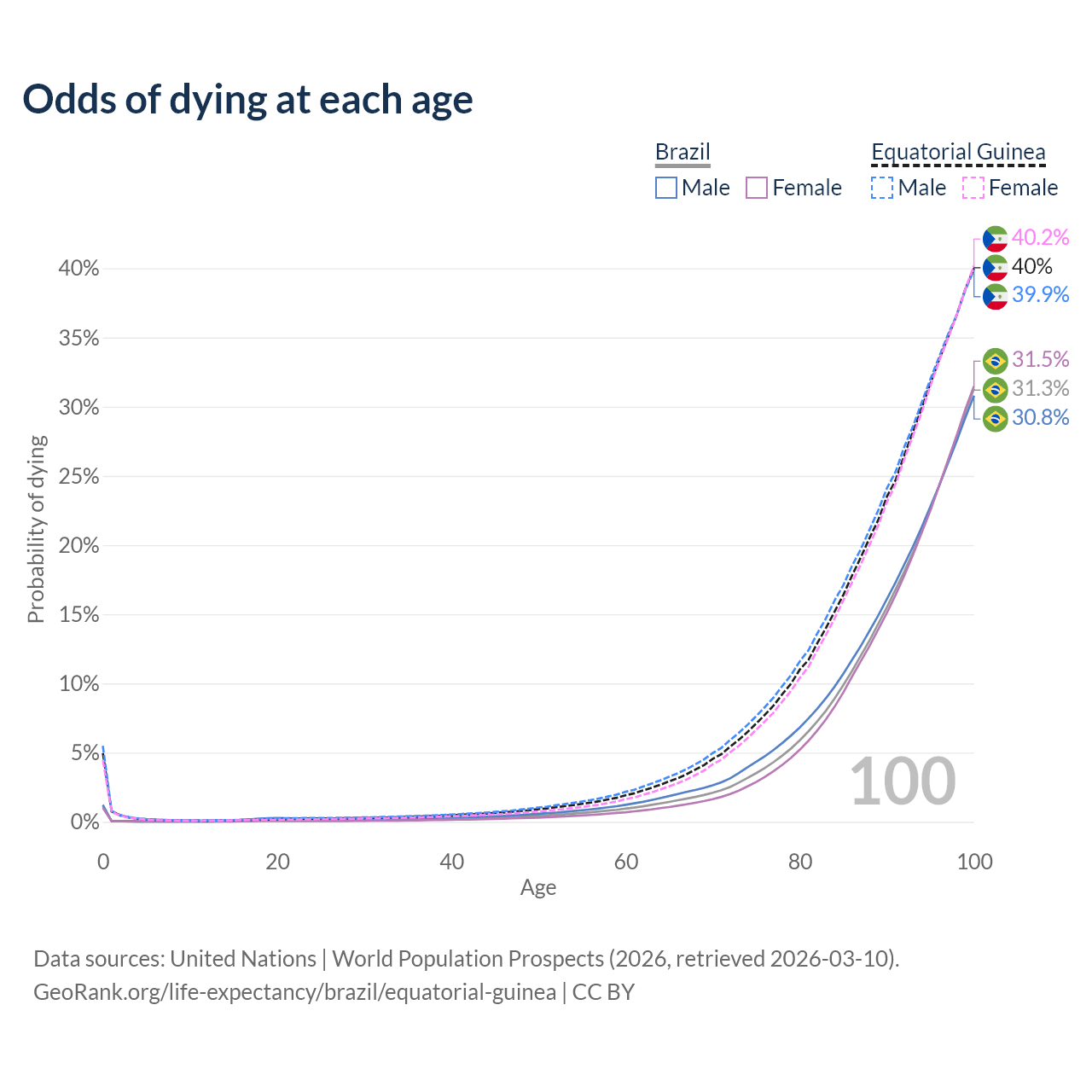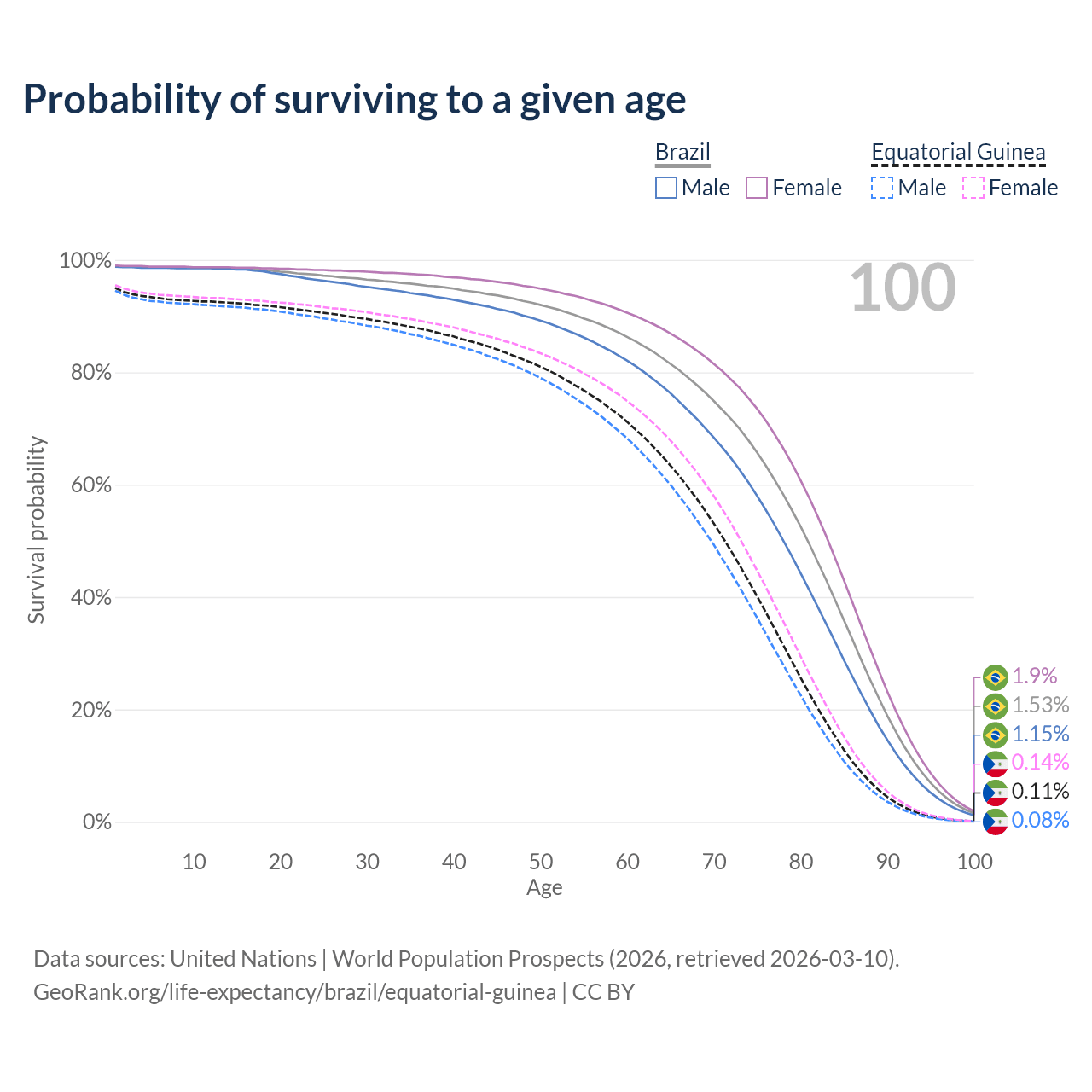 This life expectancy calculator shows the odds of living to 100, 95, 90, and below based on current age for both males and females in Brazil and Equatorial Guinea, along with mean and median age of death. The calculations are based on the 2026 life tables (actuarial tables) from the UN World Population Prospects.