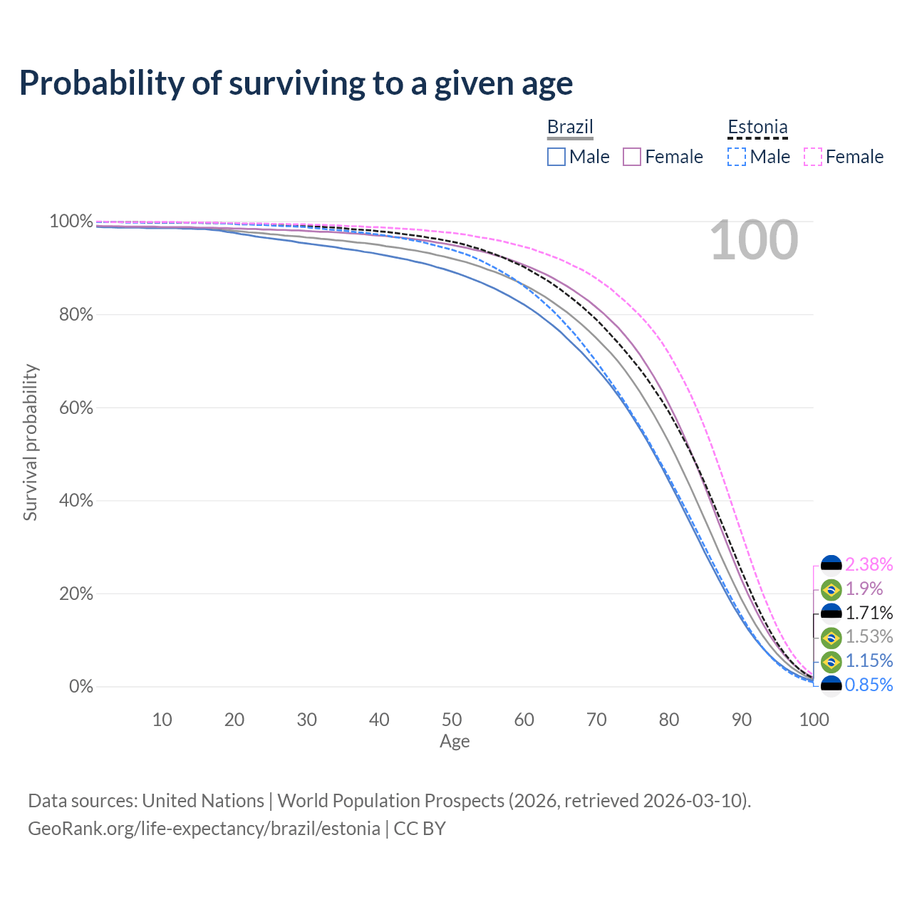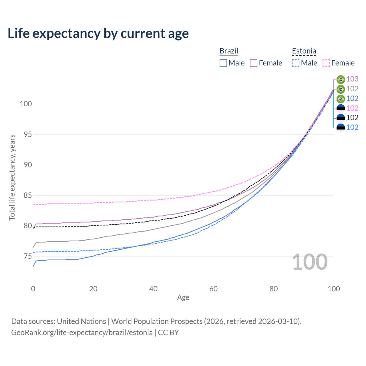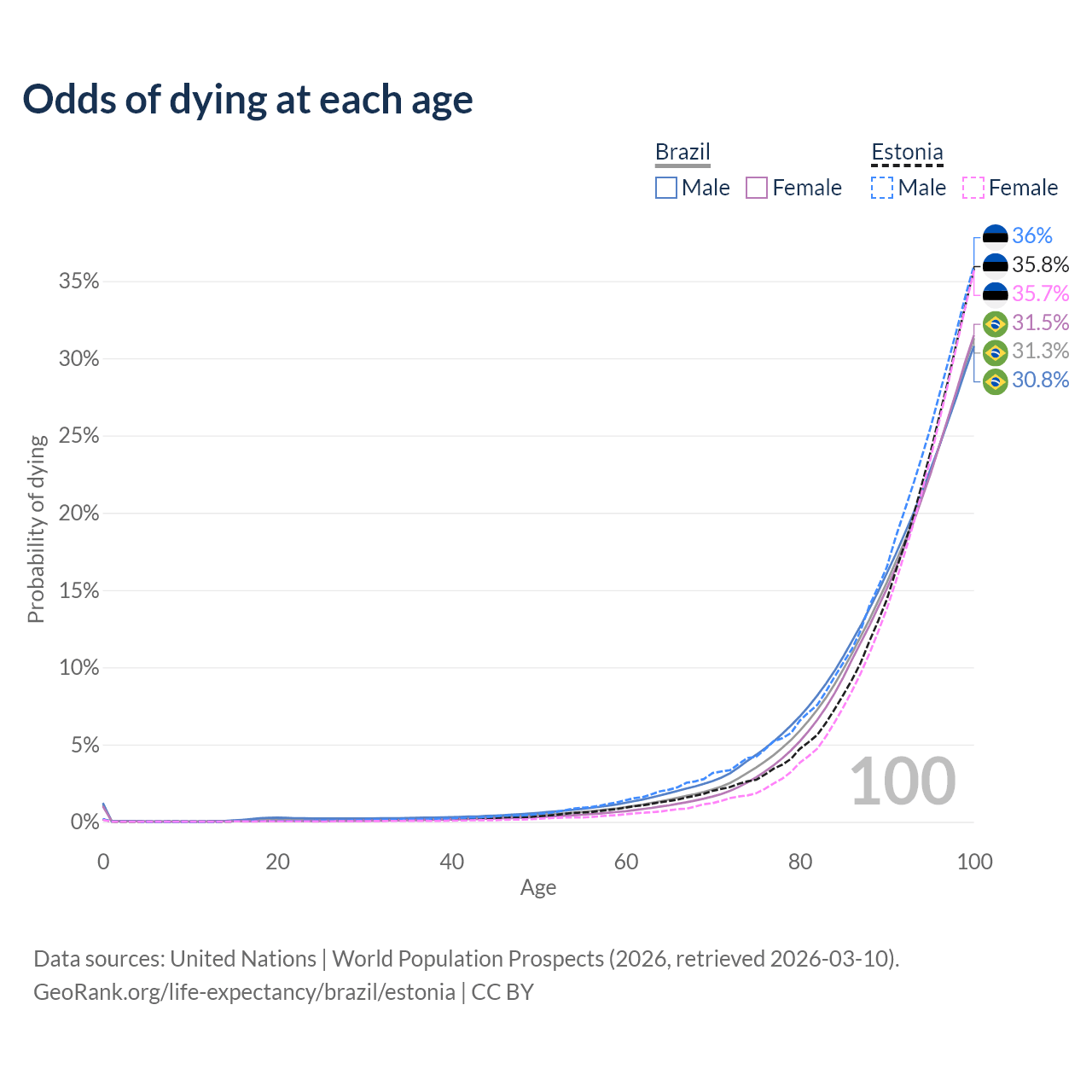 This life expectancy calculator shows the odds of living to 100, 95, 90, and below based on current age for both males and females in Brazil and Estonia, along with mean and median age of death. The calculations are based on the 2026 life tables (actuarial tables) from the UN World Population Prospects.
