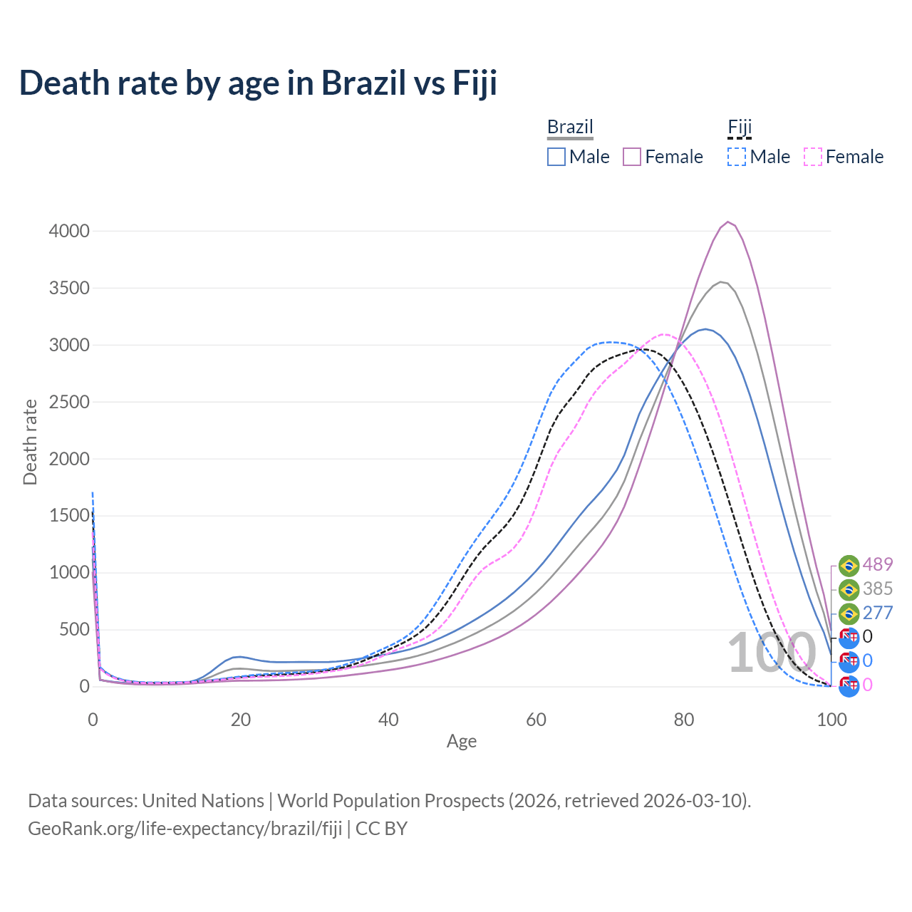 In Brazil, the most common age of death is 85, compared to 74 in Fiji. The median age of death is 80.8 in Brazil and 70.5 in Fiji, meaning only half of each cohort is expected to live past that age.