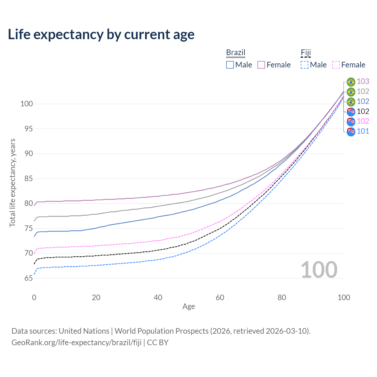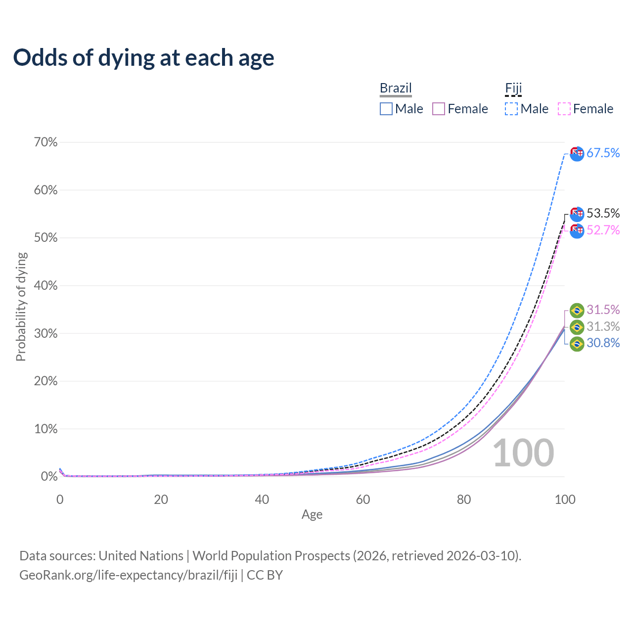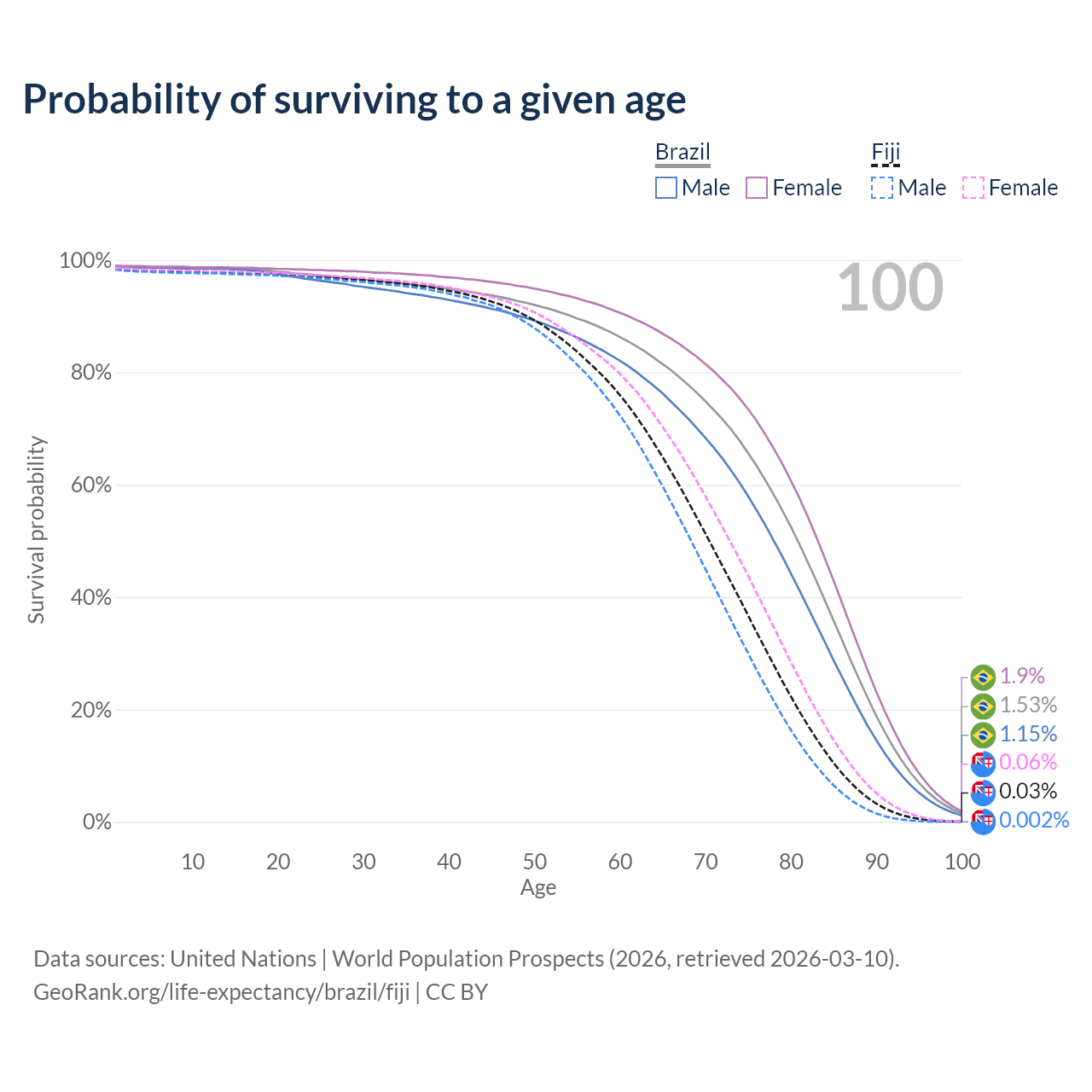 This life expectancy calculator shows the odds of living to 100, 95, 90, and below based on current age for both males and females in Brazil and Fiji, along with mean and median age of death. The calculations are based on the 2026 life tables (actuarial tables) from the UN World Population Prospects.