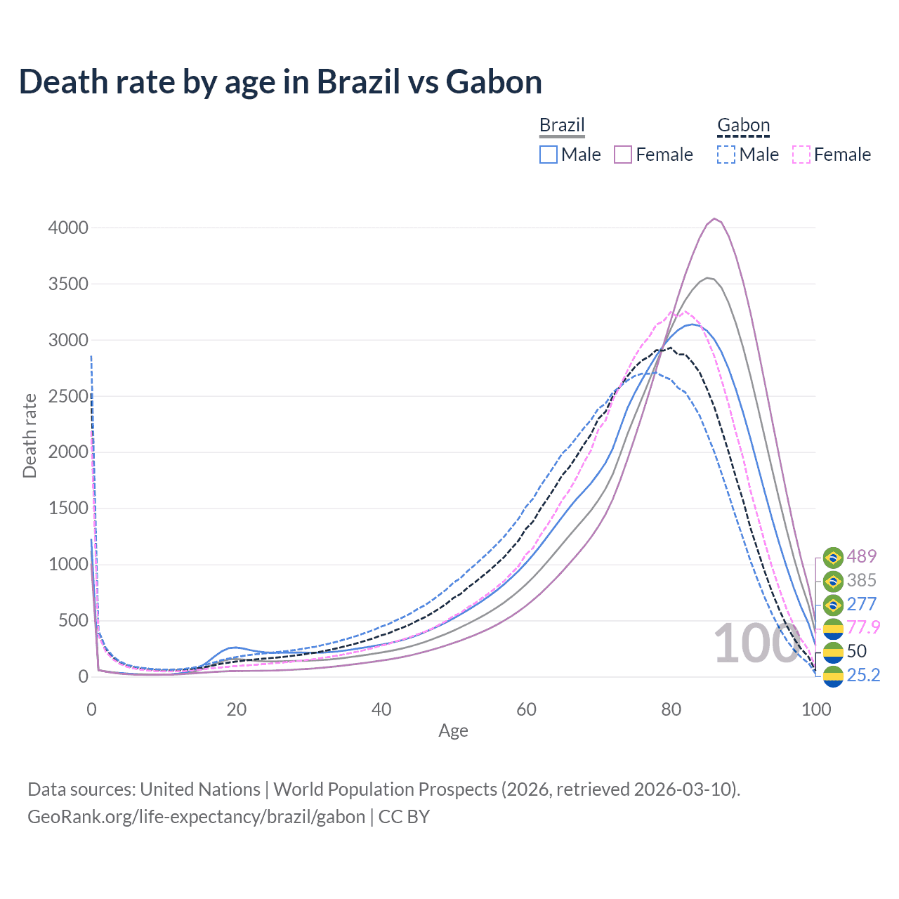 In Brazil, the most common age of death is 85, compared to 80 in Gabon. The median age of death is 80.8 in Brazil and 73.9 in Gabon, meaning only half of each cohort is expected to live past that age.