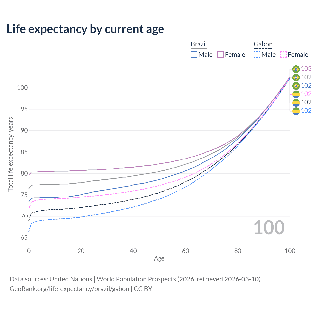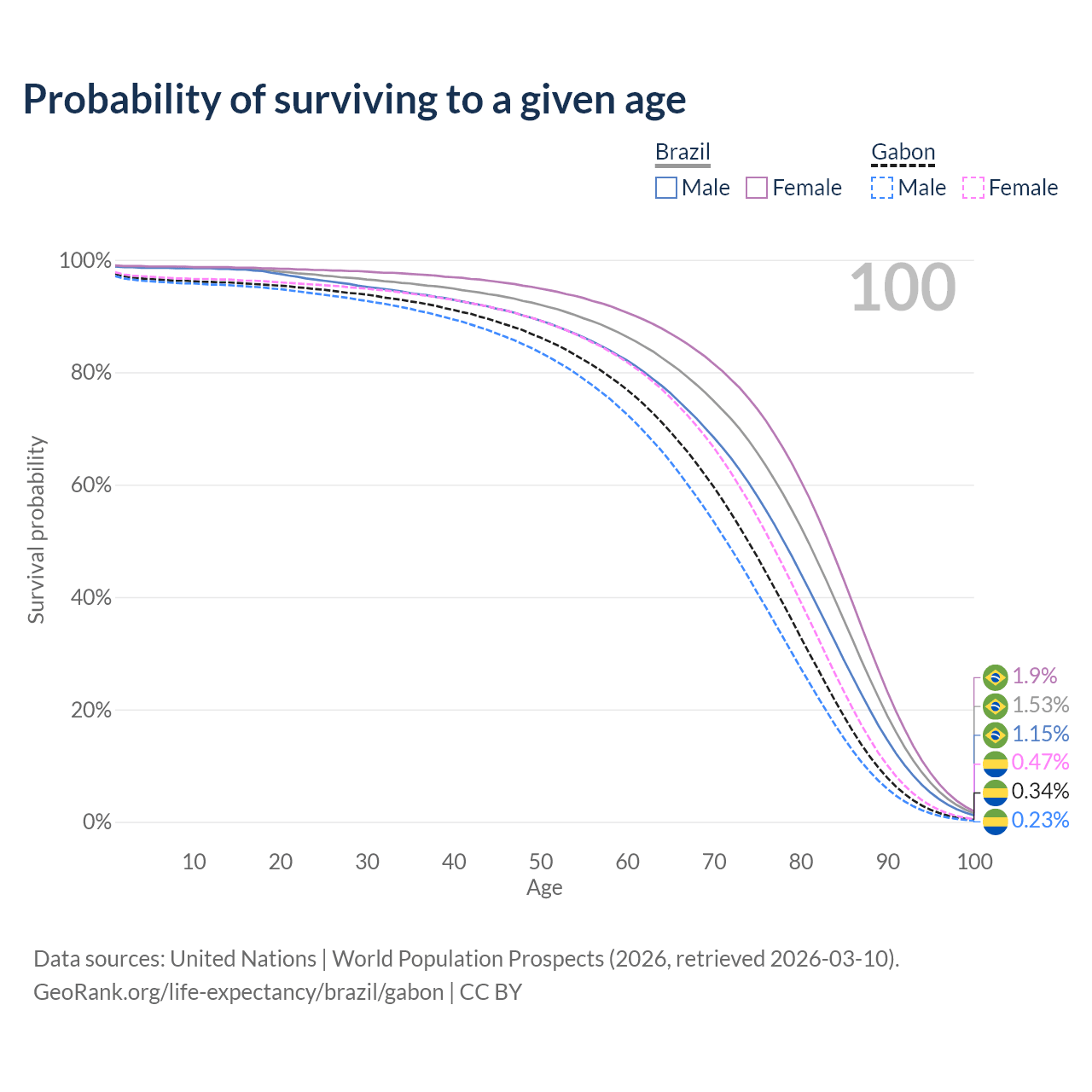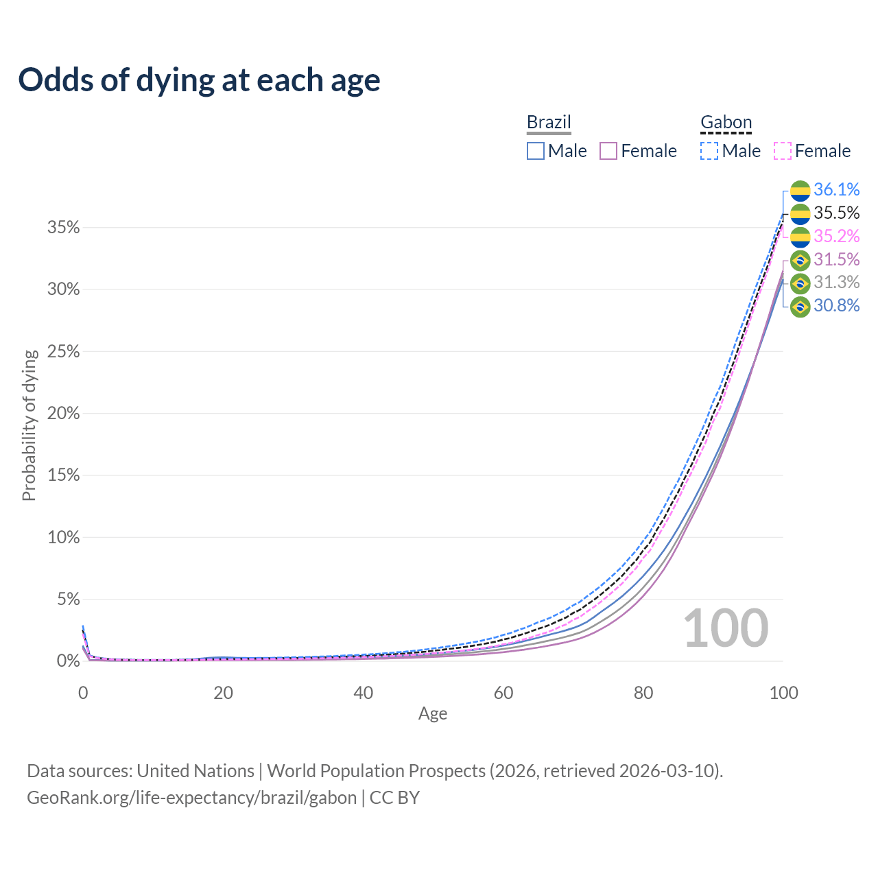 This life expectancy calculator shows the odds of living to 100, 95, 90, and below based on current age for both males and females in Brazil and Gabon, along with mean and median age of death. The calculations are based on the 2026 life tables (actuarial tables) from the UN World Population Prospects.