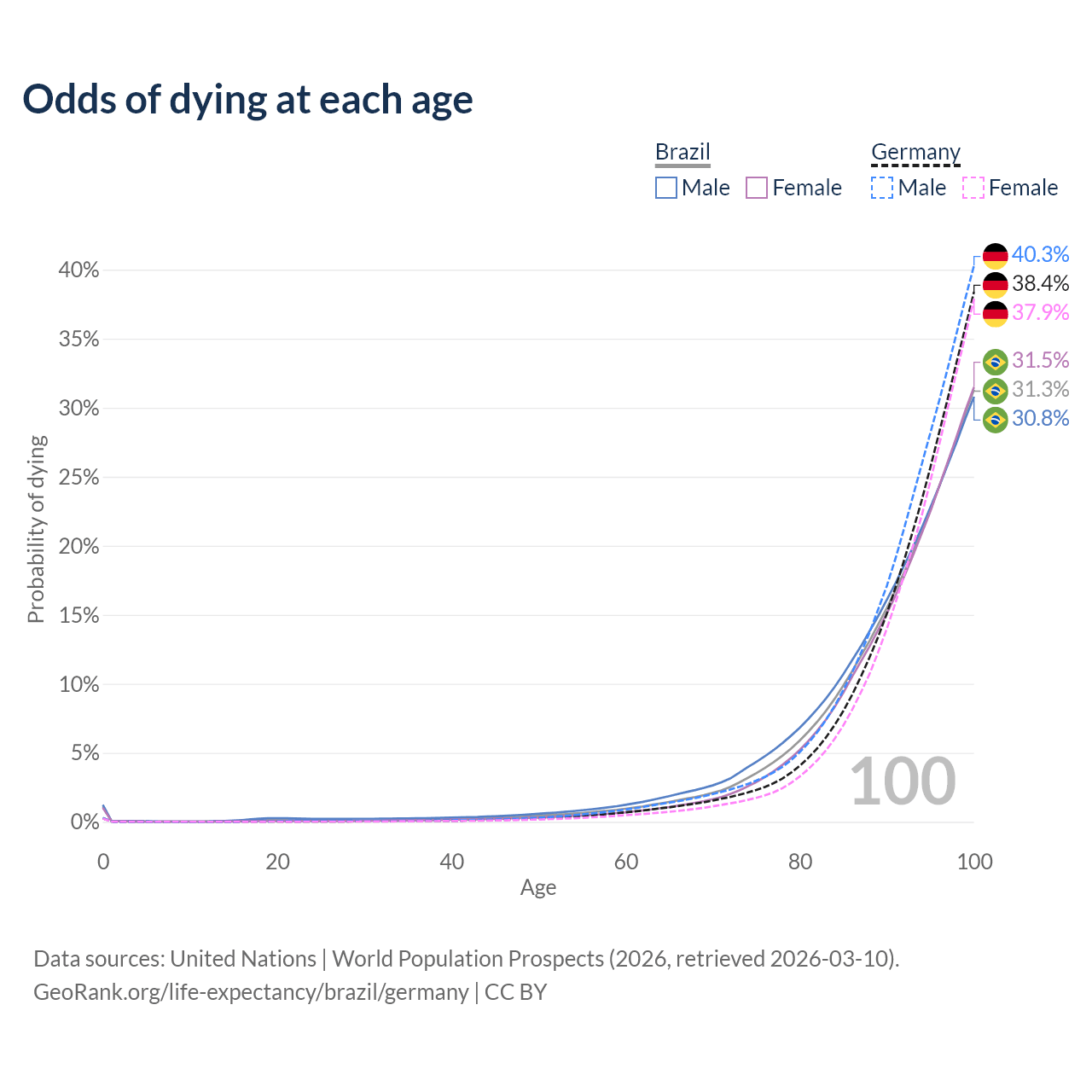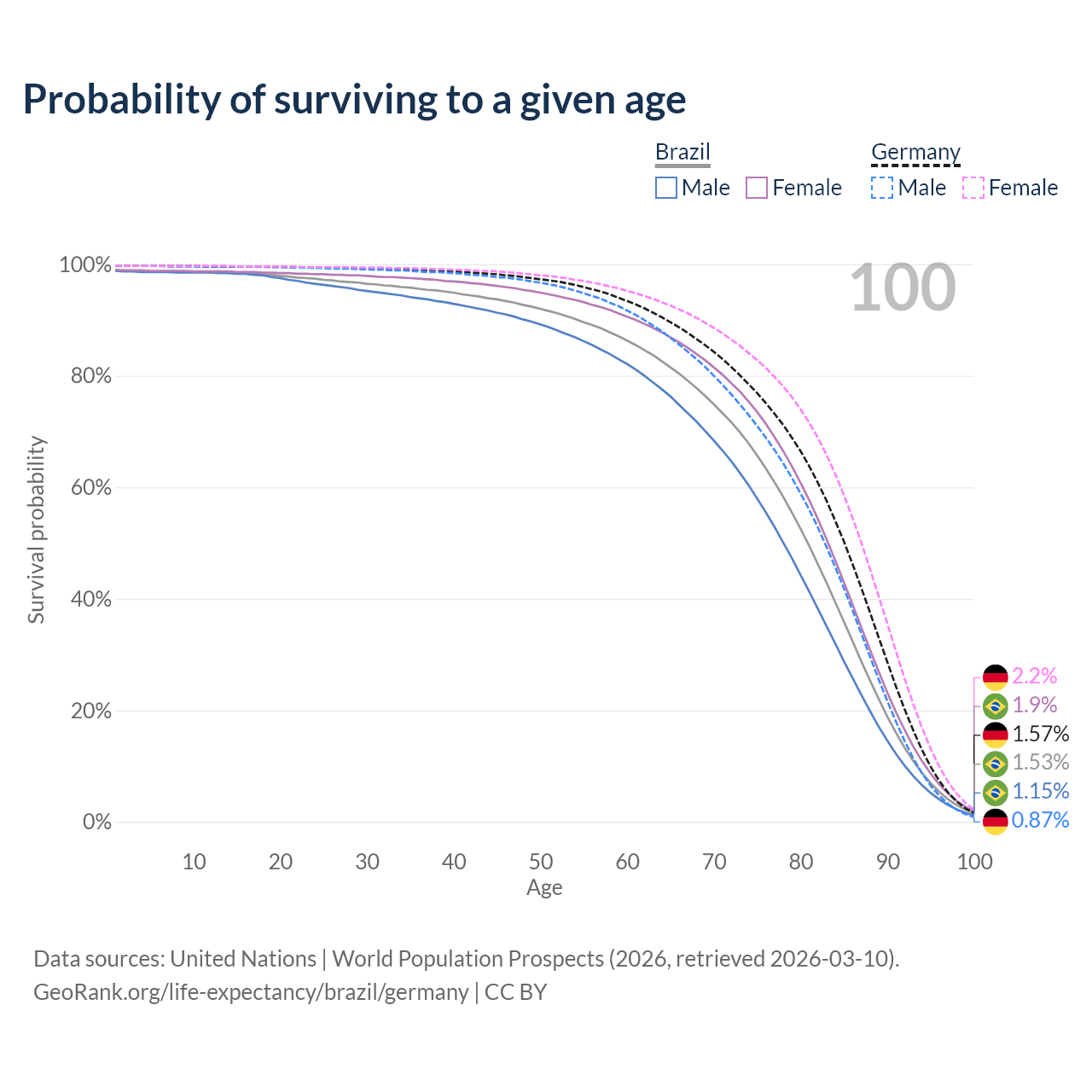 This life expectancy calculator shows the odds of living to 100, 95, 90, and below based on current age for both males and females in Brazil and Germany, along with mean and median age of death. The calculations are based on the 2026 life tables (actuarial tables) from the UN World Population Prospects.
