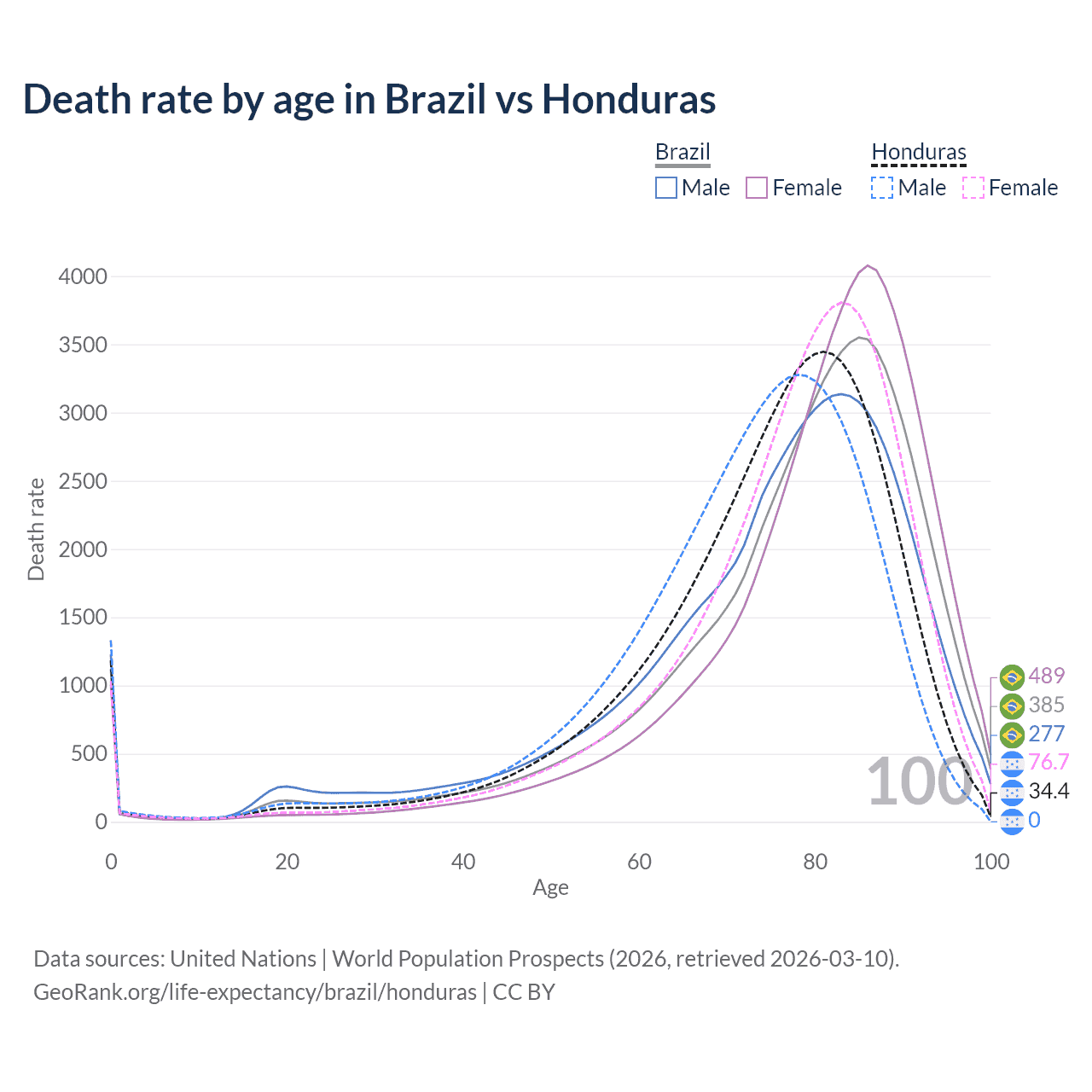 In Brazil, the most common age of death is 85, compared to 81 in Honduras. The median age of death is 80.8 in Brazil and 77.1 in Honduras, meaning only half of each cohort is expected to live past that age.