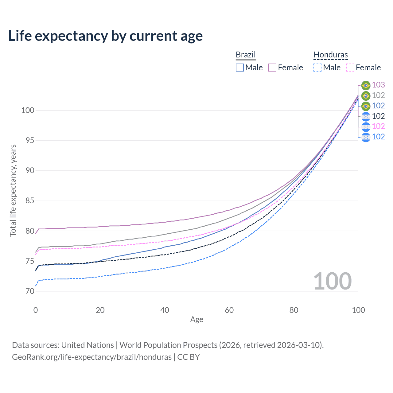 This life expectancy calculator shows the odds of living to 100, 95, 90, and below based on current age for both males and females in Brazil and Honduras, along with mean and median age of death. The calculations are based on the 2026 life tables (actuarial tables) from the UN World Population Prospects.