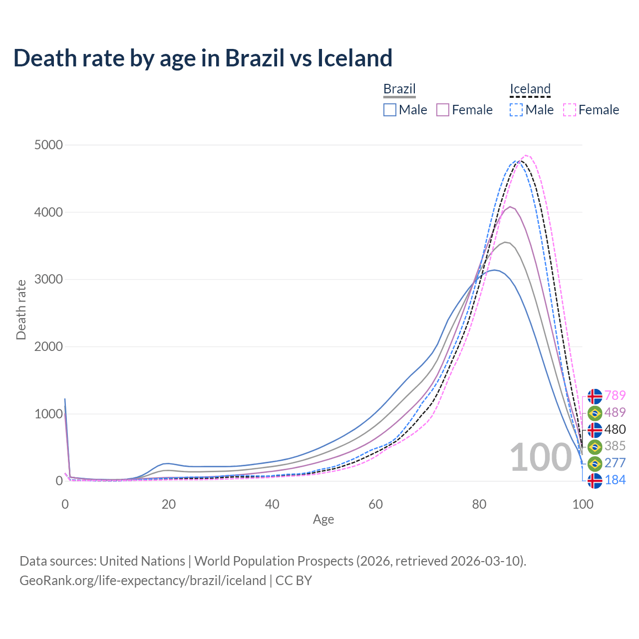 In Brazil, the most common age of death is 85, compared to 88 in Iceland. The median age of death is 80.8 in Brazil and 85.9 in Iceland, meaning only half of each cohort is expected to live past that age.