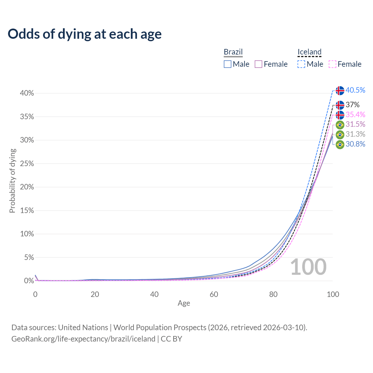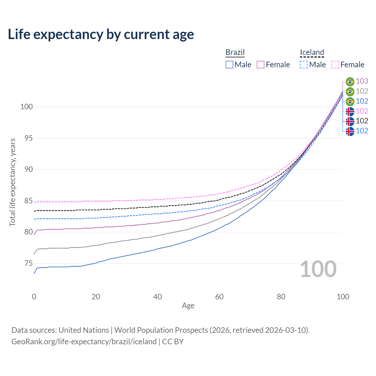 This life expectancy calculator shows the odds of living to 100, 95, 90, and below based on current age for both males and females in Brazil and Iceland, along with mean and median age of death. The calculations are based on the 2026 life tables (actuarial tables) from the UN World Population Prospects.
