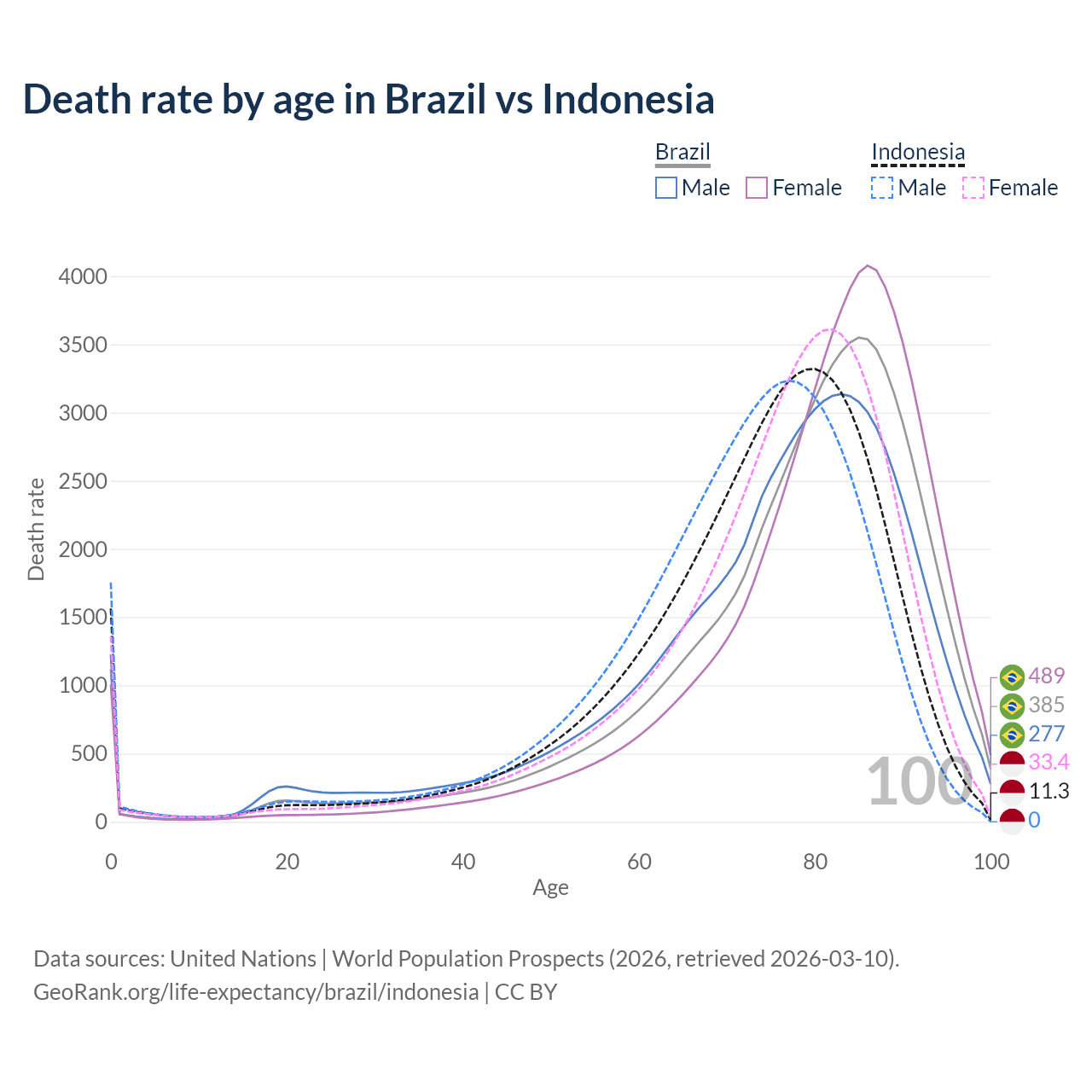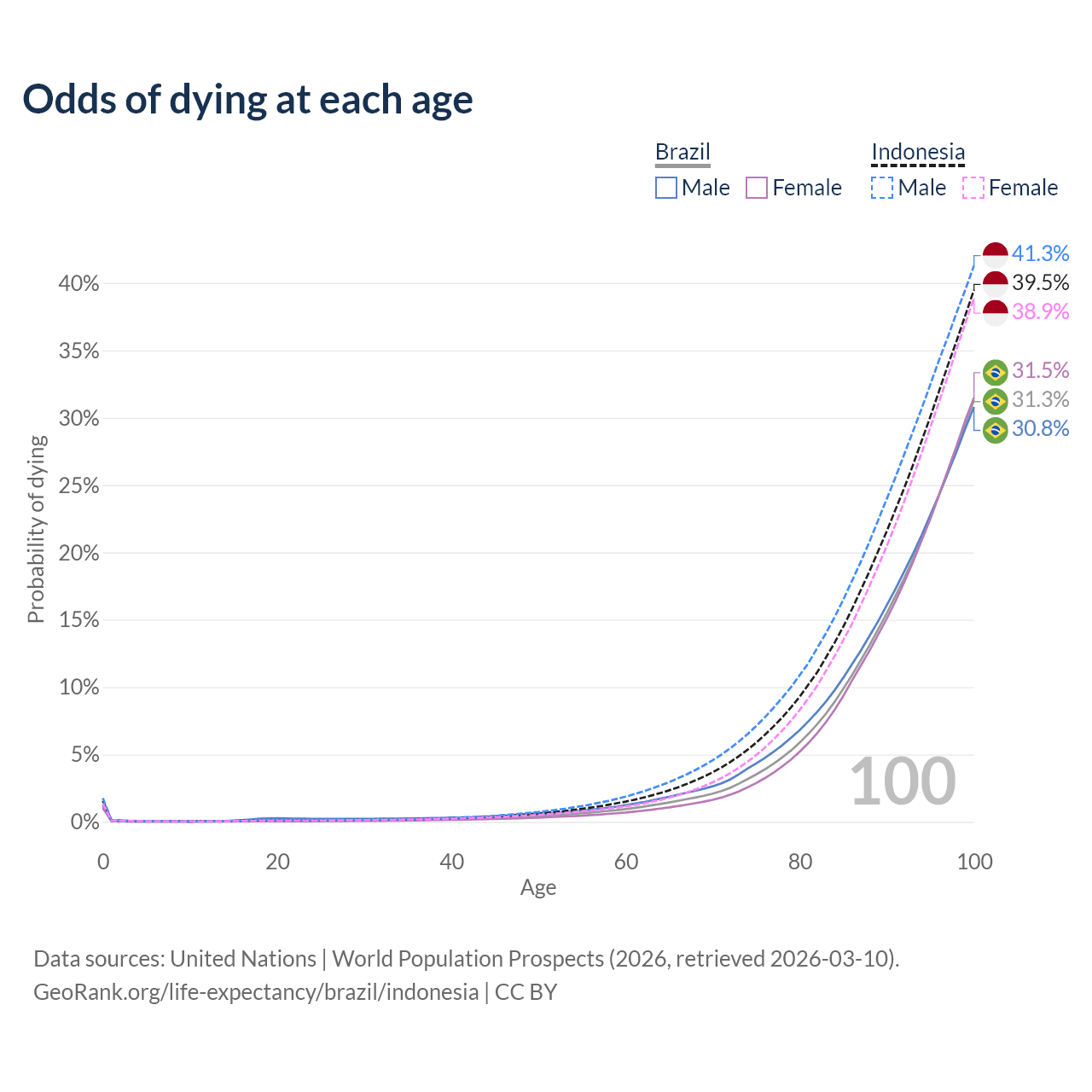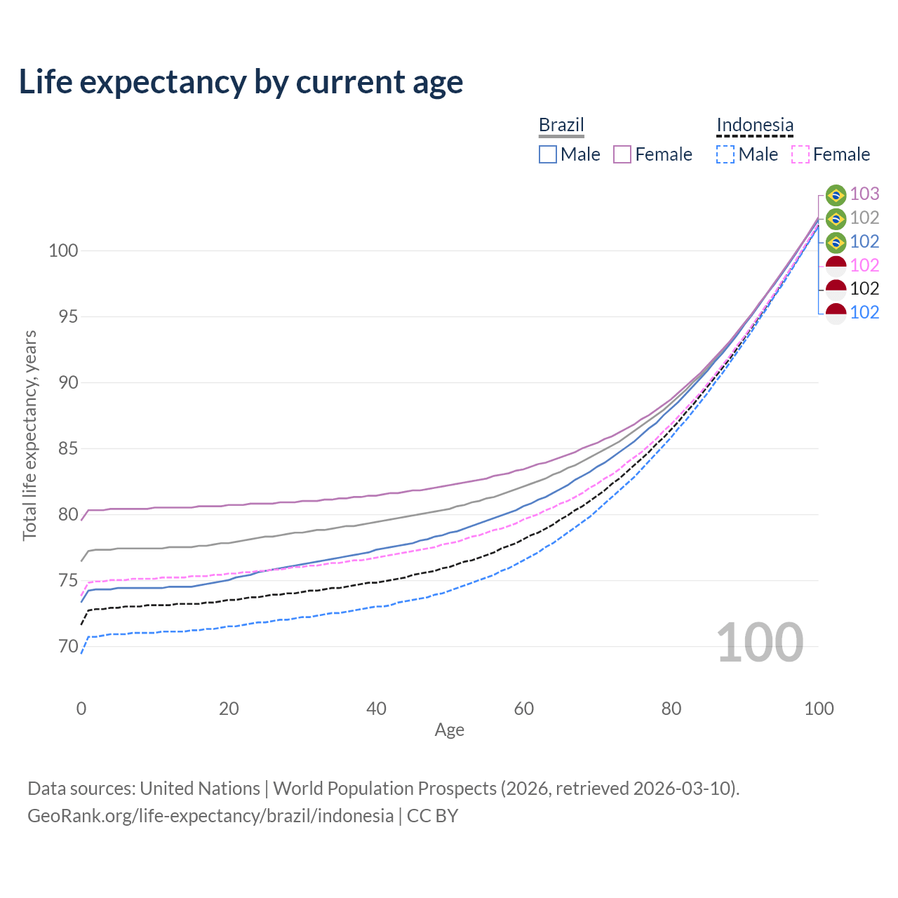 This life expectancy calculator shows the odds of living to 100, 95, 90, and below based on current age for both males and females in Brazil and Indonesia, along with mean and median age of death. The calculations are based on the 2026 life tables (actuarial tables) from the UN World Population Prospects.