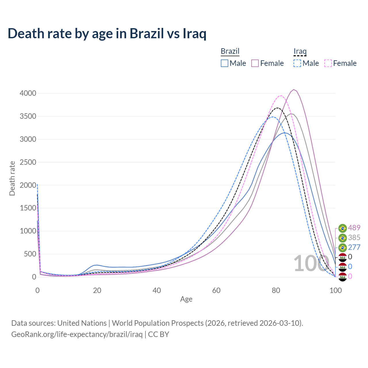 In Brazil, the most common age of death is 85, compared to 81 in Iraq. The median age of death is 80.8 in Brazil and 76.7 in Iraq, meaning only half of each cohort is expected to live past that age.