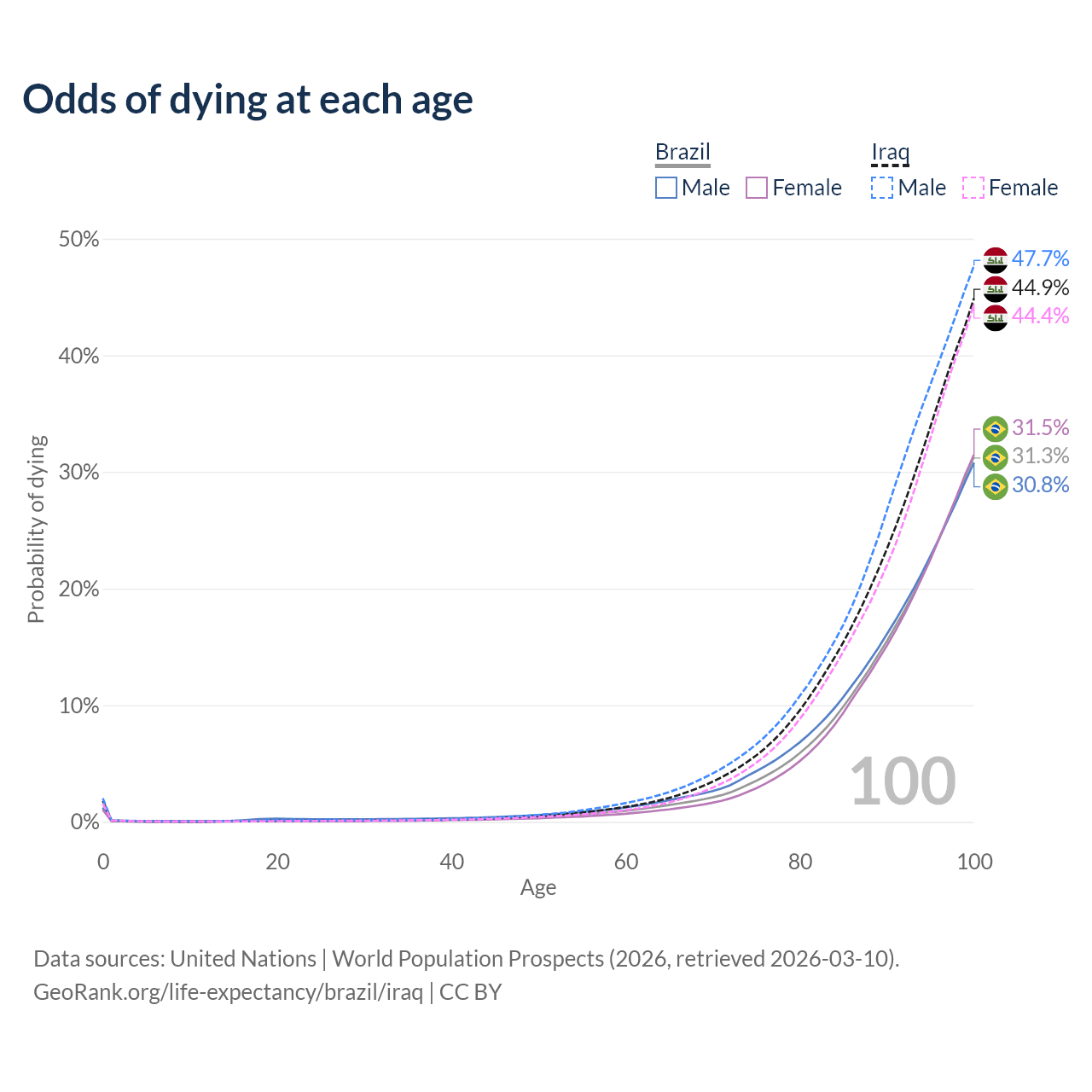 This life expectancy calculator shows the odds of living to 100, 95, 90, and below based on current age for both males and females in Brazil and Iraq, along with mean and median age of death. The calculations are based on the 2026 life tables (actuarial tables) from the UN World Population Prospects.