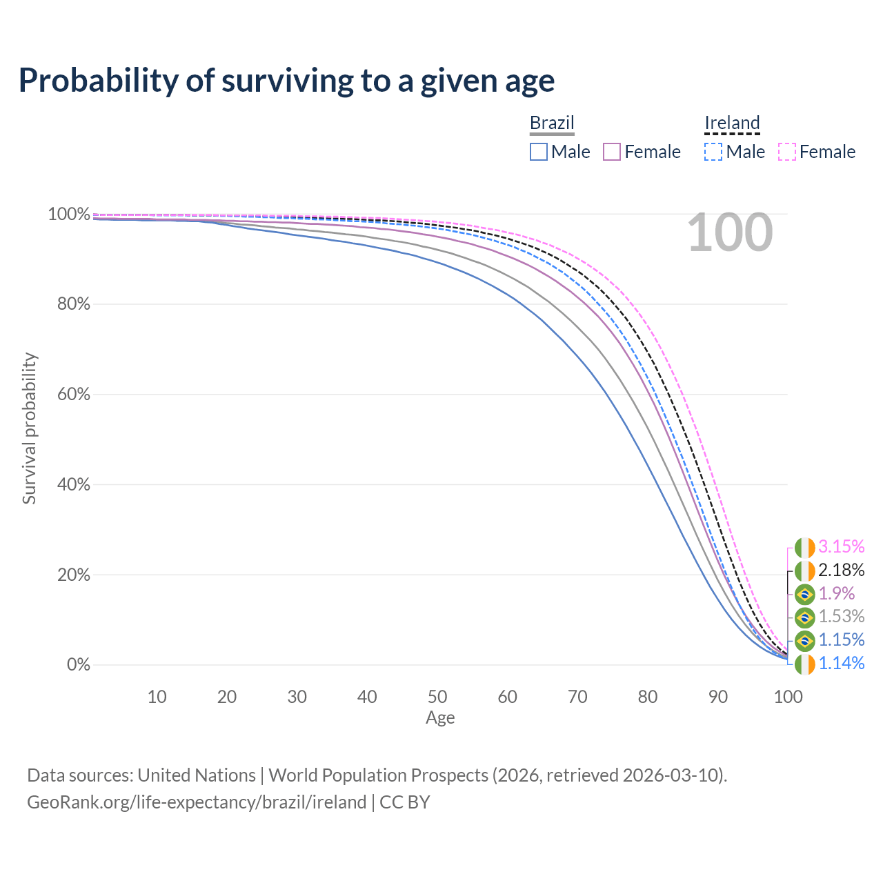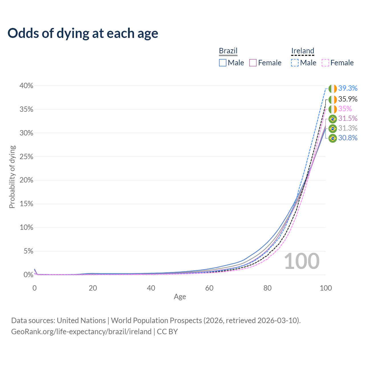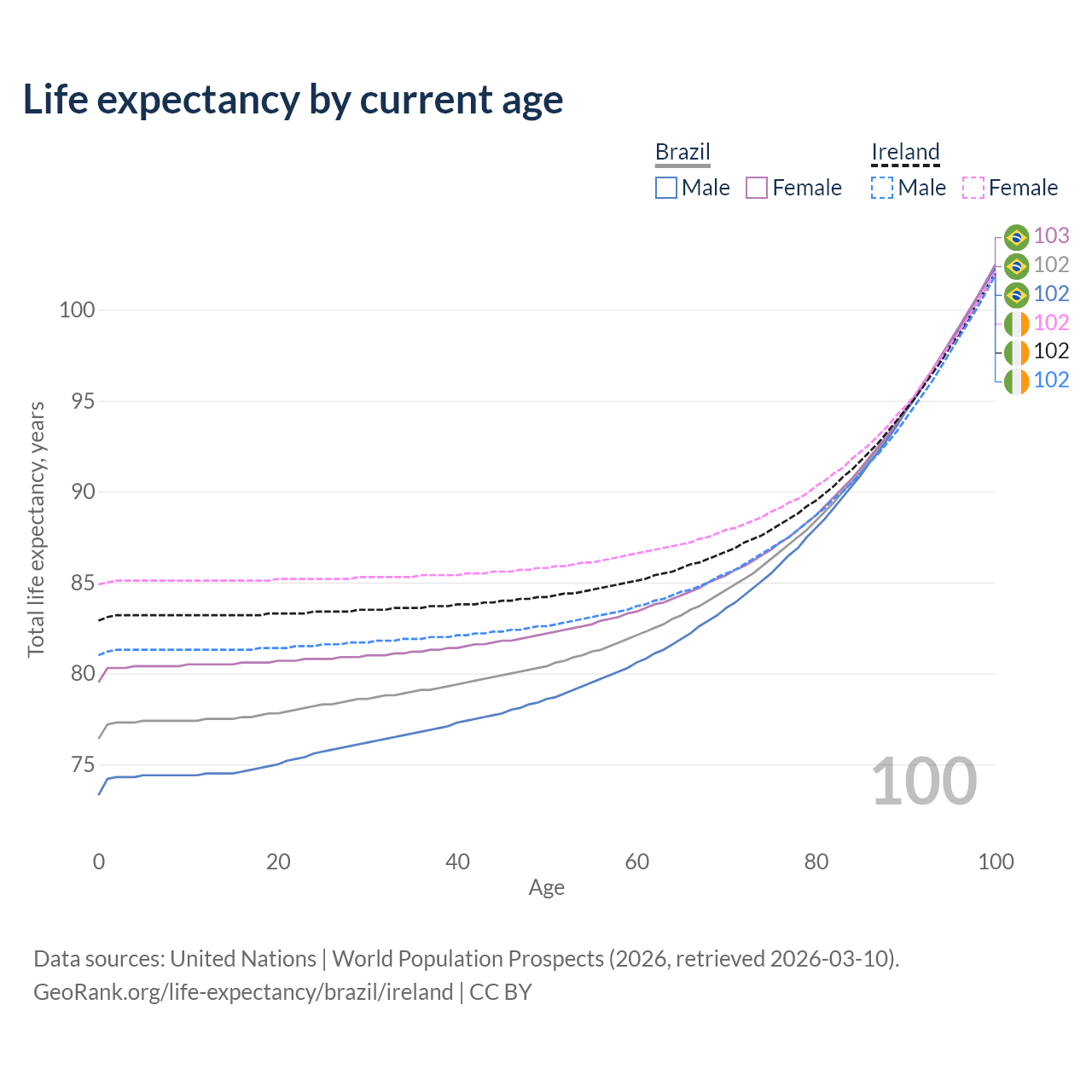 This life expectancy calculator shows the odds of living to 100, 95, 90, and below based on current age for both males and females in Brazil and Ireland, along with mean and median age of death. The calculations are based on the 2026 life tables (actuarial tables) from the UN World Population Prospects.