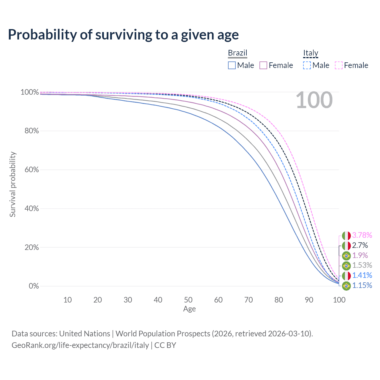 This life expectancy calculator shows the odds of living to 100, 95, 90, and below based on current age for both males and females in Brazil and Italy, along with mean and median age of death. The calculations are based on the 2026 life tables (actuarial tables) from the UN World Population Prospects.