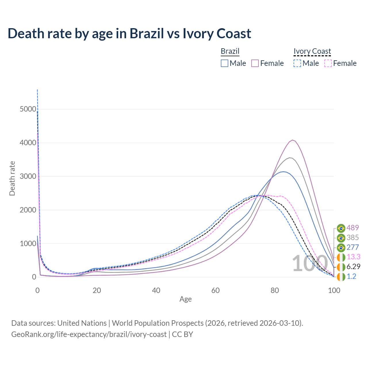 In Brazil, the most common age of death is 85, compared to 0 in Ivory Coast. The median age of death is 80.8 in Brazil and 68.6 in Ivory Coast, meaning only half of each cohort is expected to live past that age.