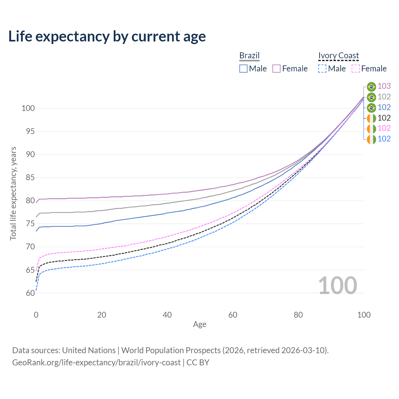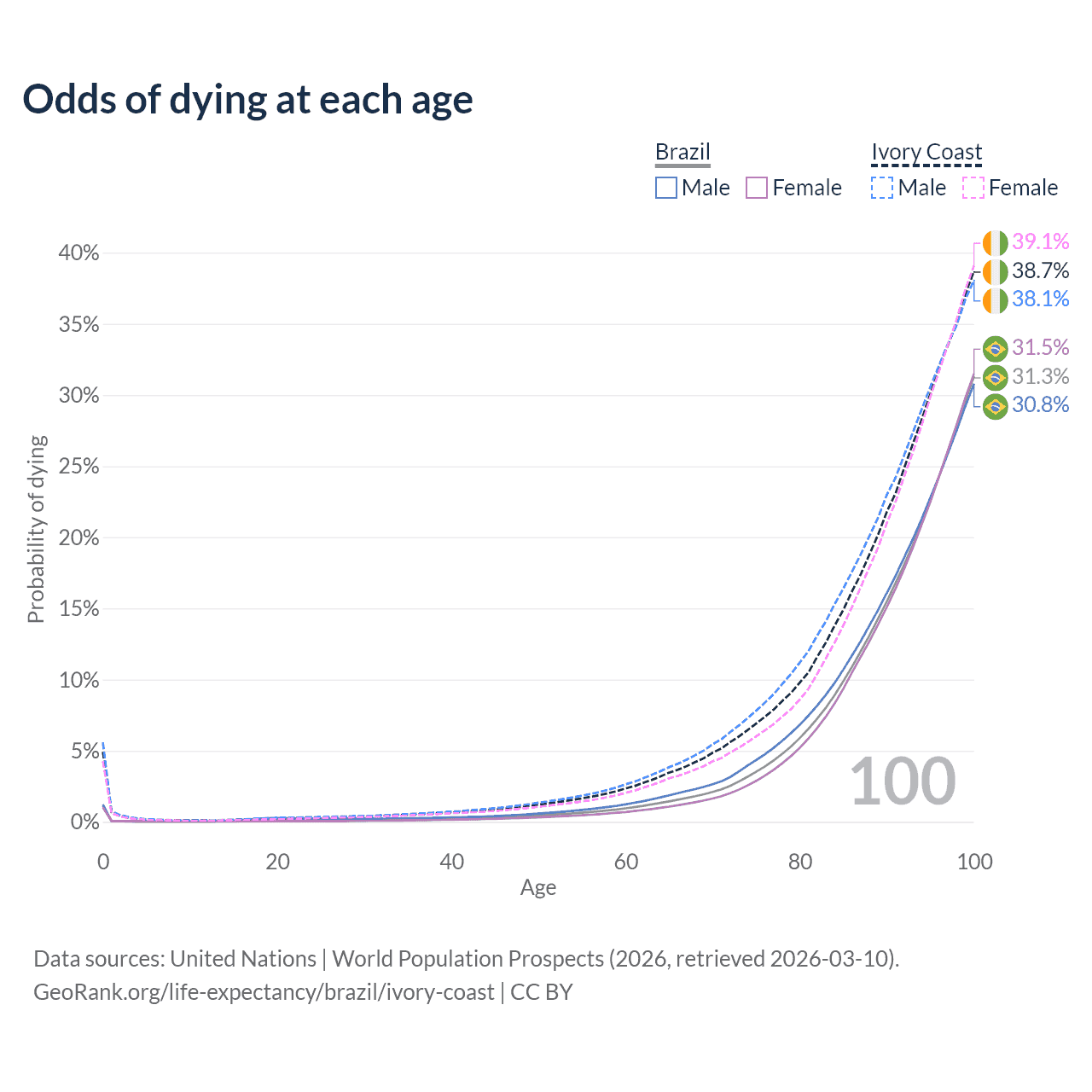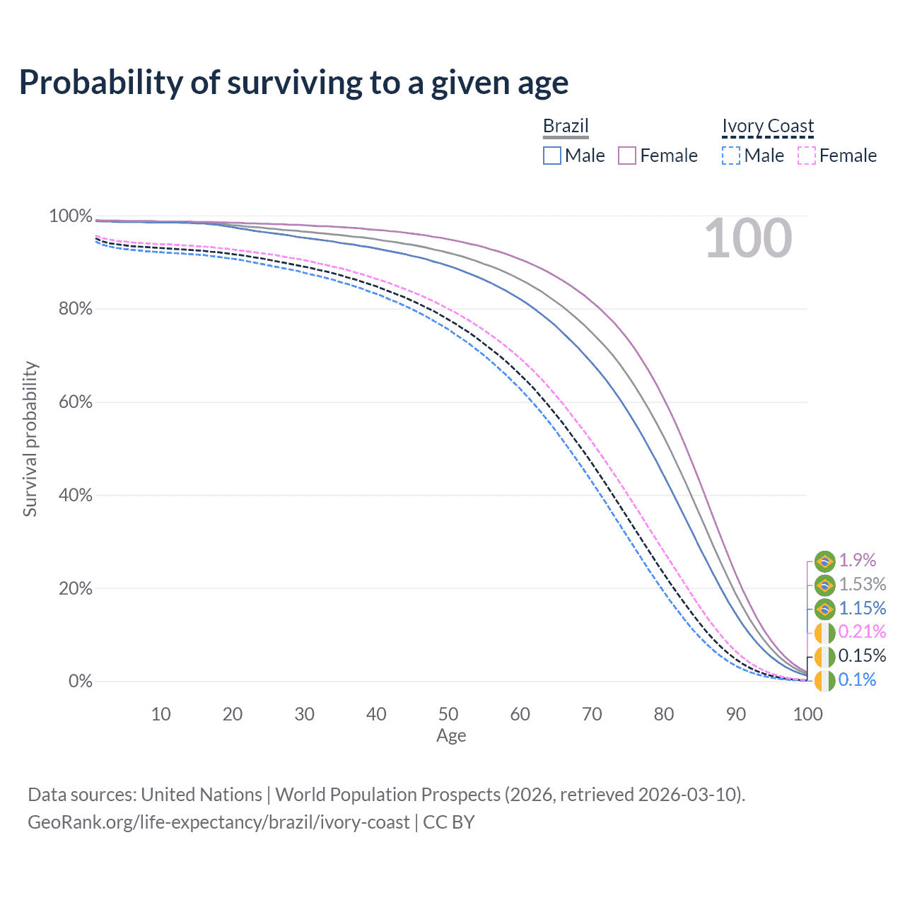 This life expectancy calculator shows the odds of living to 100, 95, 90, and below based on current age for both males and females in Brazil and Ivory Coast, along with mean and median age of death. The calculations are based on the 2026 life tables (actuarial tables) from the UN World Population Prospects.