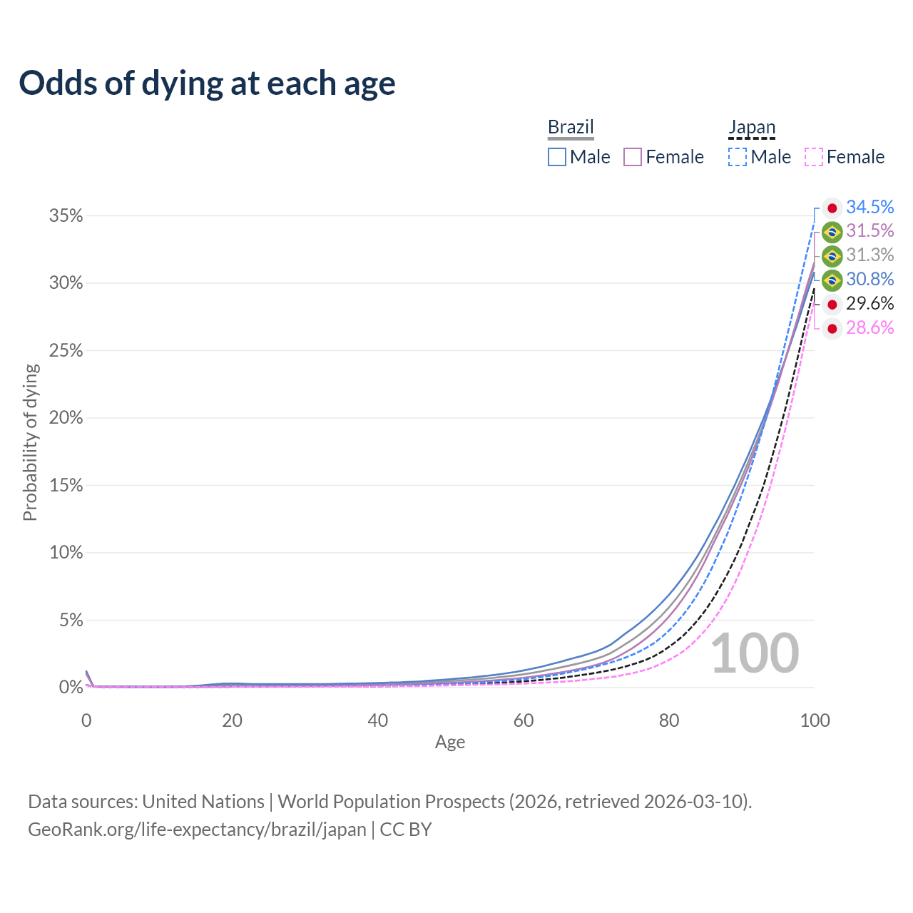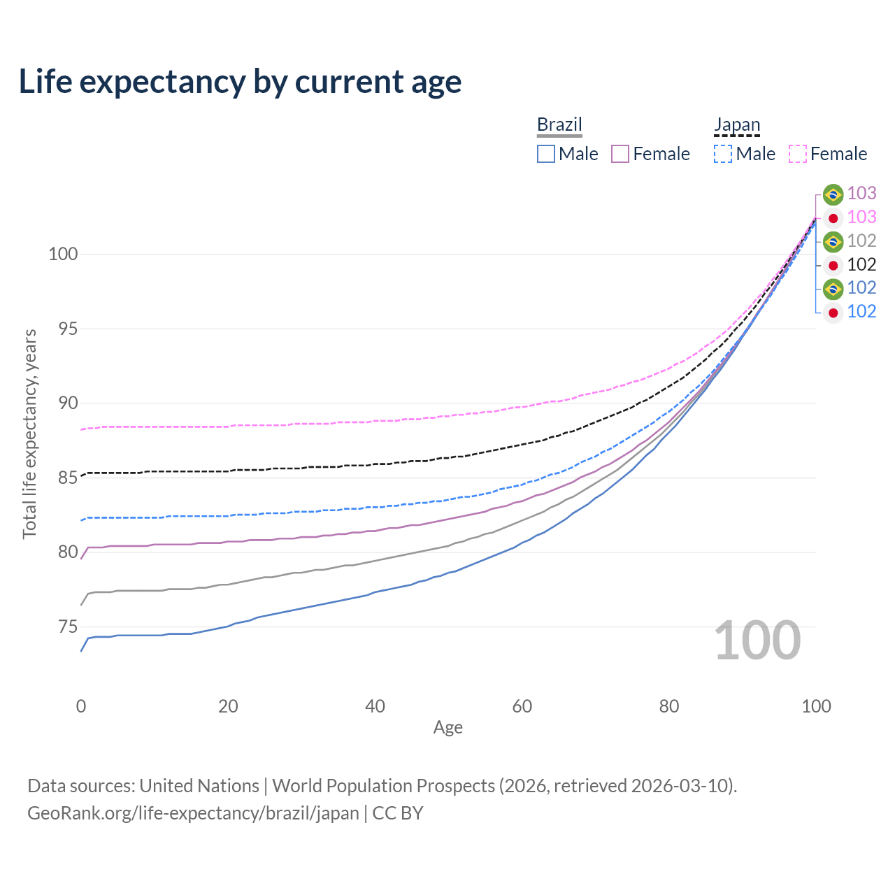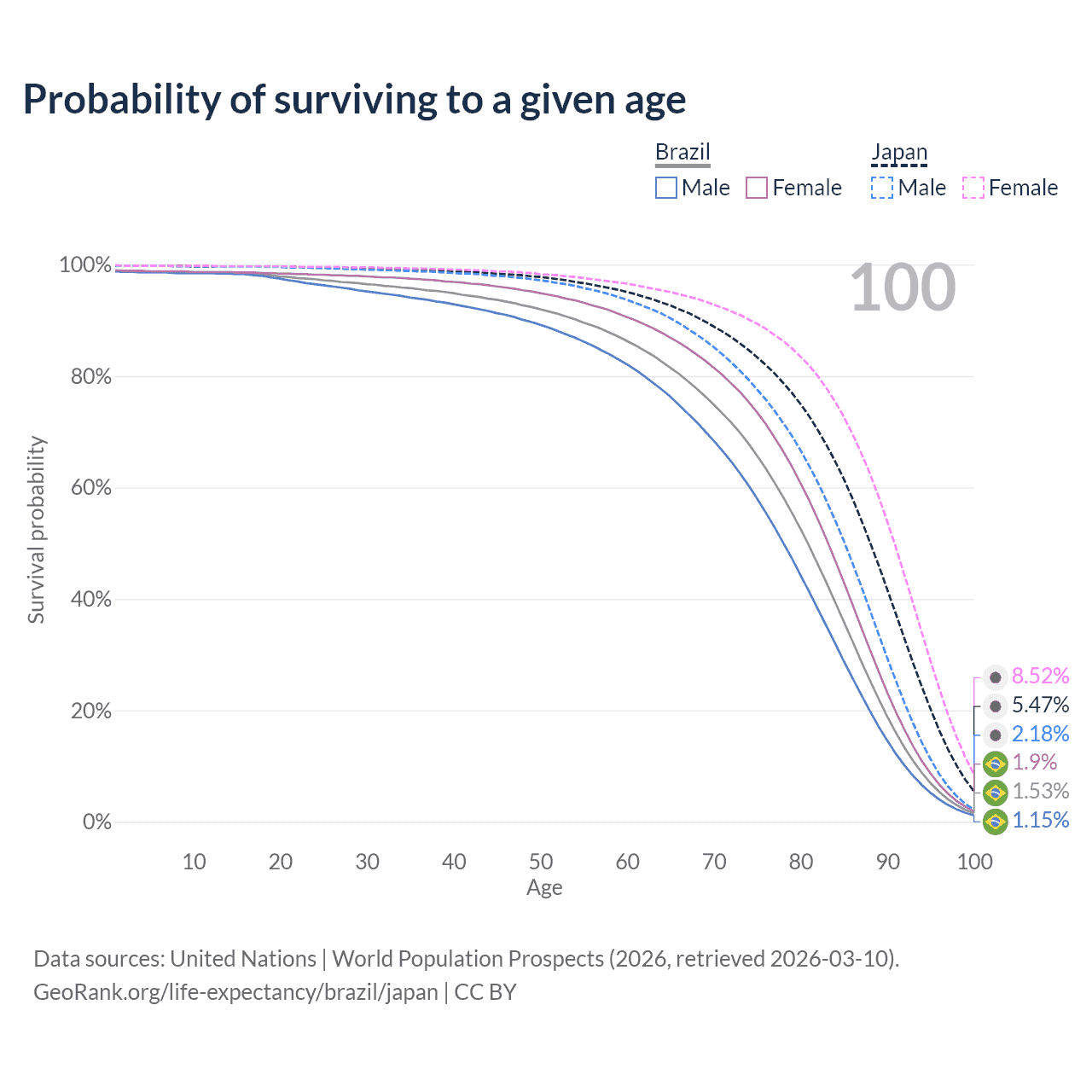 This life expectancy calculator shows the odds of living to 100, 95, 90, and below based on current age for both males and females in Brazil and Japan, along with mean and median age of death. The calculations are based on the 2026 life tables (actuarial tables) from the UN World Population Prospects.