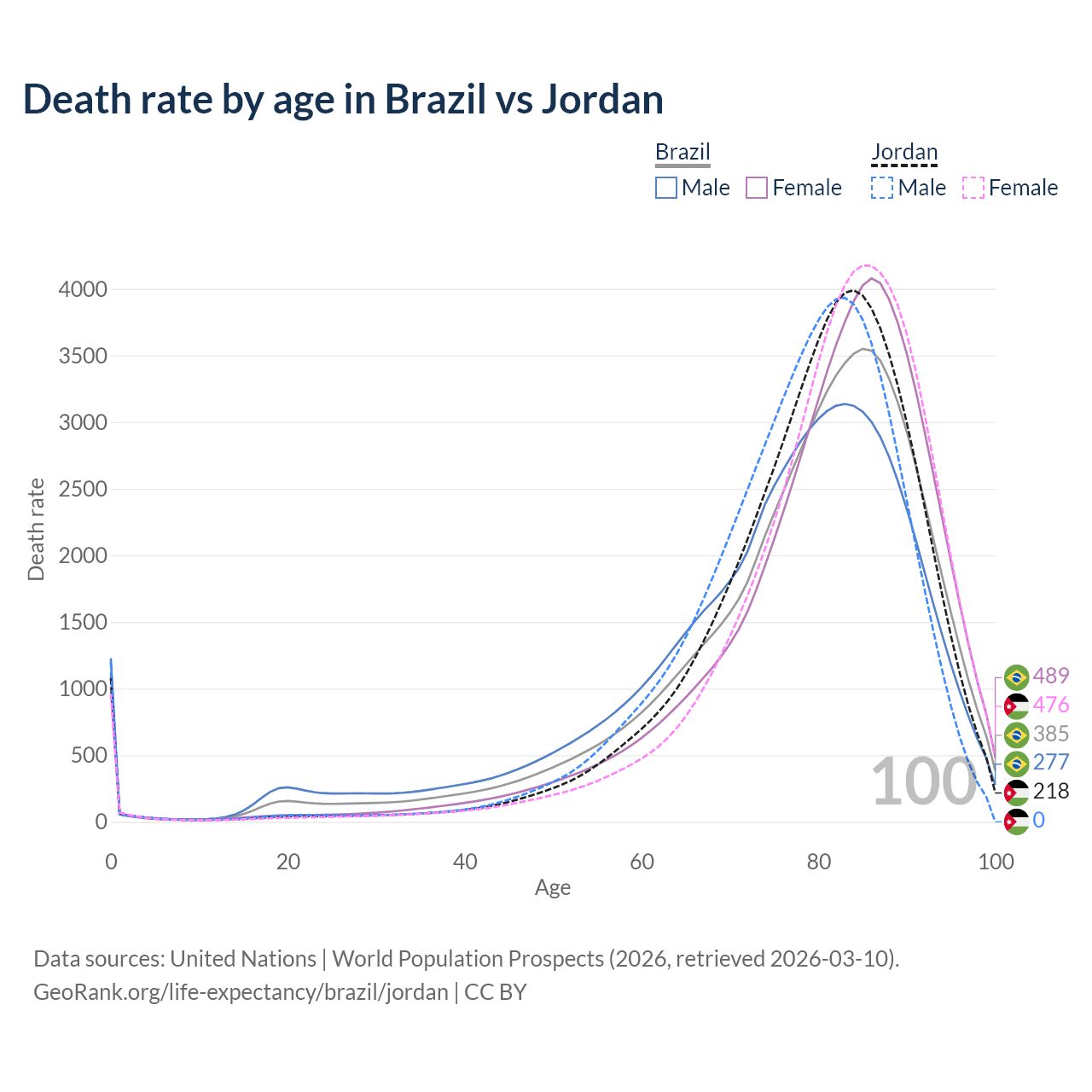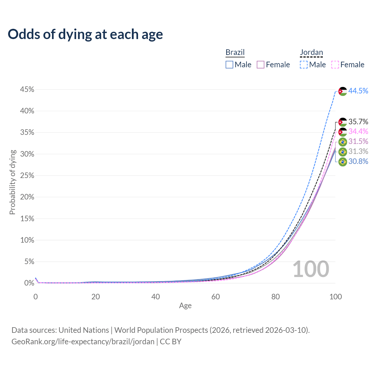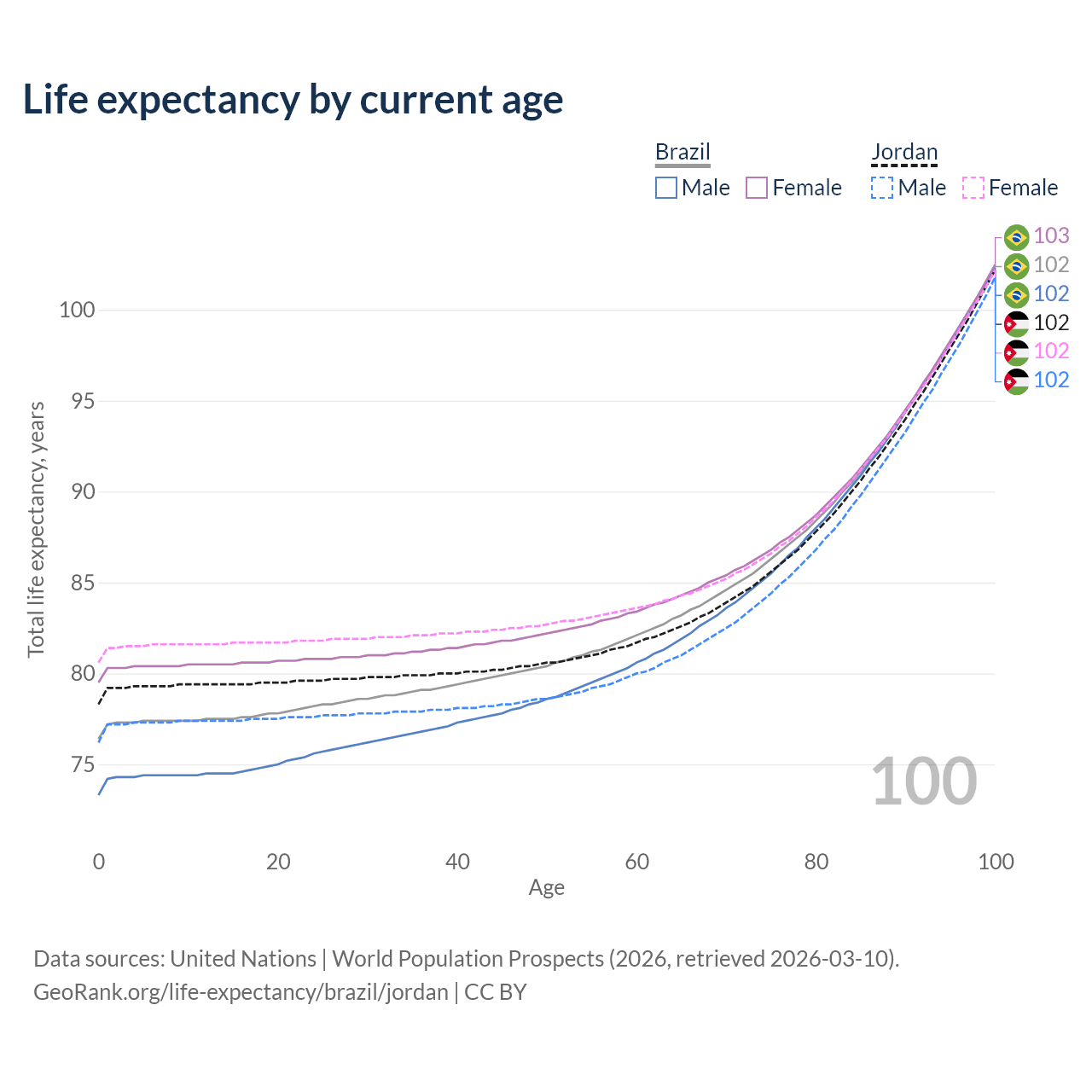 This life expectancy calculator shows the odds of living to 100, 95, 90, and below based on current age for both males and females in Brazil and Jordan, along with mean and median age of death. The calculations are based on the 2026 life tables (actuarial tables) from the UN World Population Prospects.