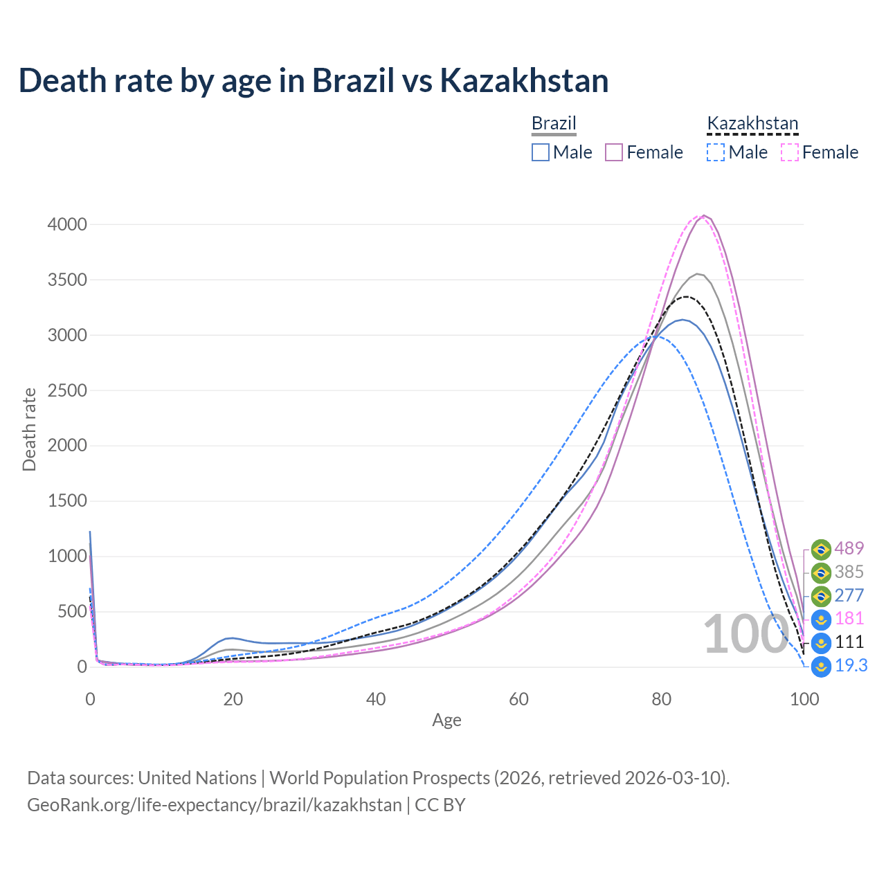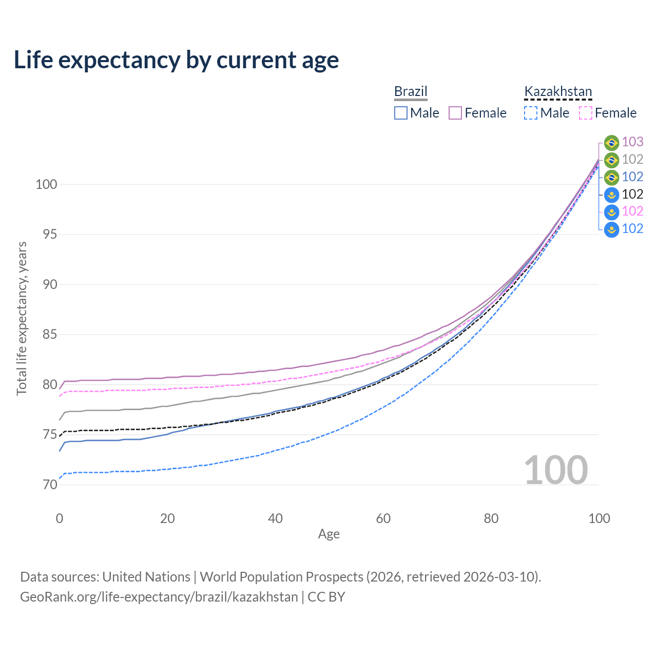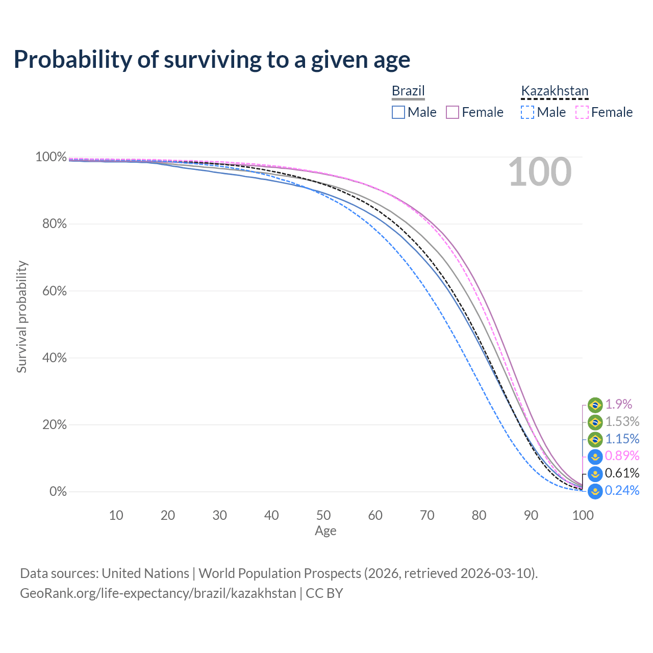 This life expectancy calculator shows the odds of living to 100, 95, 90, and below based on current age for both males and females in Brazil and Kazakhstan, along with mean and median age of death. The calculations are based on the 2026 life tables (actuarial tables) from the UN World Population Prospects.