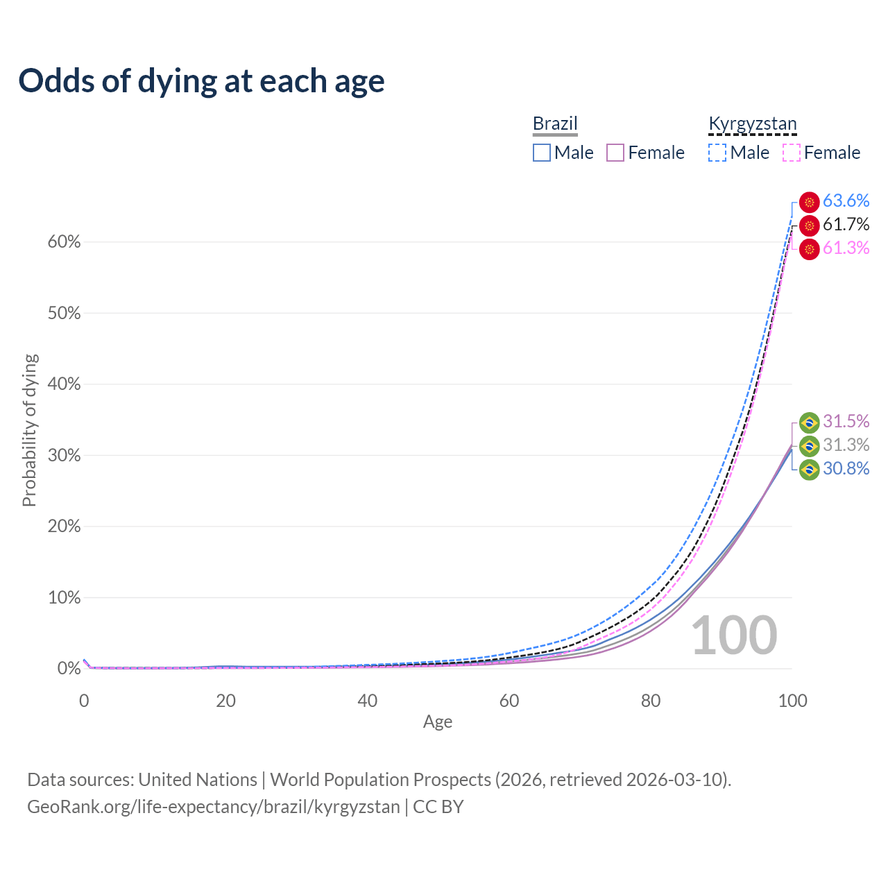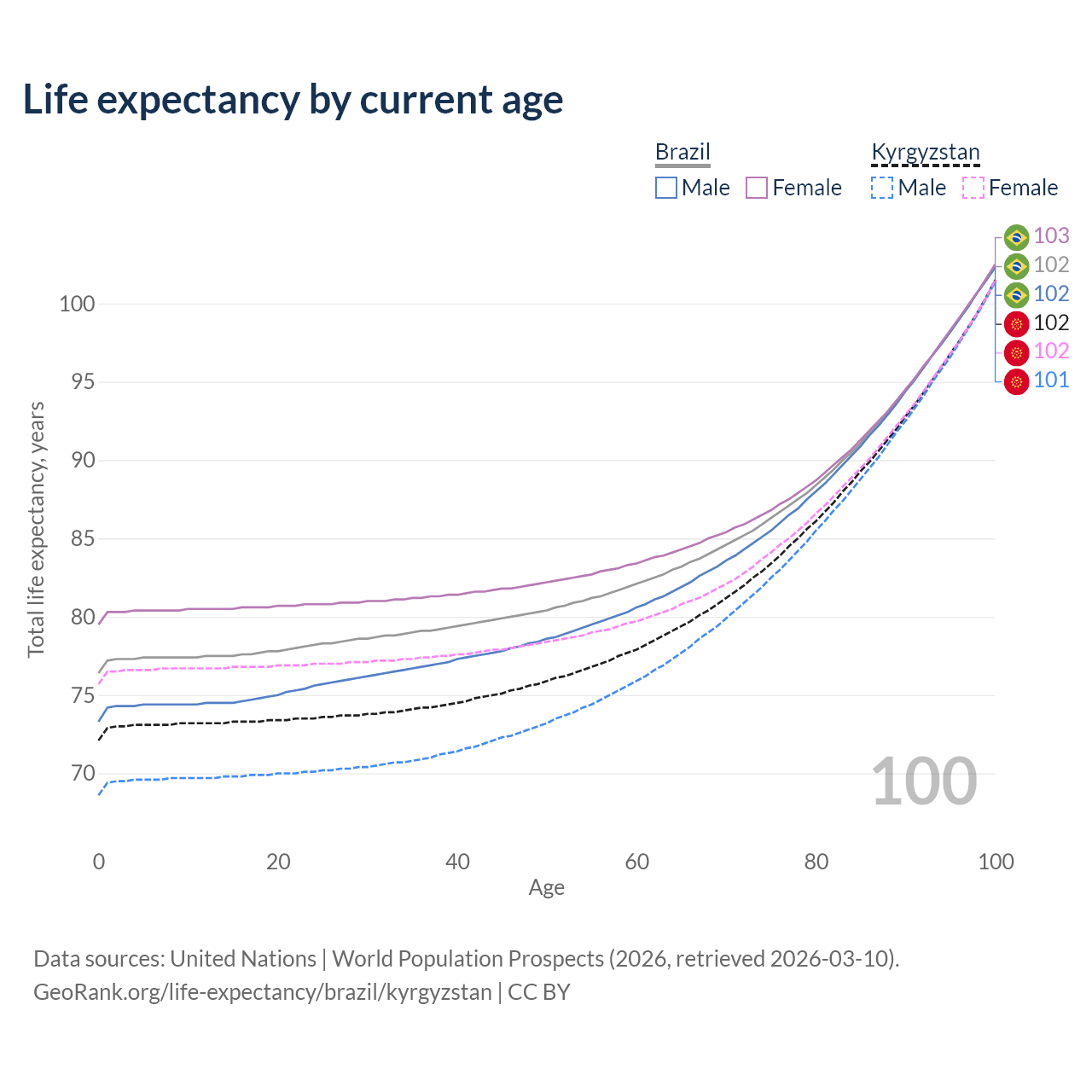 This life expectancy calculator shows the odds of living to 100, 95, 90, and below based on current age for both males and females in Brazil and Kyrgyzstan, along with mean and median age of death. The calculations are based on the 2026 life tables (actuarial tables) from the UN World Population Prospects.