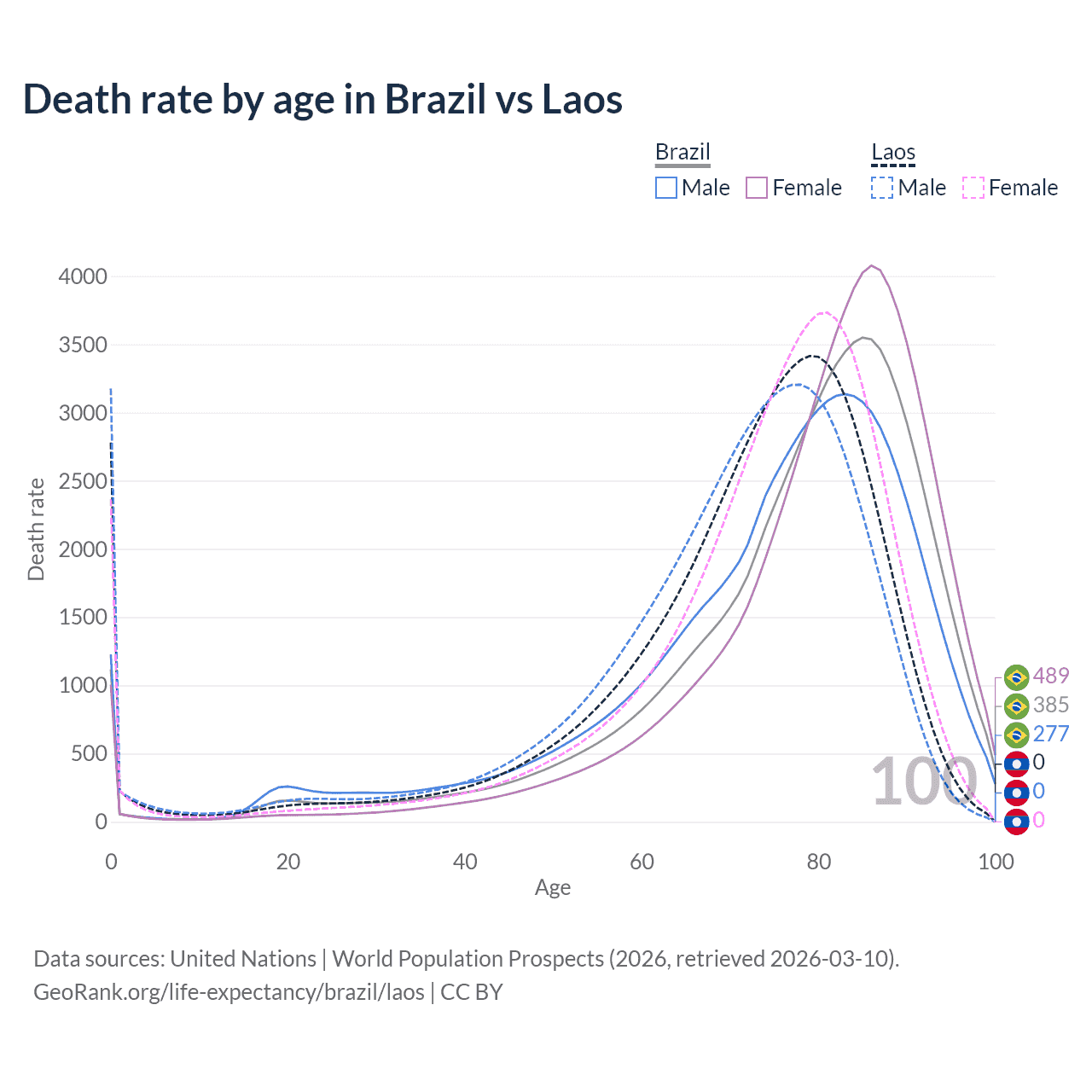 In Brazil, the most common age of death is 85, compared to 79 in Laos. The median age of death is 80.8 in Brazil and 74.7 in Laos, meaning only half of each cohort is expected to live past that age.