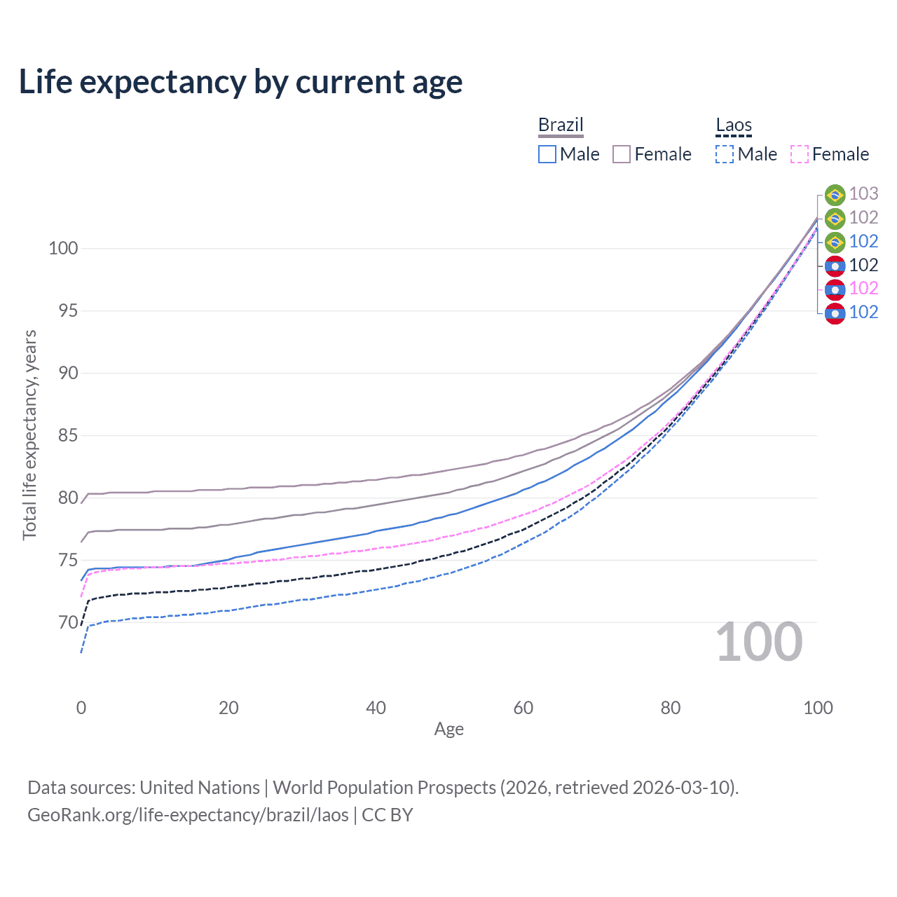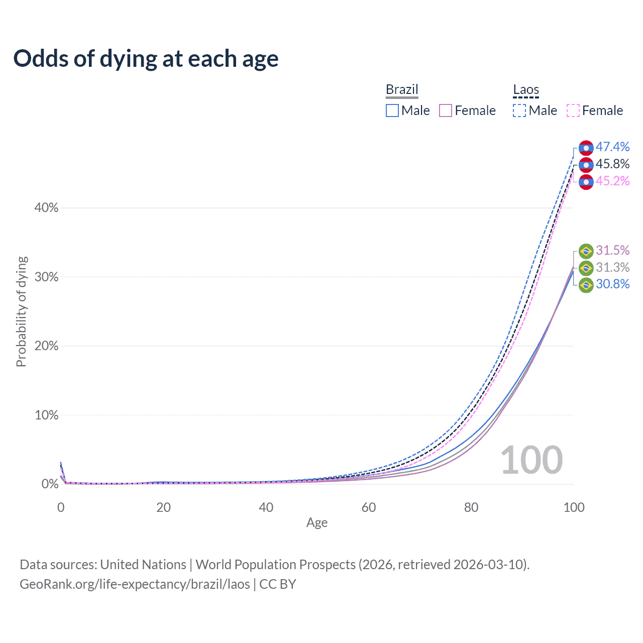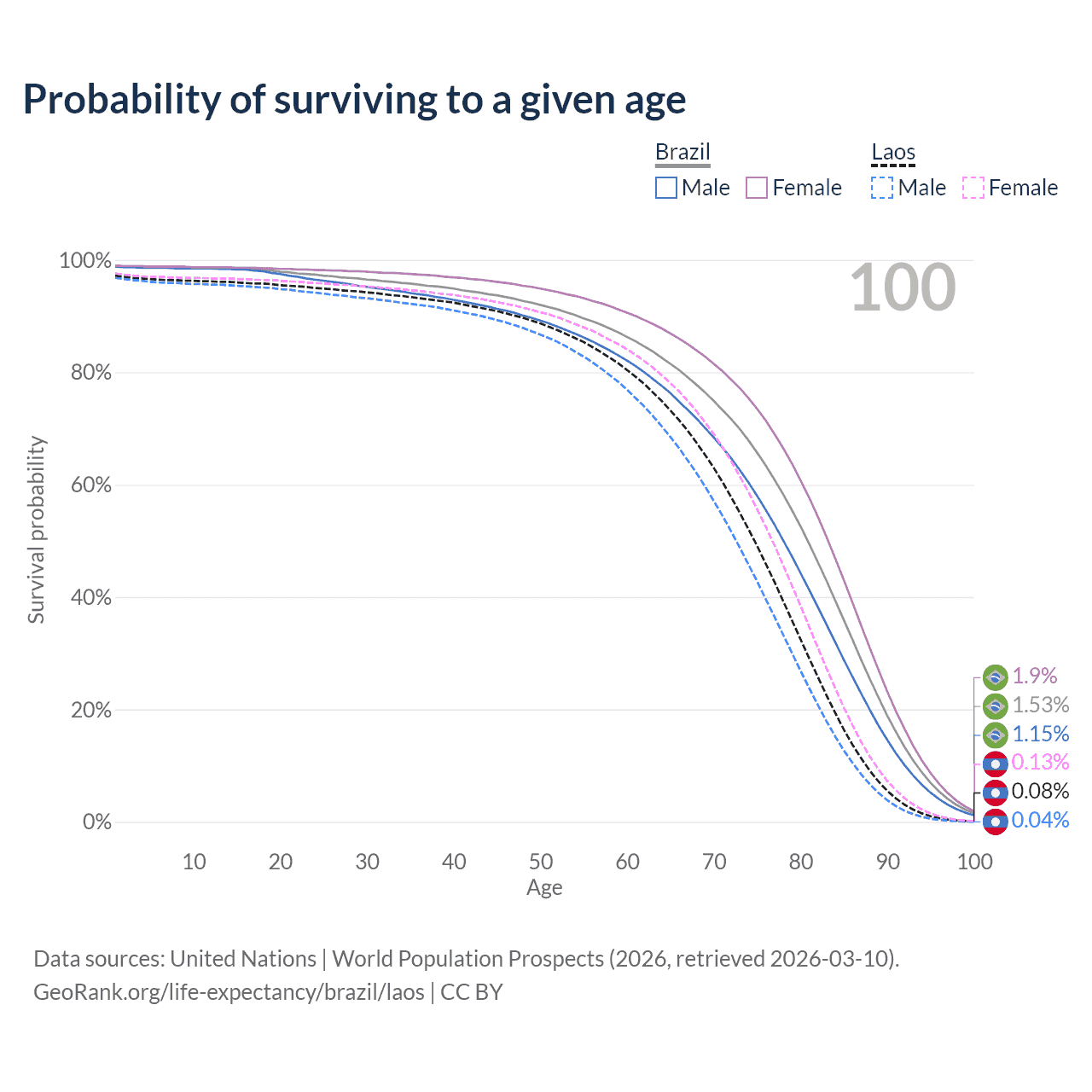 This life expectancy calculator shows the odds of living to 100, 95, 90, and below based on current age for both males and females in Brazil and Laos, along with mean and median age of death. The calculations are based on the 2026 life tables (actuarial tables) from the UN World Population Prospects.