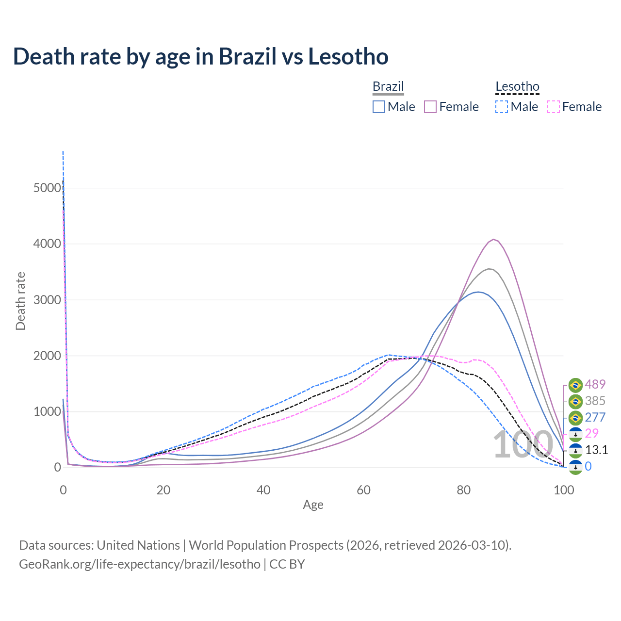 The average life expectancy at birth is 76.4 years in Brazil vs 58.6 in Lesotho. Brazil is ranked 82/197 by life expectancy, and Lesotho is 193/197. In Brazil, the life expectancy is 73.3 years for males and 79.5 years for females. In Lesotho, it's 55.8 years for males and 61.3 years for females.
