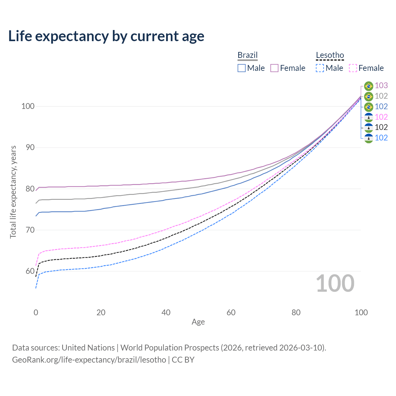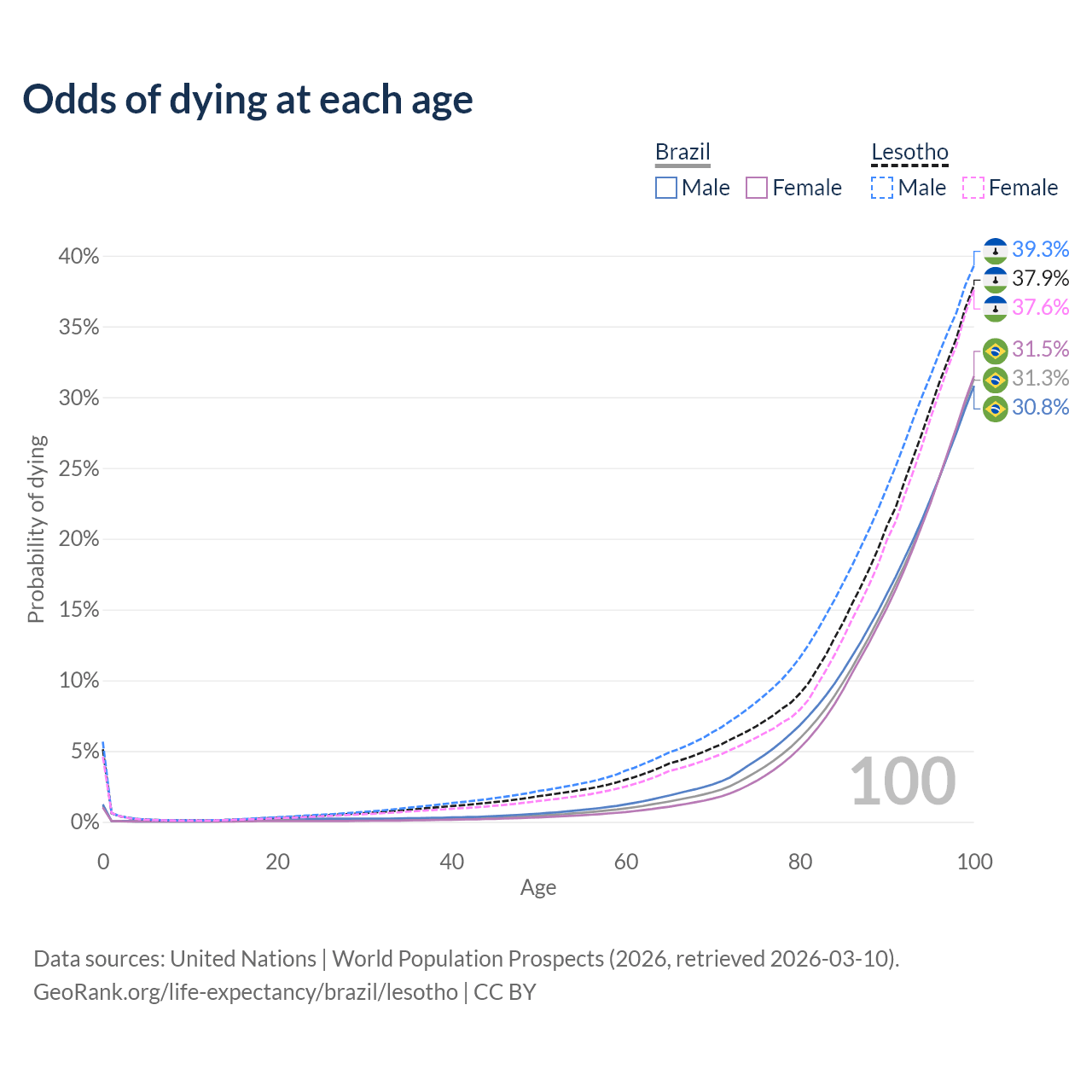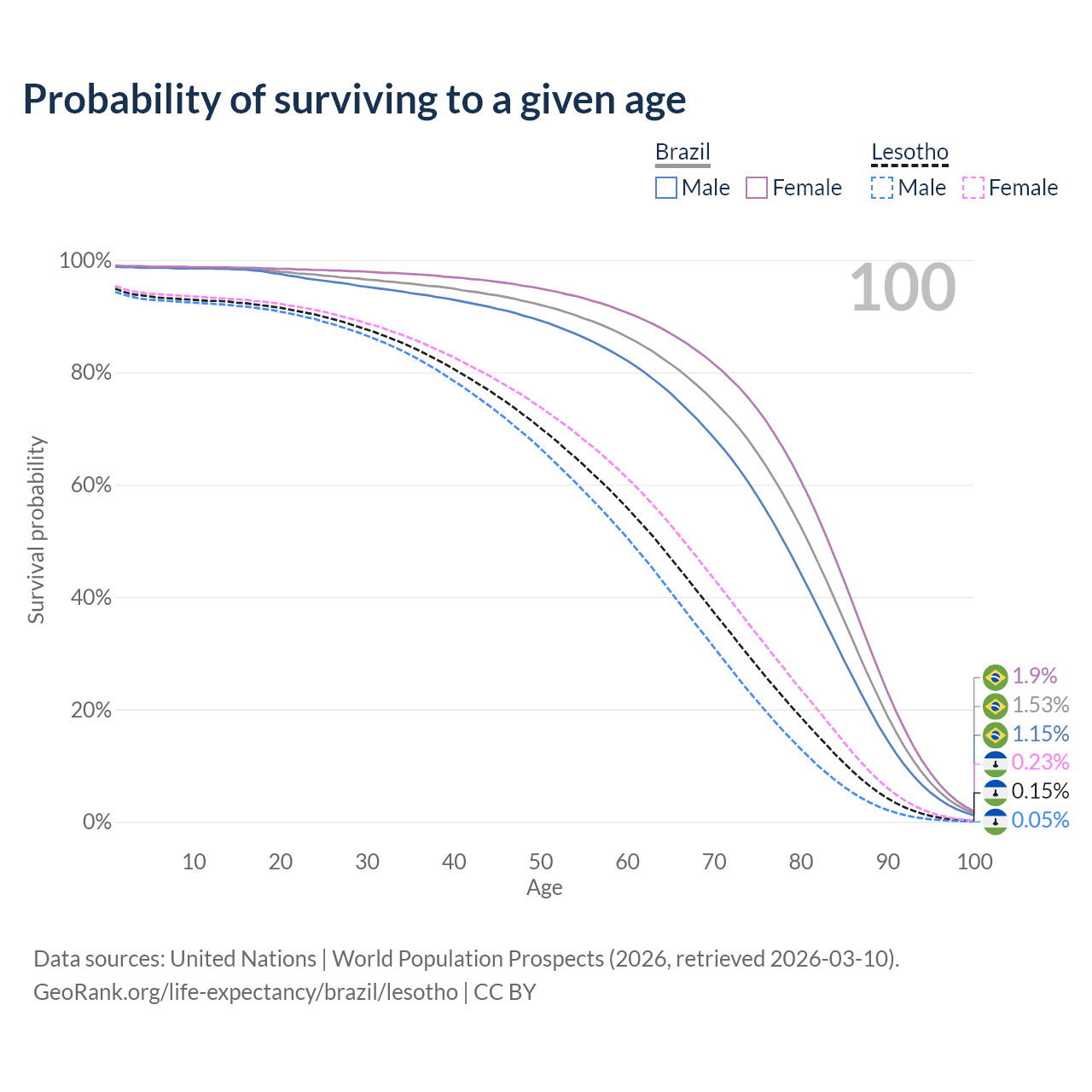 This life expectancy calculator shows the odds of living to 100, 95, 90, and below based on current age for both males and females in Brazil and Lesotho, along with mean and median age of death. The calculations are based on the 2026 life tables (actuarial tables) from the UN World Population Prospects.