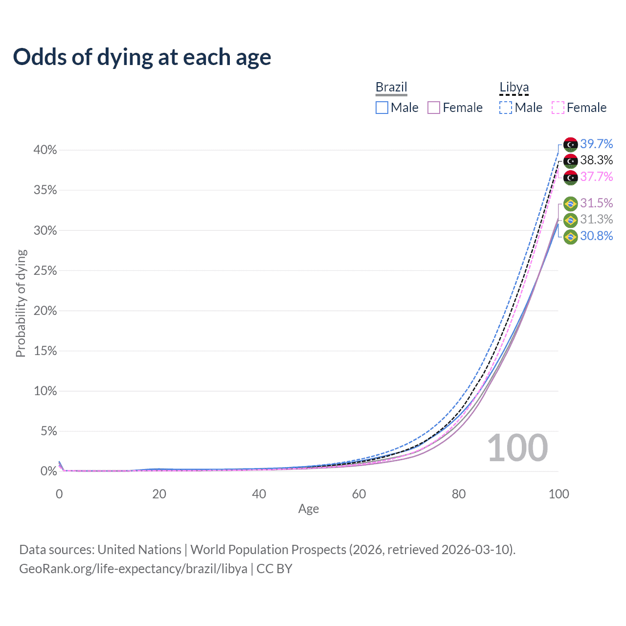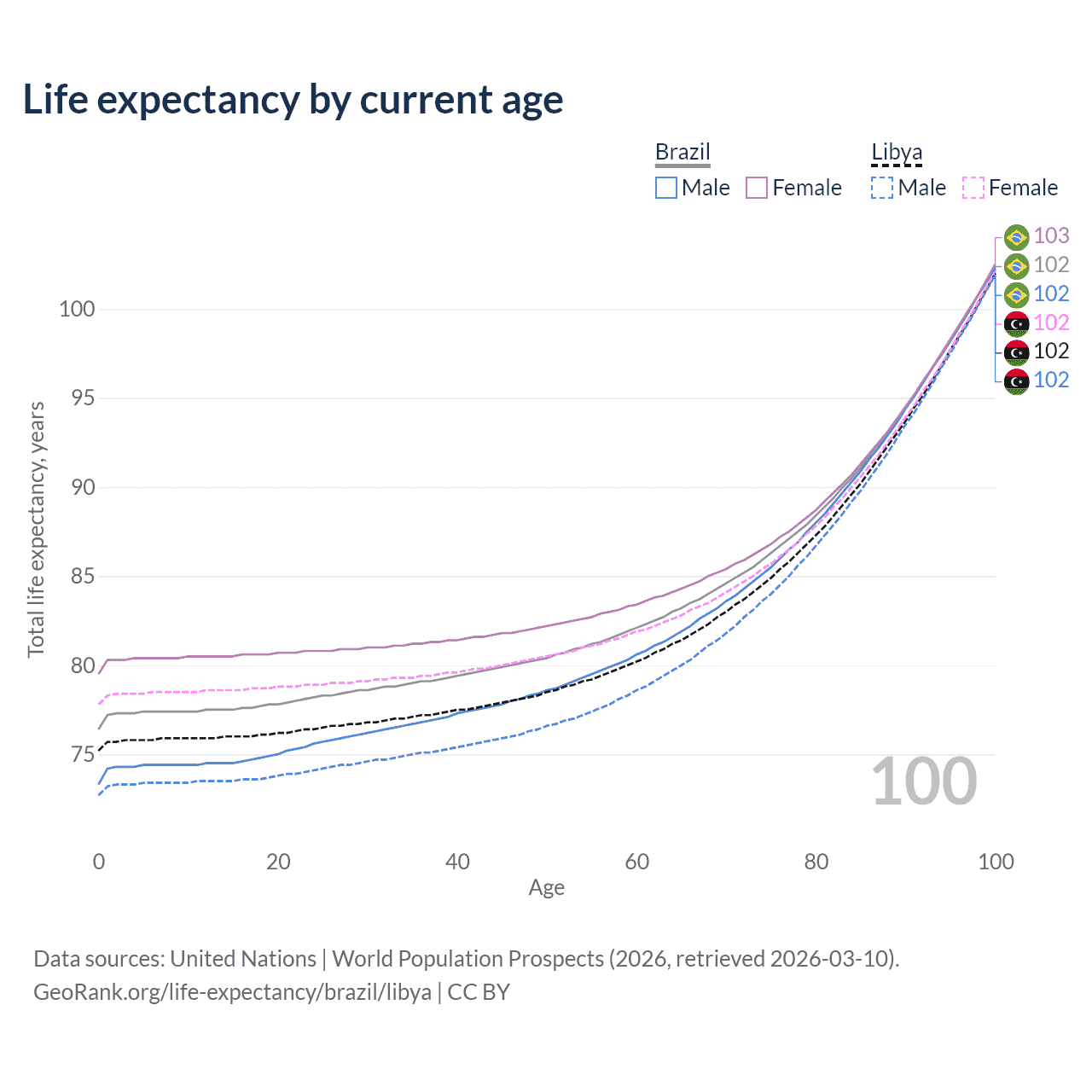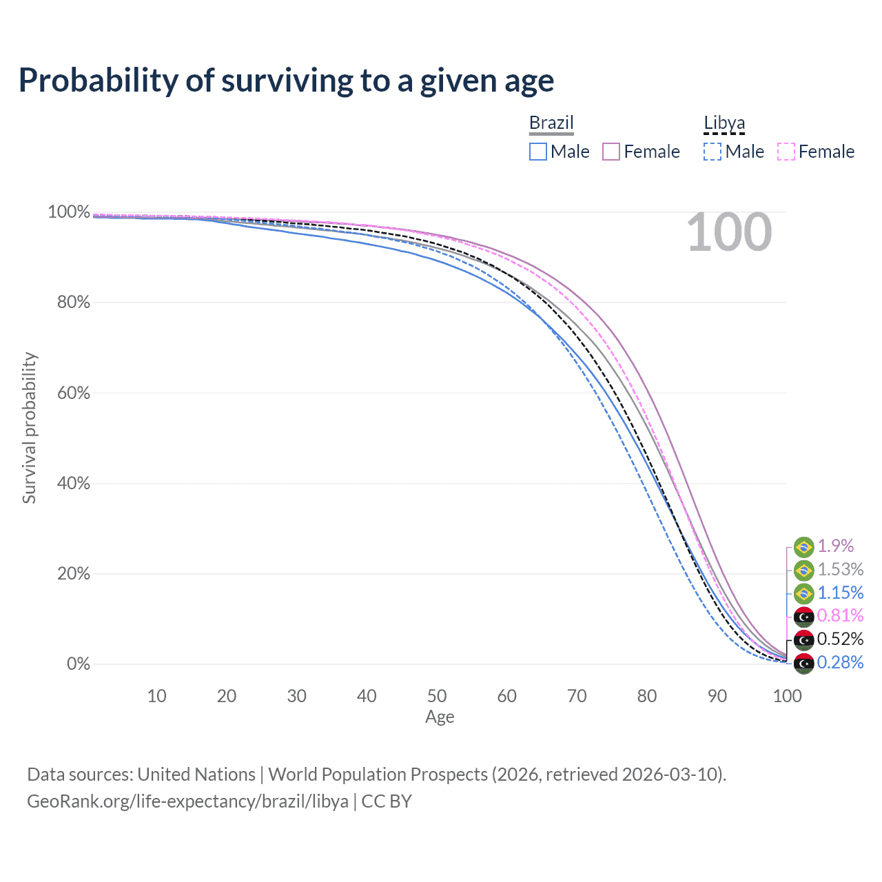 This life expectancy calculator shows the odds of living to 100, 95, 90, and below based on current age for both males and females in Brazil and Libya, along with mean and median age of death. The calculations are based on the 2026 life tables (actuarial tables) from the UN World Population Prospects.