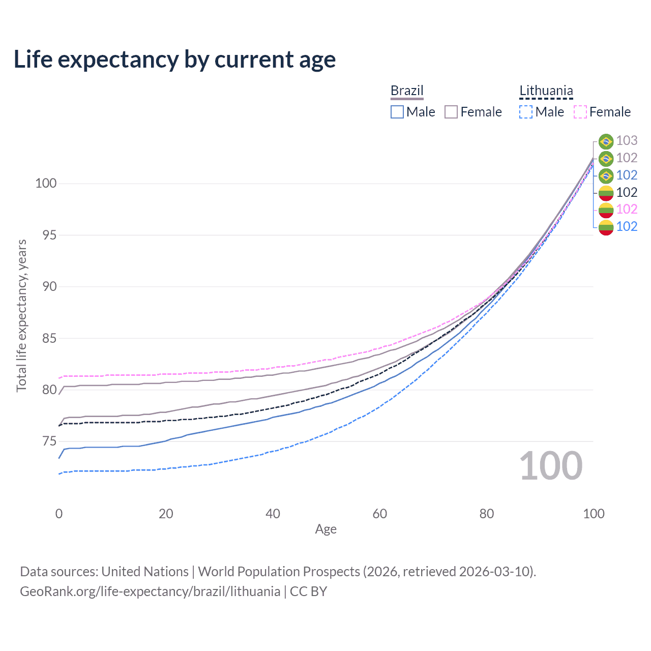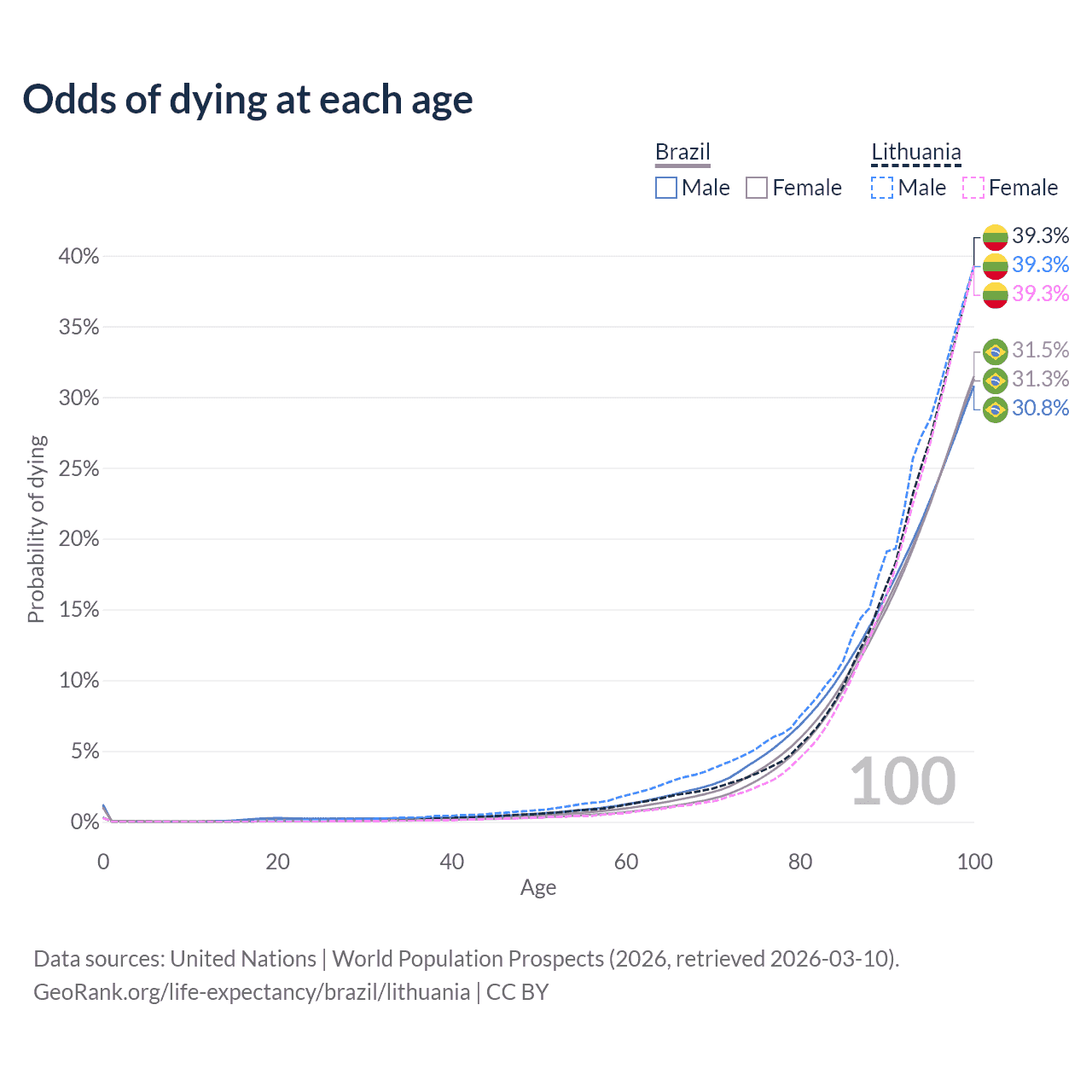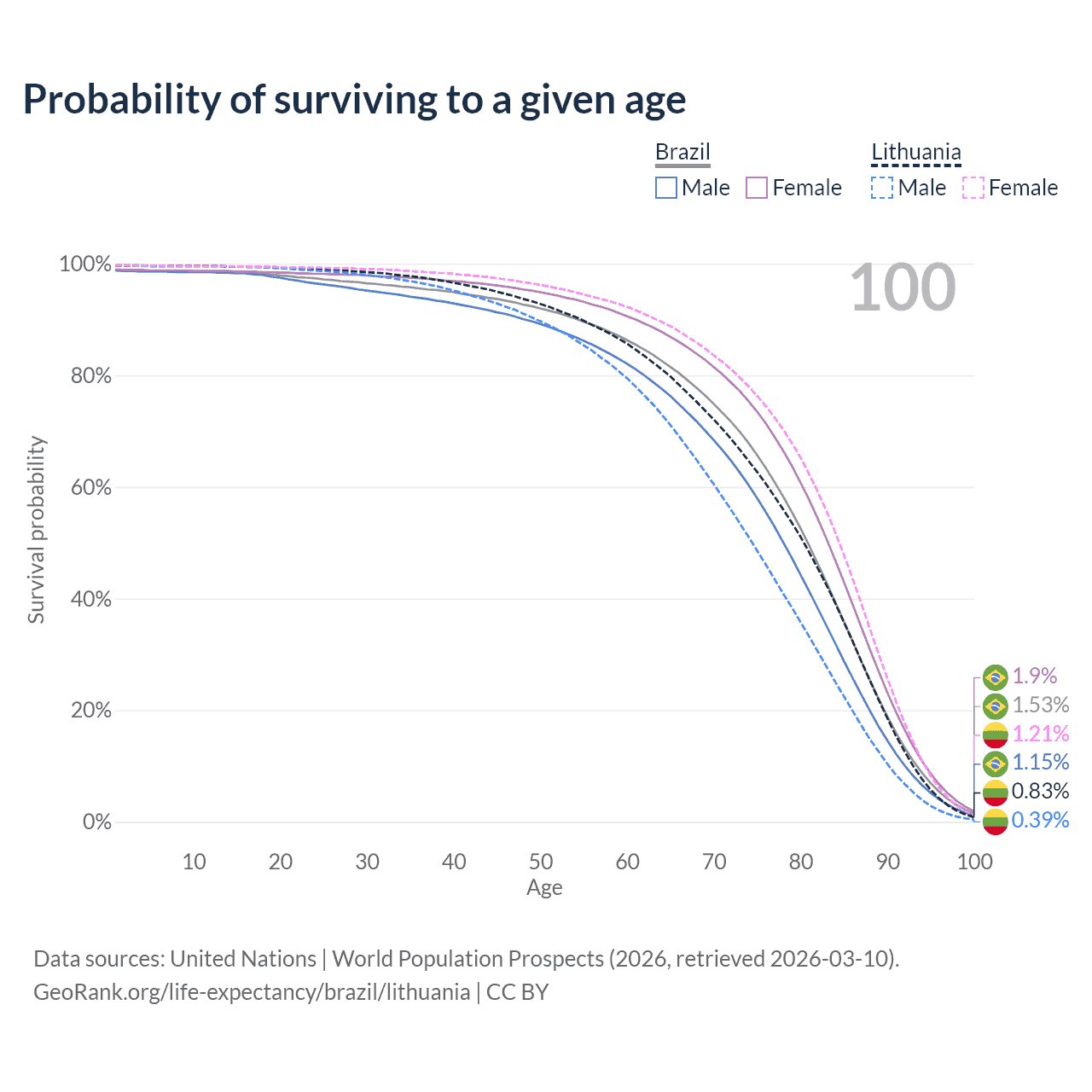 This life expectancy calculator shows the odds of living to 100, 95, 90, and below based on current age for both males and females in Brazil and Lithuania, along with mean and median age of death. The calculations are based on the 2026 life tables (actuarial tables) from the UN World Population Prospects.
