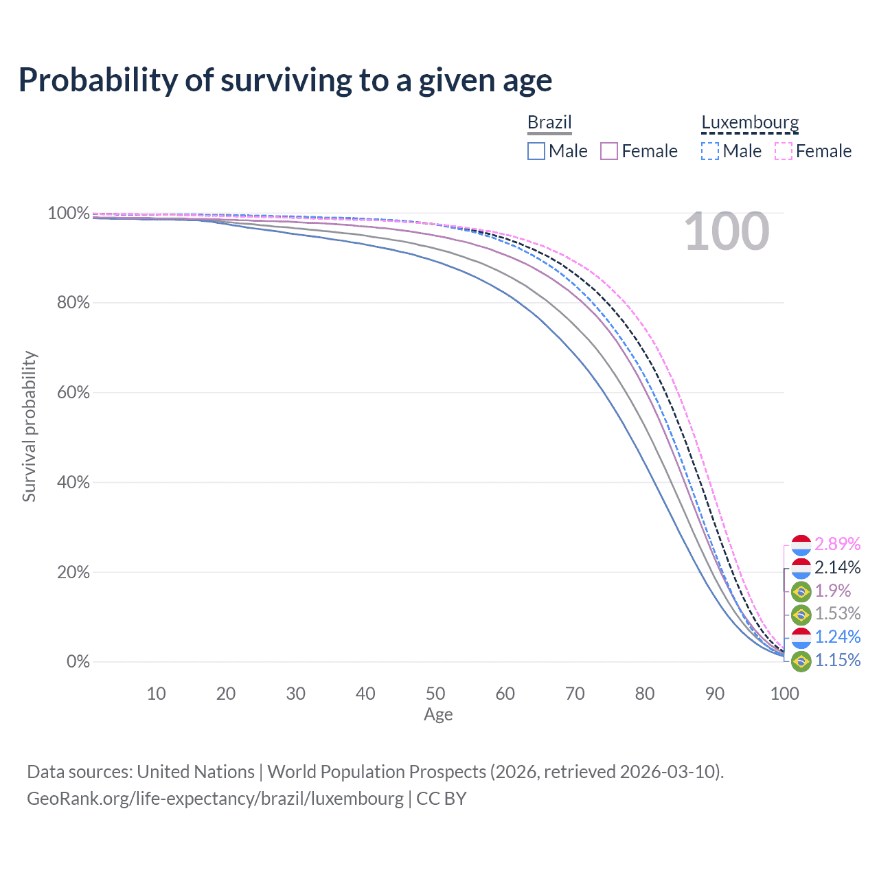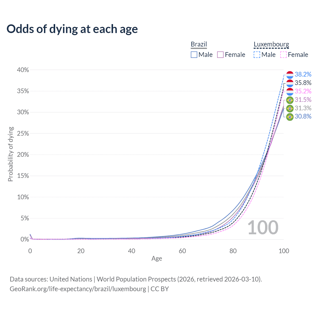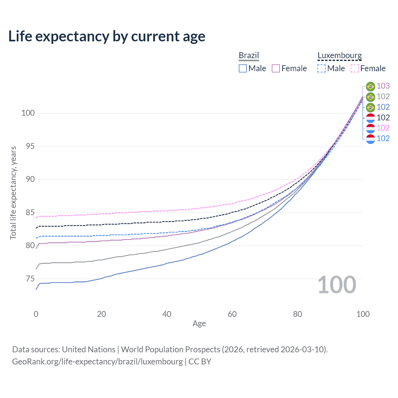 This life expectancy calculator shows the odds of living to 100, 95, 90, and below based on current age for both males and females in Brazil and Luxembourg, along with mean and median age of death. The calculations are based on the 2026 life tables (actuarial tables) from the UN World Population Prospects.
