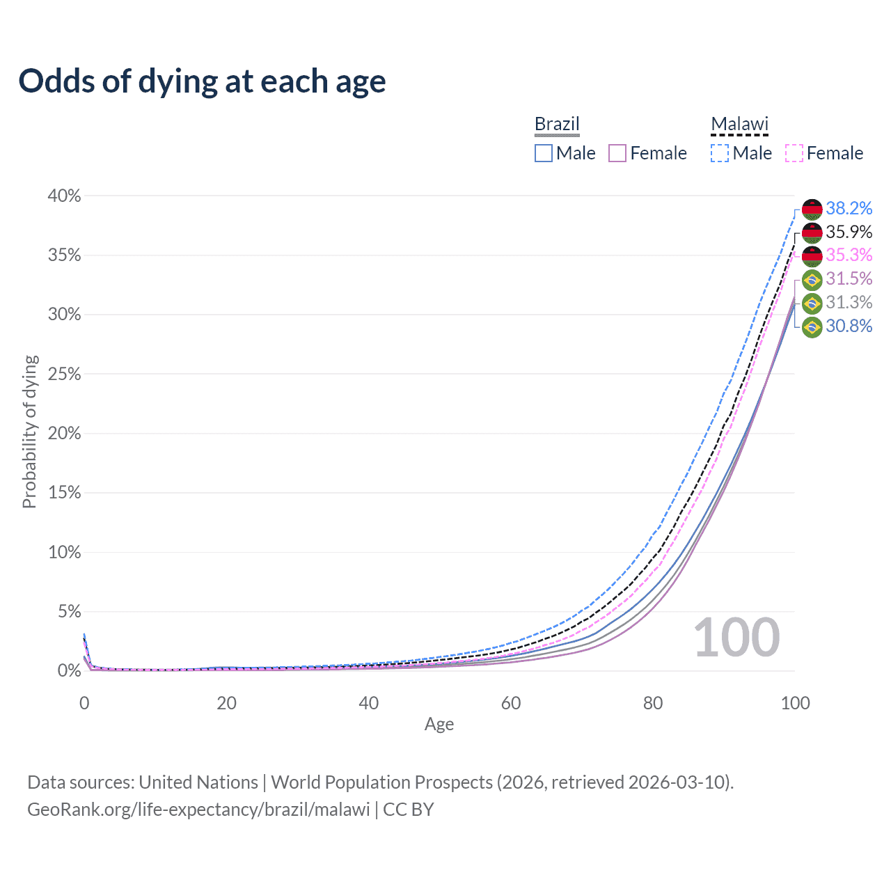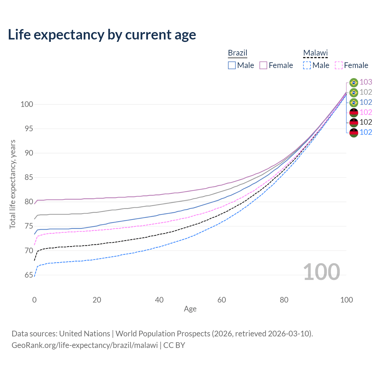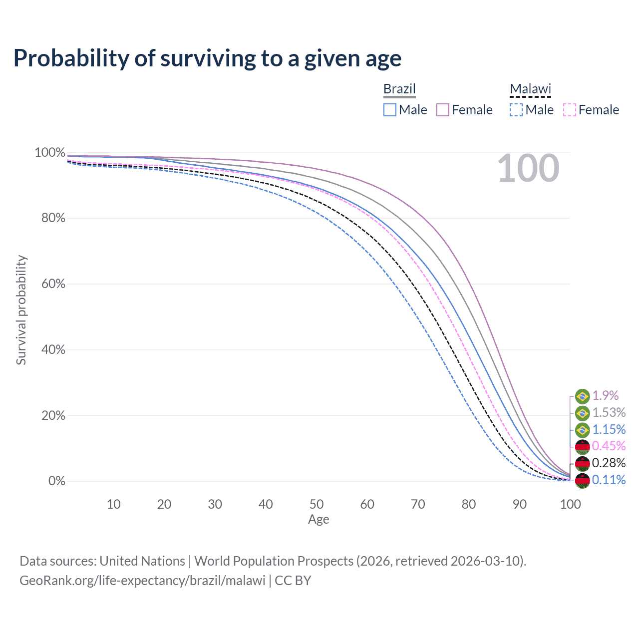 This life expectancy calculator shows the odds of living to 100, 95, 90, and below based on current age for both males and females in Brazil and Malawi, along with mean and median age of death. The calculations are based on the 2026 life tables (actuarial tables) from the UN World Population Prospects.