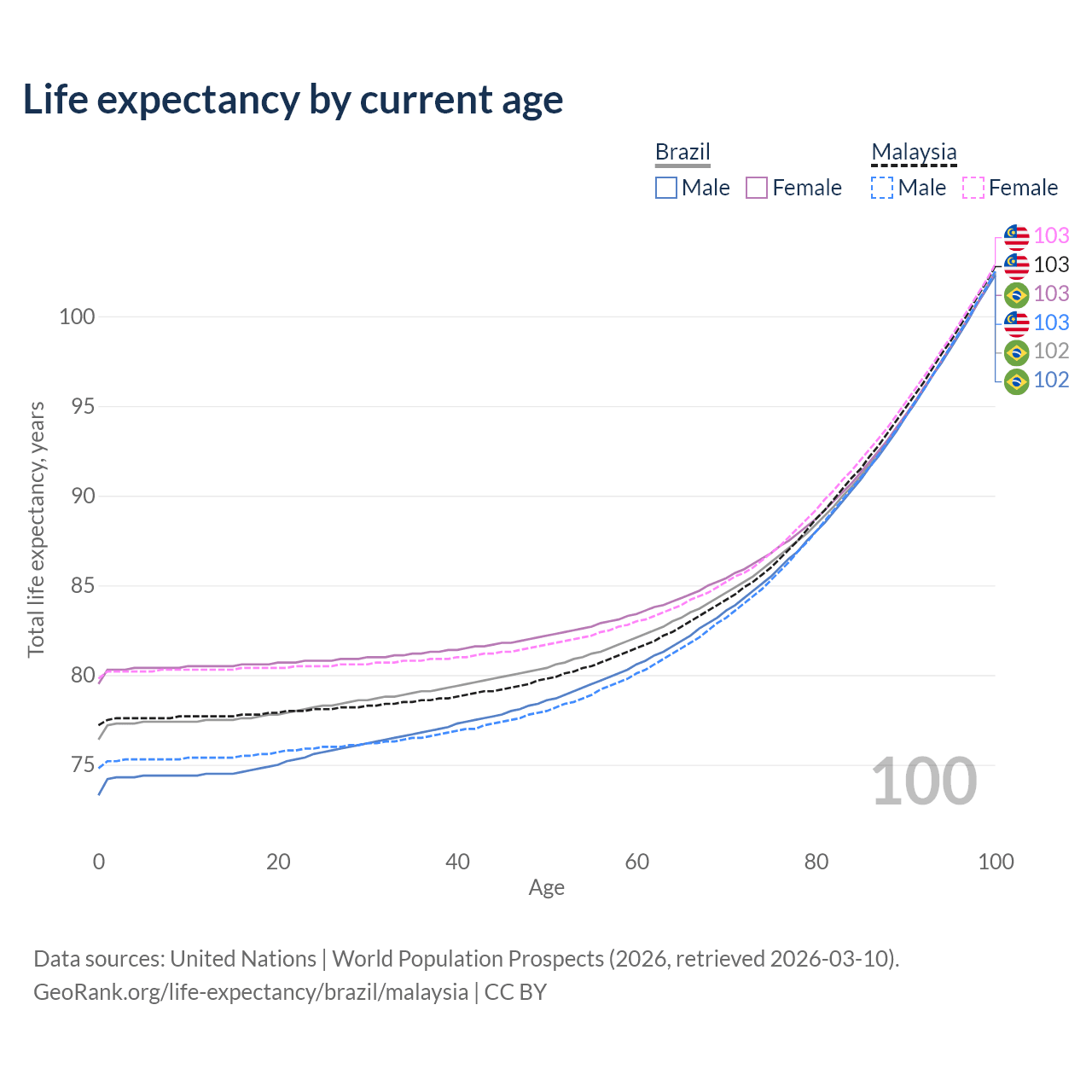 This life expectancy calculator shows the odds of living to 100, 95, 90, and below based on current age for both males and females in Brazil and Malaysia, along with mean and median age of death. The calculations are based on the 2026 life tables (actuarial tables) from the UN World Population Prospects.