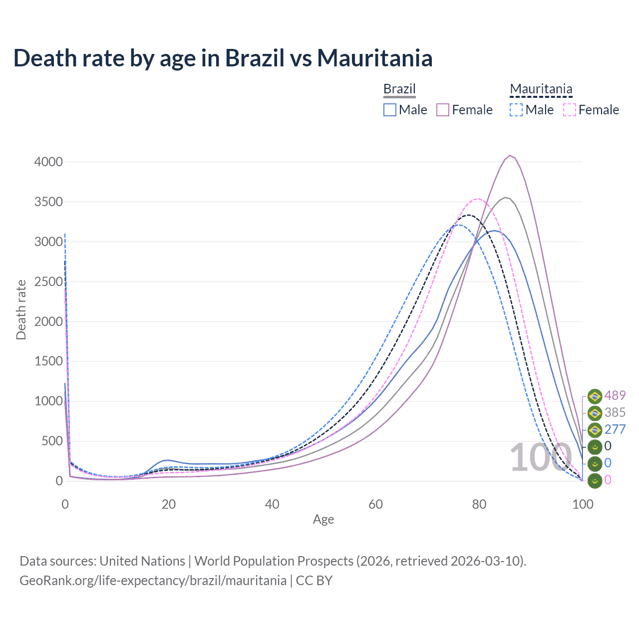In Brazil, the most common age of death is 85, compared to 78 in Mauritania. The median age of death is 80.8 in Brazil and 74.1 in Mauritania, meaning only half of each cohort is expected to live past that age.