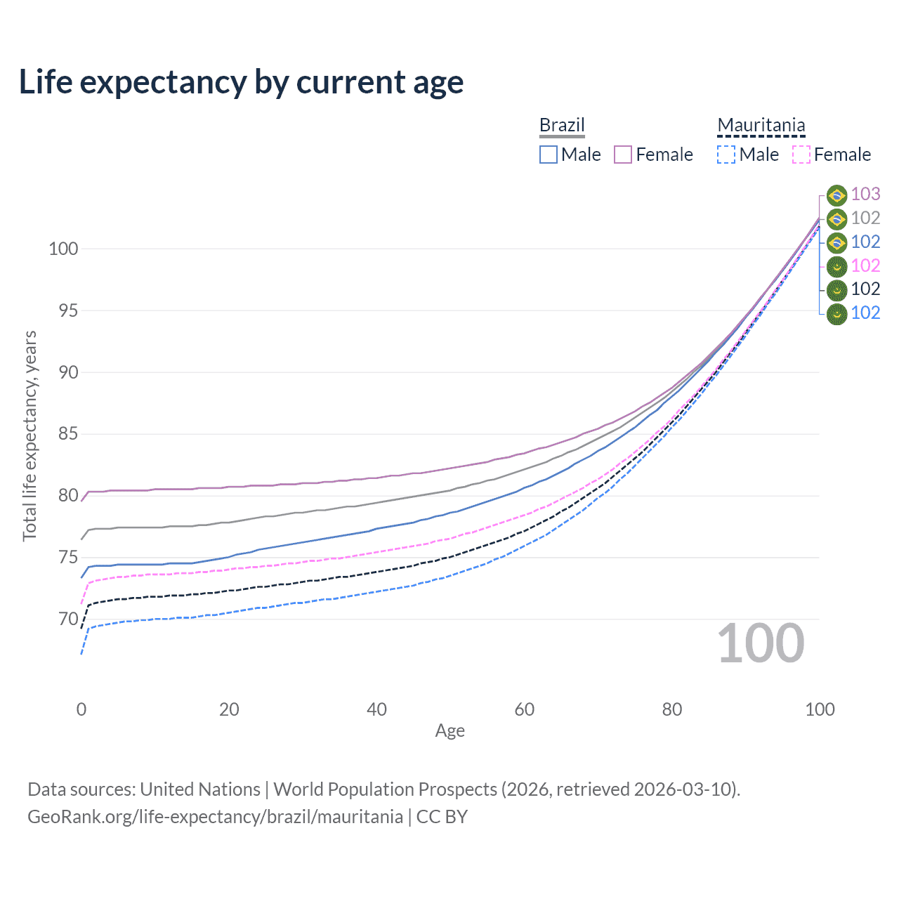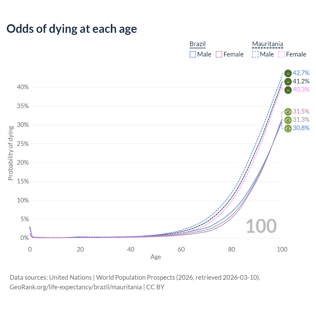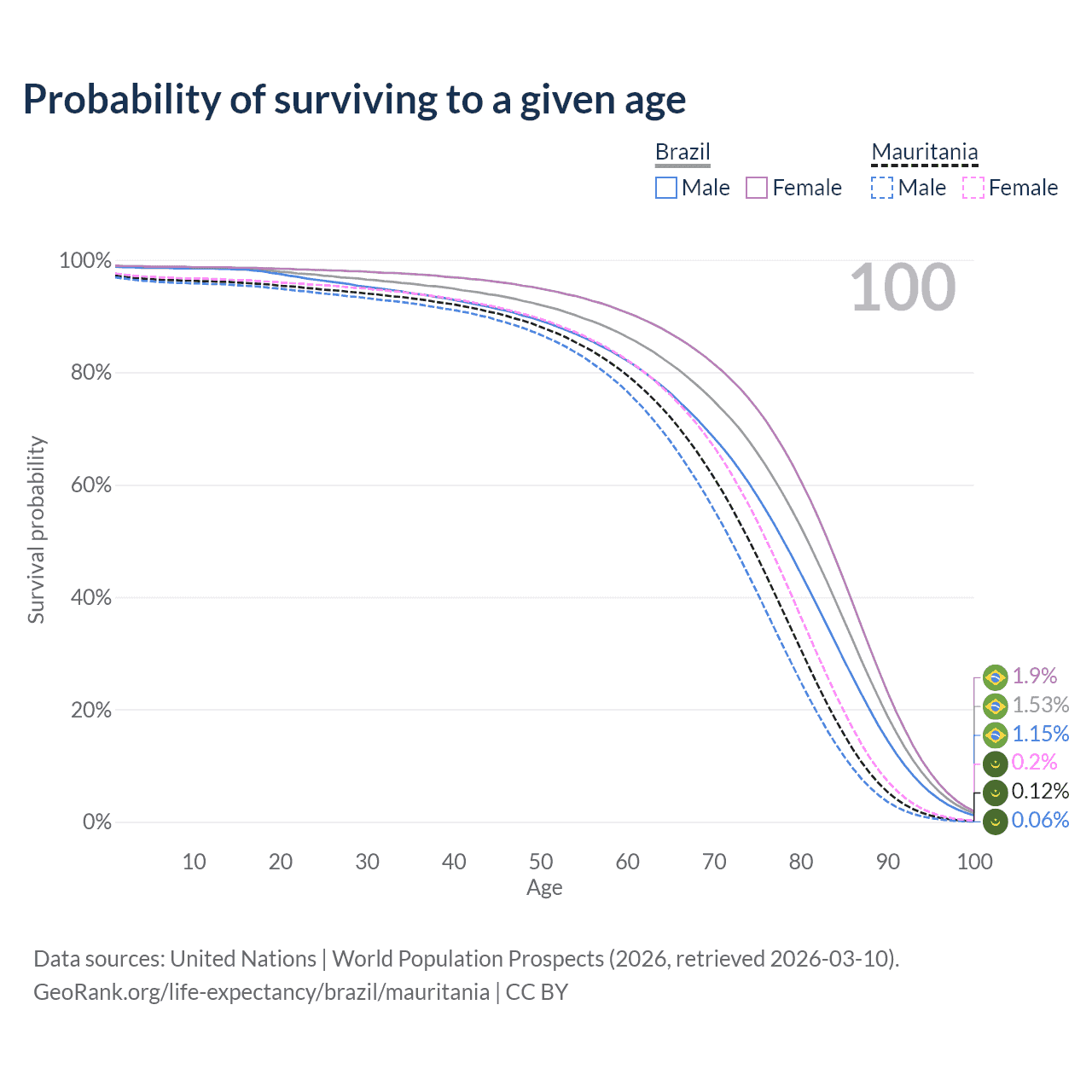 This life expectancy calculator shows the odds of living to 100, 95, 90, and below based on current age for both males and females in Brazil and Mauritania, along with mean and median age of death. The calculations are based on the 2026 life tables (actuarial tables) from the UN World Population Prospects.