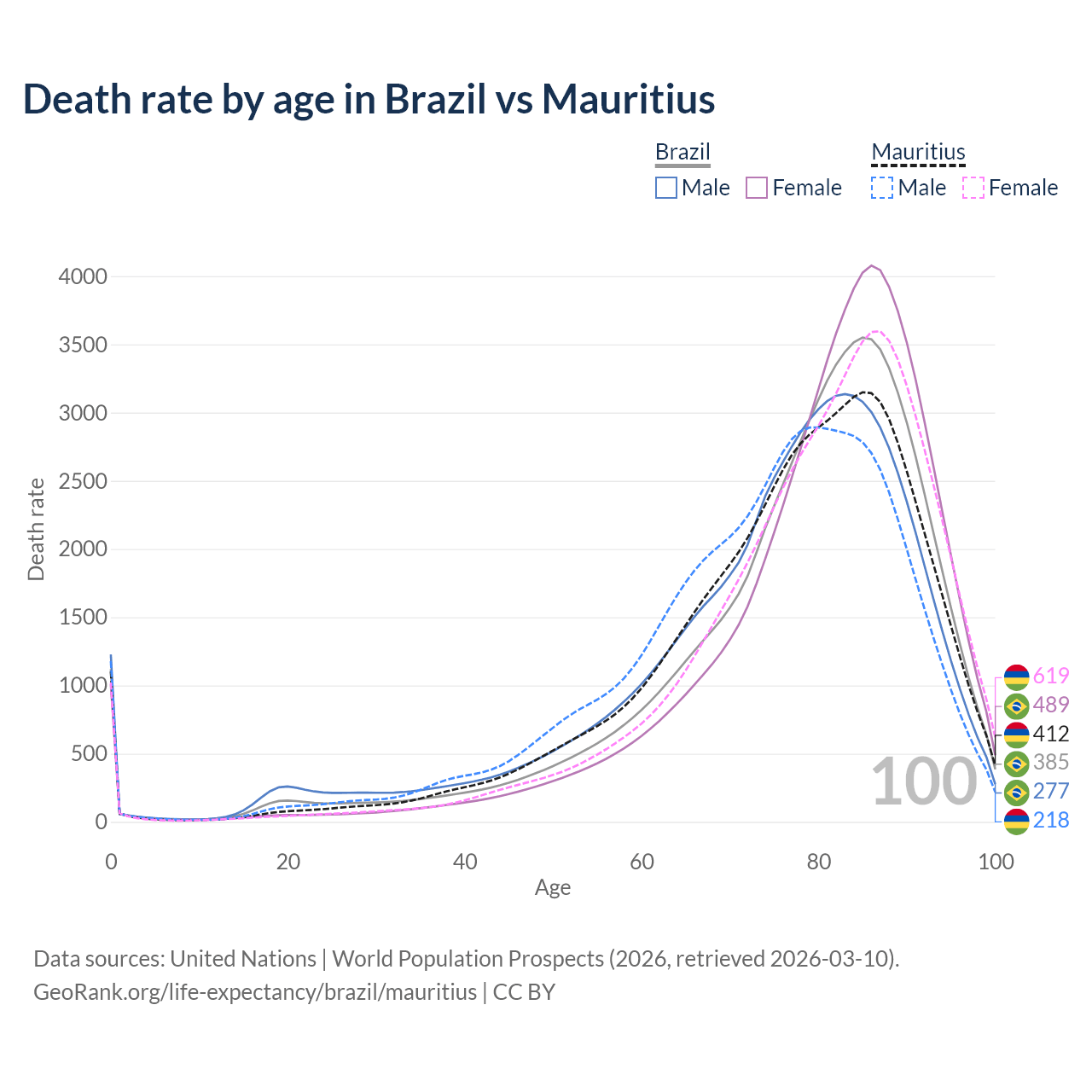 In Brazil, the most common age of death is 85, compared to 85 in Mauritius. The median age of death is 80.8 in Brazil and 79.1 in Mauritius, meaning only half of each cohort is expected to live past that age.