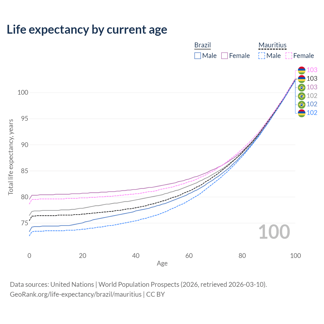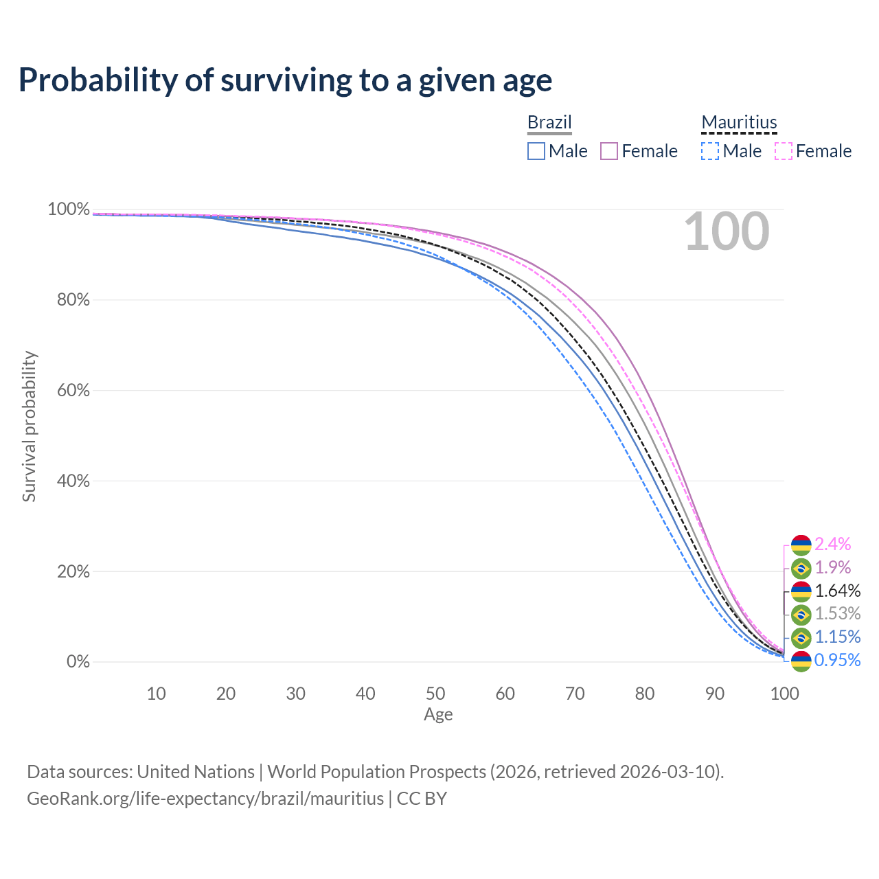This life expectancy calculator shows the odds of living to 100, 95, 90, and below based on current age for both males and females in Brazil and Mauritius, along with mean and median age of death. The calculations are based on the 2026 life tables (actuarial tables) from the UN World Population Prospects.