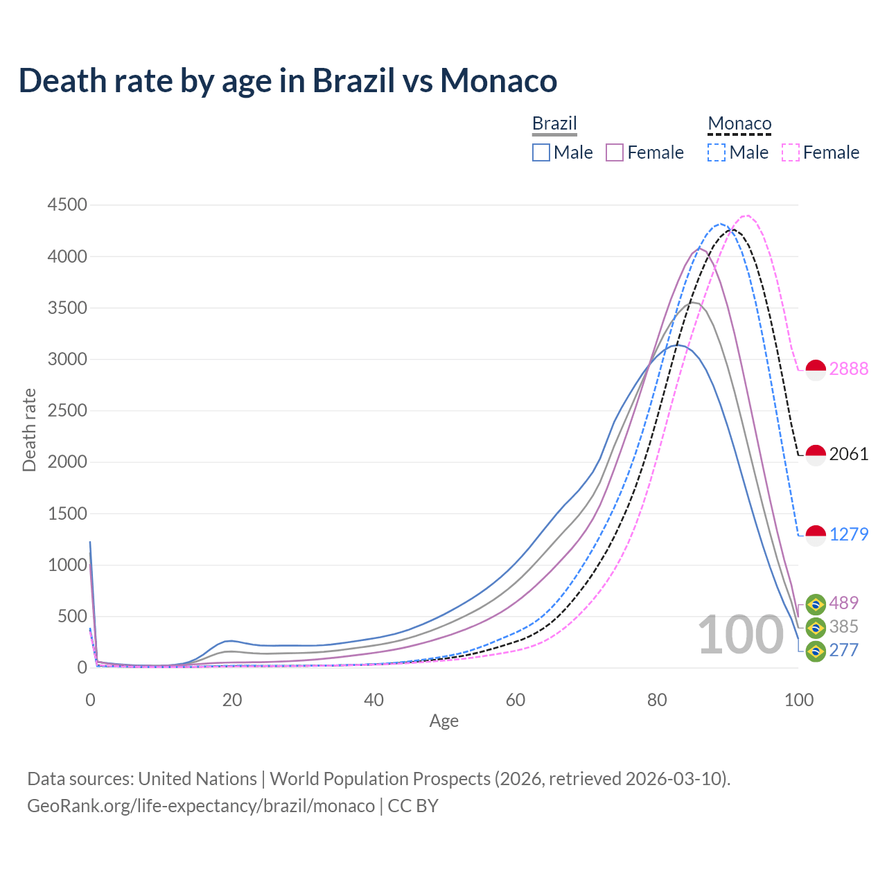 In Brazil, the most common age of death is 85, compared to 91 in Monaco. The median age of death is 80.8 in Brazil and 88.7 in Monaco, meaning only half of each cohort is expected to live past that age.