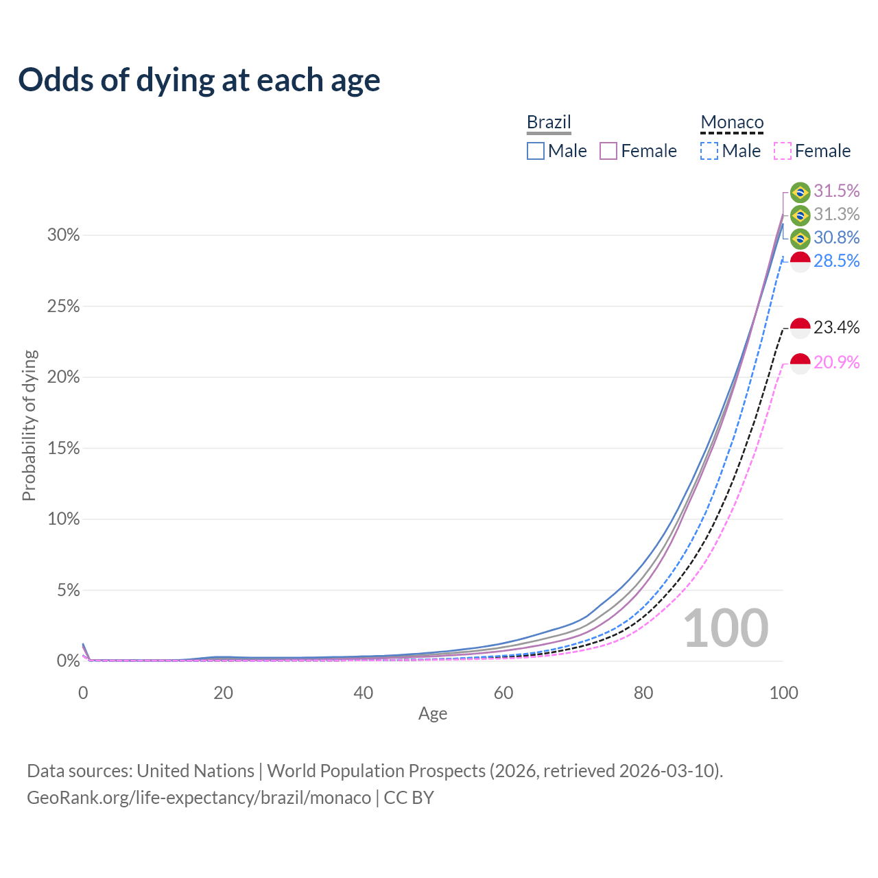 This life expectancy calculator shows the odds of living to 100, 95, 90, and below based on current age for both males and females in Brazil and Monaco, along with mean and median age of death. The calculations are based on the 2026 life tables (actuarial tables) from the UN World Population Prospects.