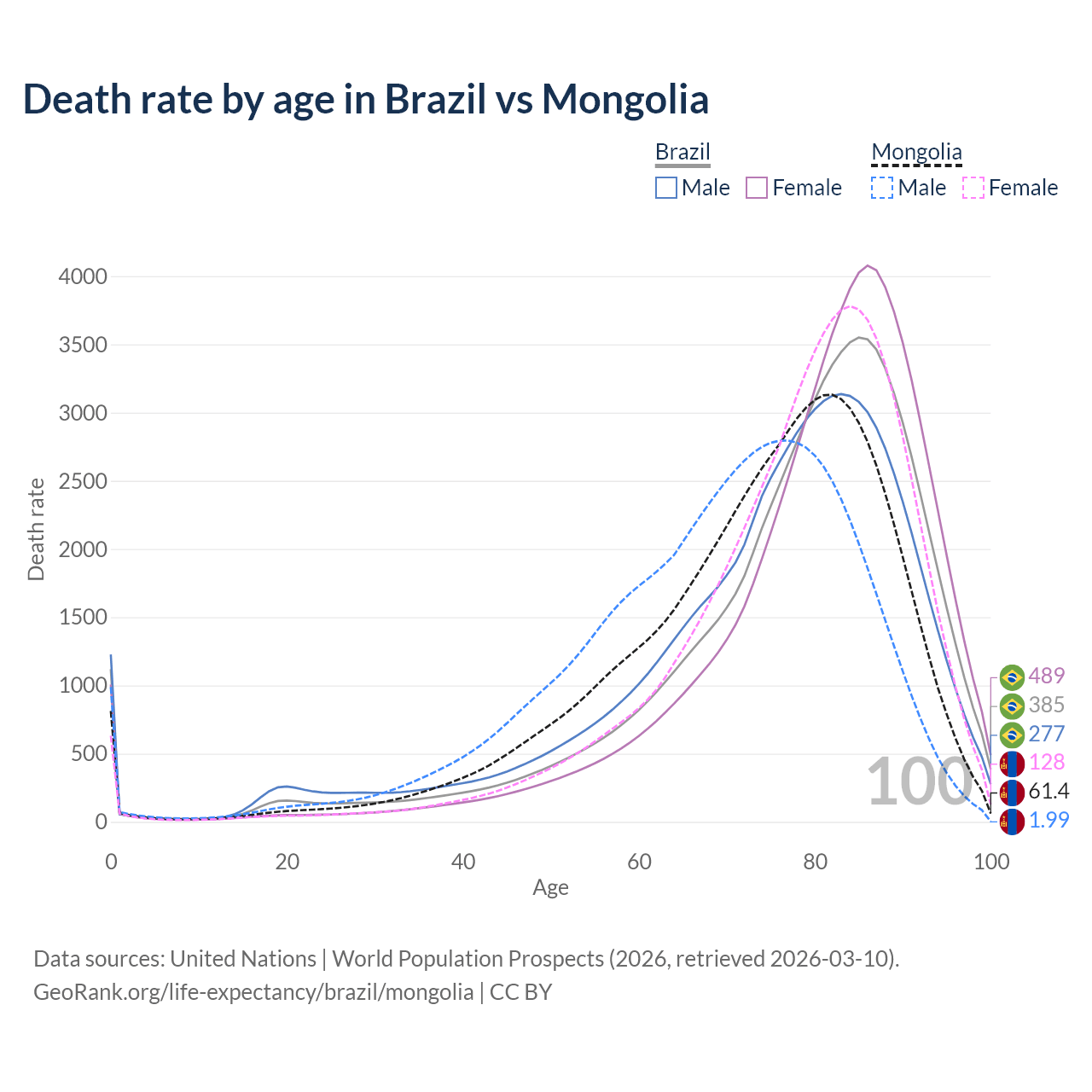 In Brazil, the most common age of death is 85, compared to 82 in Mongolia. The median age of death is 80.8 in Brazil and 76 in Mongolia, meaning only half of each cohort is expected to live past that age.