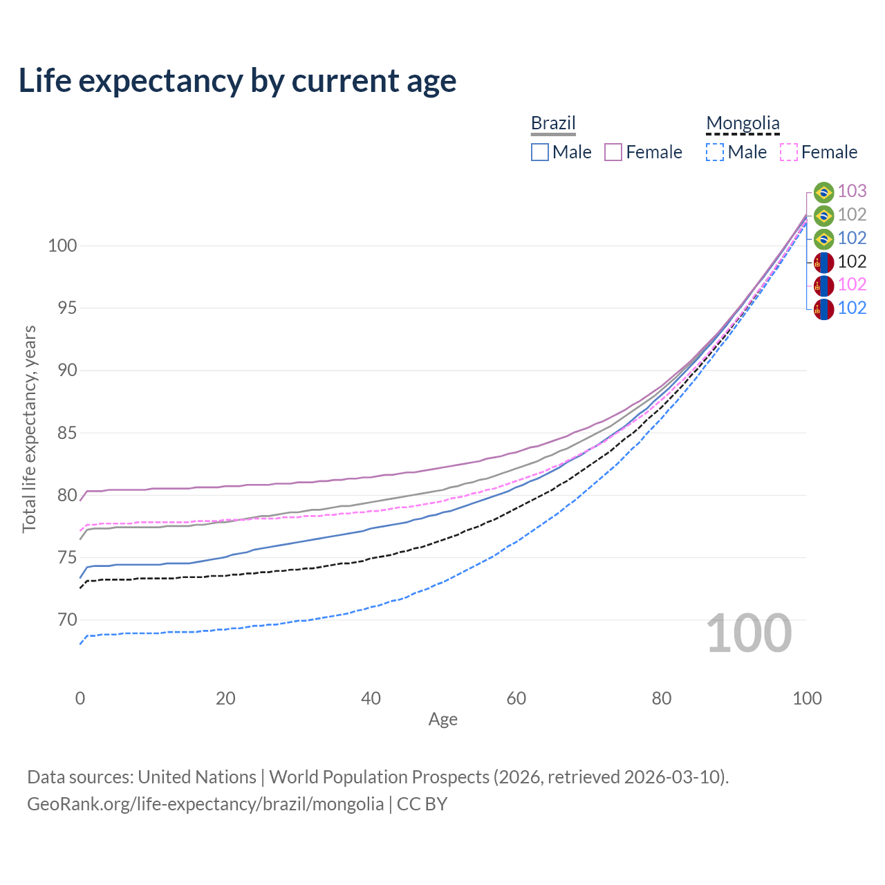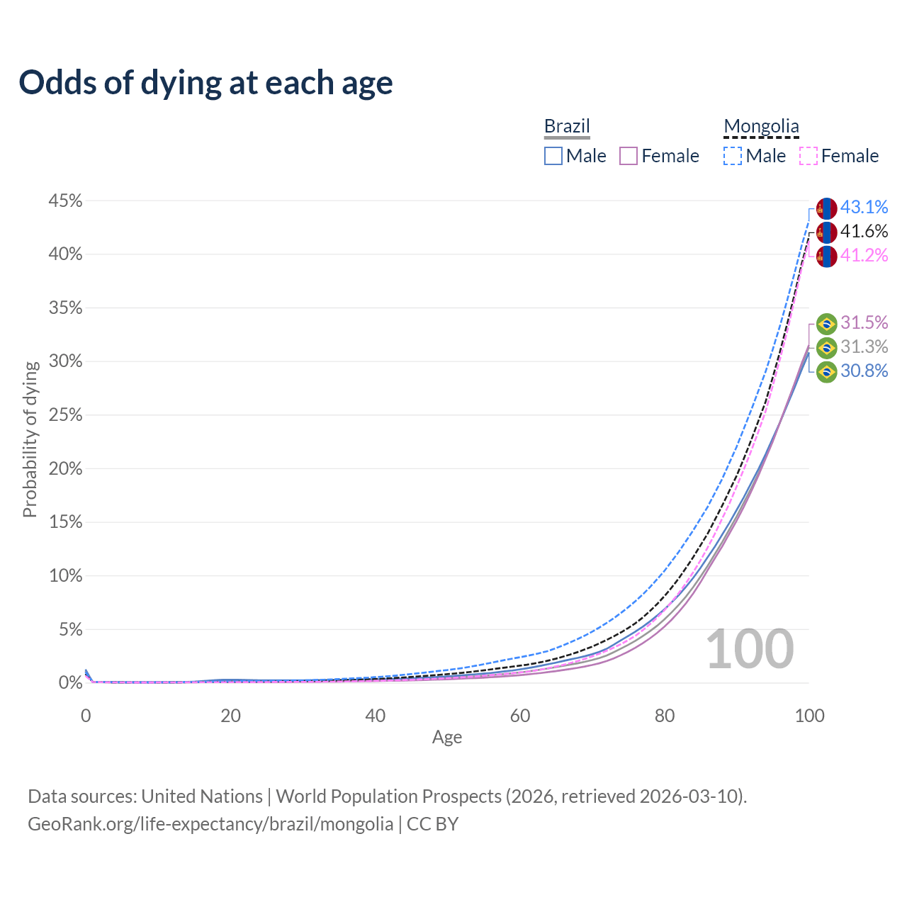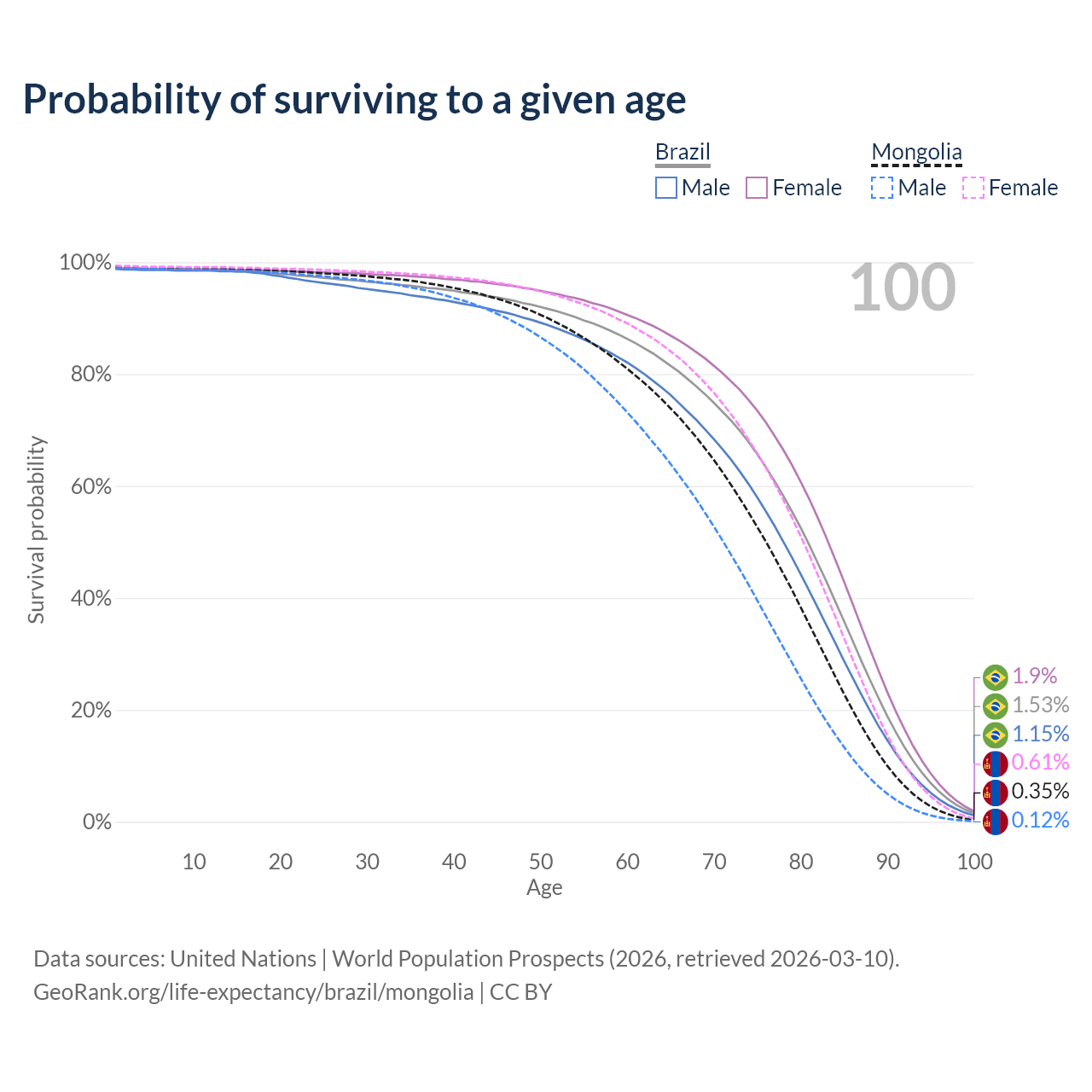 This life expectancy calculator shows the odds of living to 100, 95, 90, and below based on current age for both males and females in Brazil and Mongolia, along with mean and median age of death. The calculations are based on the 2026 life tables (actuarial tables) from the UN World Population Prospects.